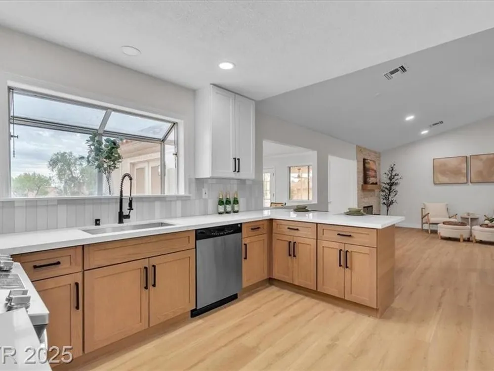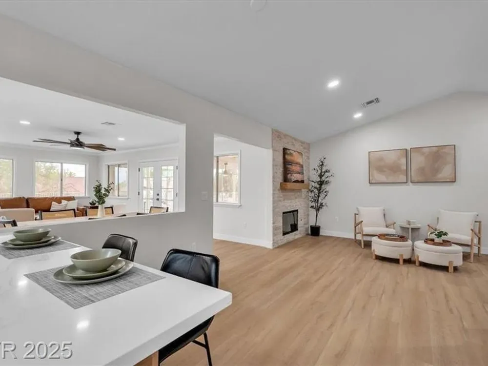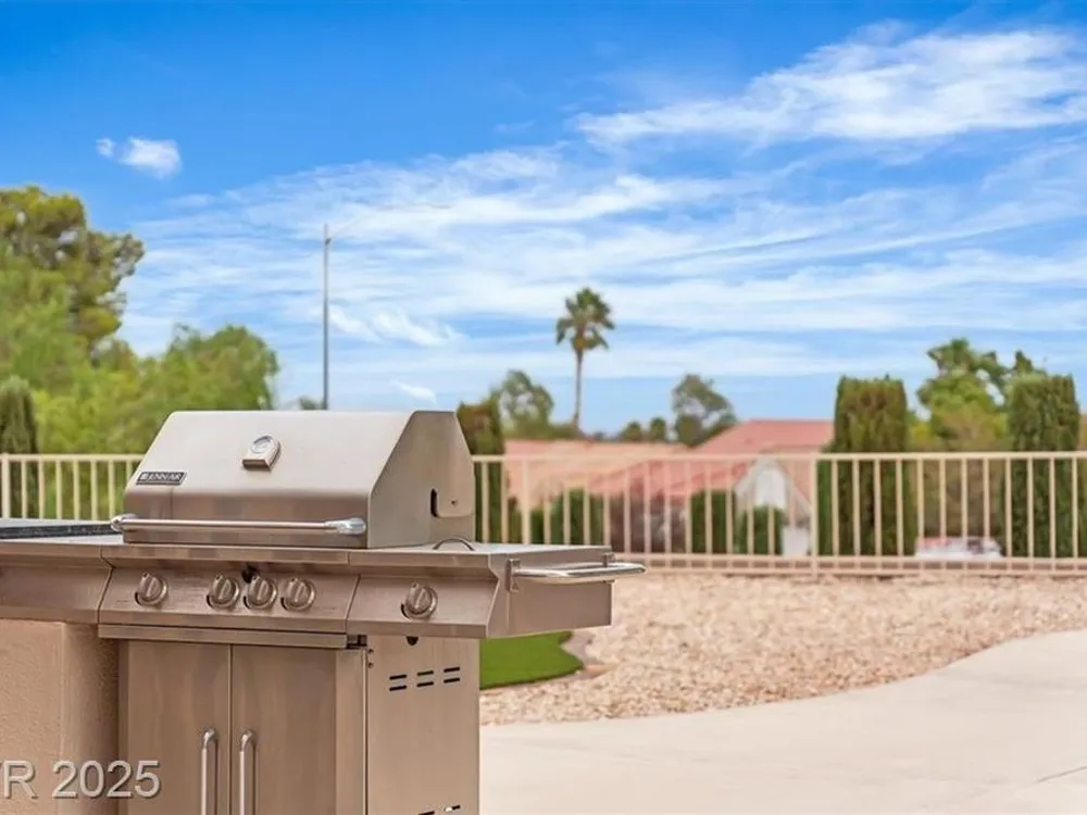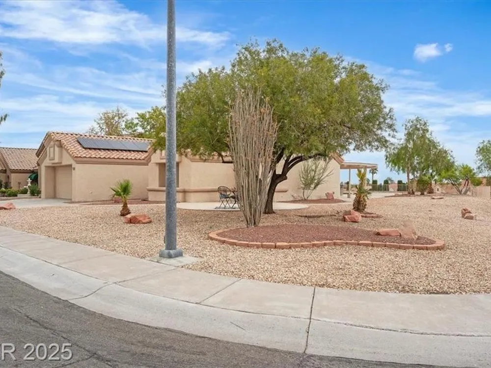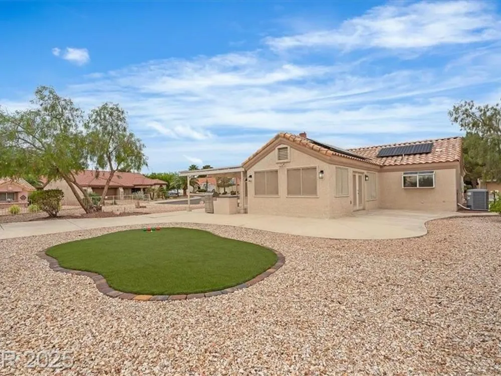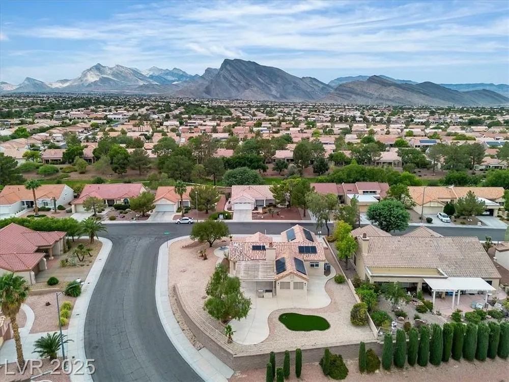 Go green with fully paid SOLAR!! Enjoy relaxing at this fully remodeled single-story home located in the desirable Sun City Summerlin! Nestled on an elevated corner lot with over a quarter-acre of land, you'll enjoy the warm summers and early sunrises overlooking a mountain view. This home has been fully transformed with a blend of modern elegance and simplistic design. The open-concept floor plan features an all-new kitchen with brand new quartz countertops, custom cabinets, stainless steel appliances, and new recessed lighting. The spacious living areas are flooded with natural light elegantly showcasing the new luxury vinyl flooring and makes an ideal space for entertaining or family gatherings. With resort-style features, the primary suite contains a spa-like shower and custom shelving in the walk-in closet. Step into your backyard oasis with built-in cabinet storage and BBQ grill. At last, your driveway is equipped with additional parking for your visitors and extra vehicles.