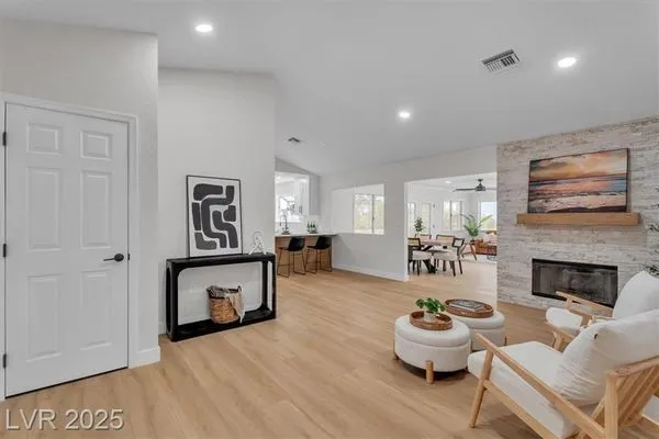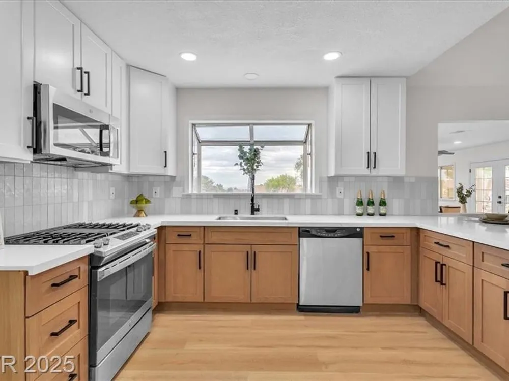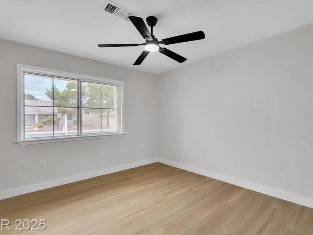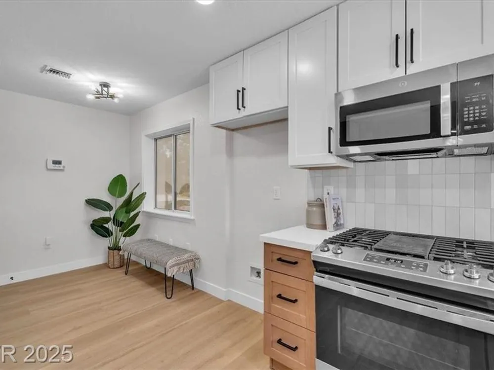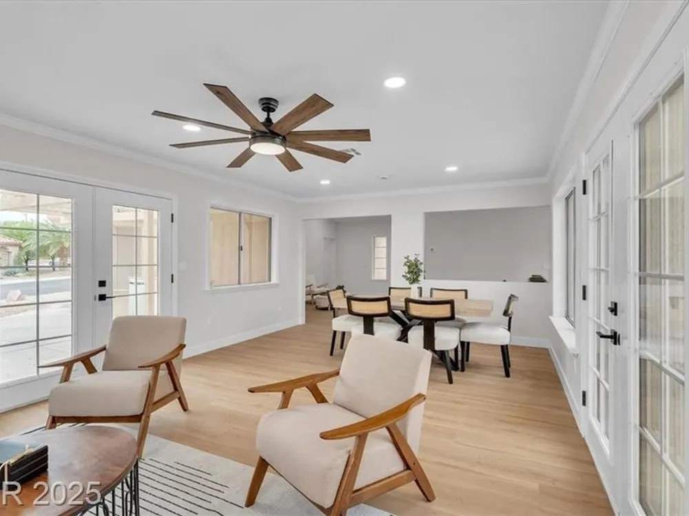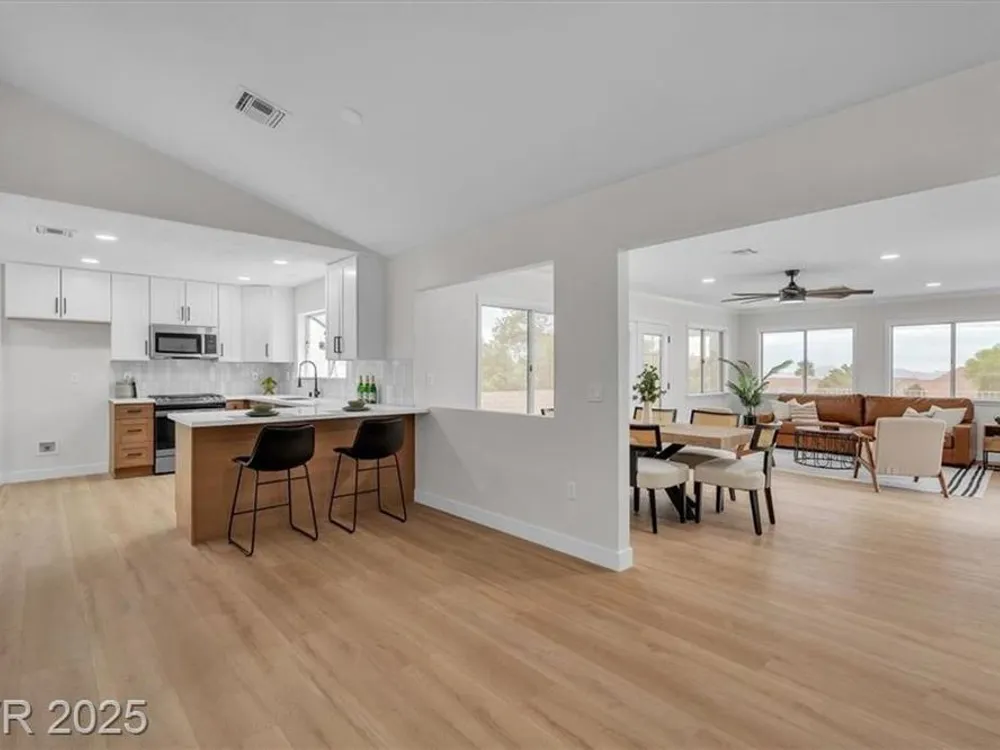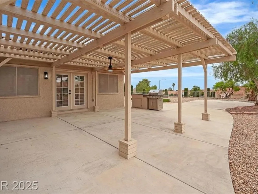 Go green with fully paid SOLAR!! Enjoy relaxing at this fully remodeled single-story home located in the desirable Sun City Summerlin! Nestled on an elevated corner lot with over a quarter-acre of land, you'll enjoy the warm summers and early sunrises overlooking a mountain view. This home has been fully transformed with a blend of modern elegance and simplistic design. The open-concept floor plan features an all-new kitchen with brand new quartz countertops, custom cabinets, stainless steel appliances, and new recessed lighting. The spacious living areas are flooded with natural light elegantly showcasing the new luxury vinyl flooring and makes an ideal space for entertaining or family gatherings. With resort-style features, the primary suite contains a spa-like shower and custom shelving in the walk-in closet. Step into your backyard oasis with built-in cabinet storage and BBQ grill. At last, your driveway is equipped with additional parking for your visitors and extra vehicles.