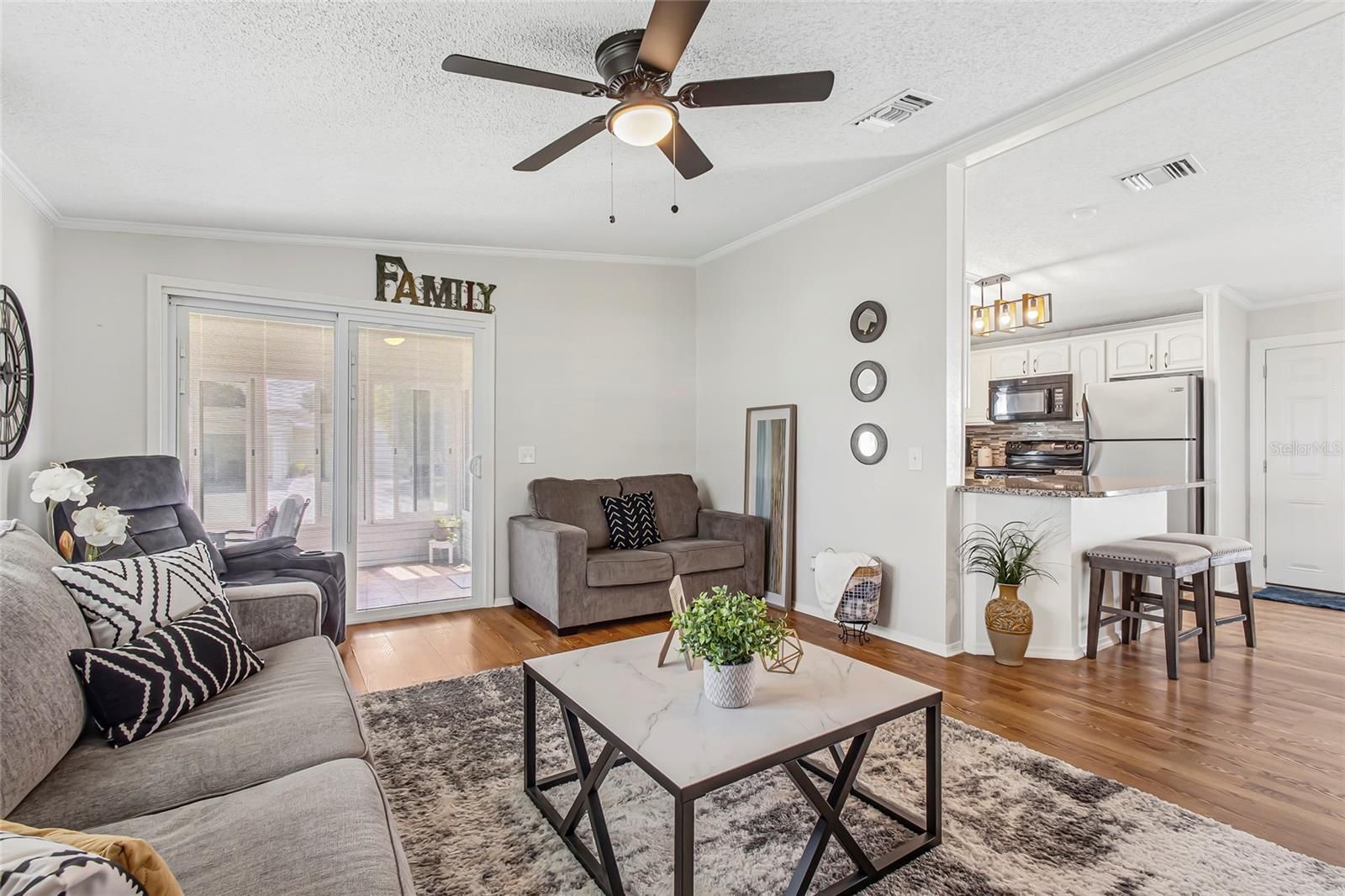 Welcome to this beautifully maintained 2-bedroom, 2-bath home located on a landscaped, oversized corner lot, one of the largest in the area, in the desirable 55+ community of The Plantation. This move-in ready home offers over 1,200 sq. ft. of living space, including a bright 20x10 three-season enclosed porch perfect for relaxing and enjoying the Florida sunshine. Inside, you'll find vaulted ceilings and an open living and dining area with sliders to the porch. The kitchen features high-quality cabinets in excellent condition, which have been professionally painted for a fresh, modern feel. It also boasts well-maintained countertops, appliances, and a breakfast bar. Both bathrooms have been tastefully updated, and the home boasts laminate and tile flooring throughout. The spacious primary suite includes a walk-in closet and a walk-in shower. Additional highlights include a 25x24 oversized two-car garage with electric opener, washer and dryer hookups, and a workbench, as well as tie-downs in place, a roof replaced in 2018, and an AC system replaced in 2016. The yard is beautifully landscaped and equipped with a sprinkler system. Live the good life with access to The Plantation’s top-notch amenities, including pools, golf, fitness centers, and more, plus you're steps away from the neighborhood pool and mail center. Don’t miss this opportunity to own a bright, beautifully updated home in a vibrant and active community!
