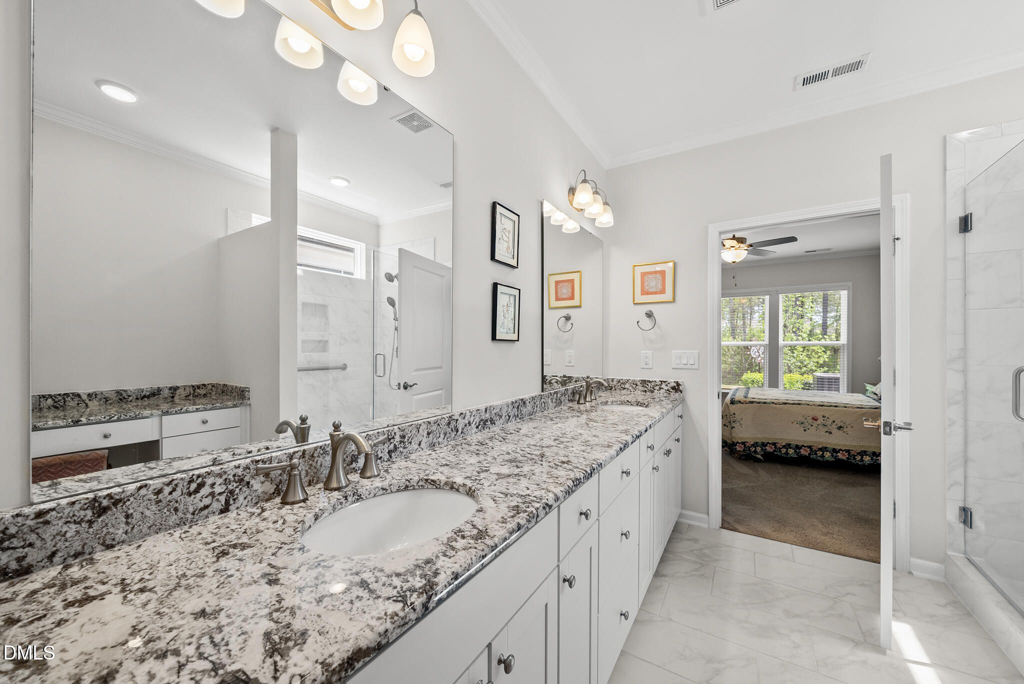 - Pantry, Ceiling Fan(s), Double Vanity, Eat-in Kitchen, Entrance Foyer, Granite Counters, Kitchen Island, Open Floorplan, Master Downstairs, Recessed Lighting, Separate Shower, Walk-In Closet(s), Walk-In Shower, Water Closet(s)