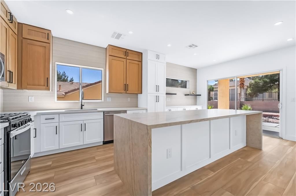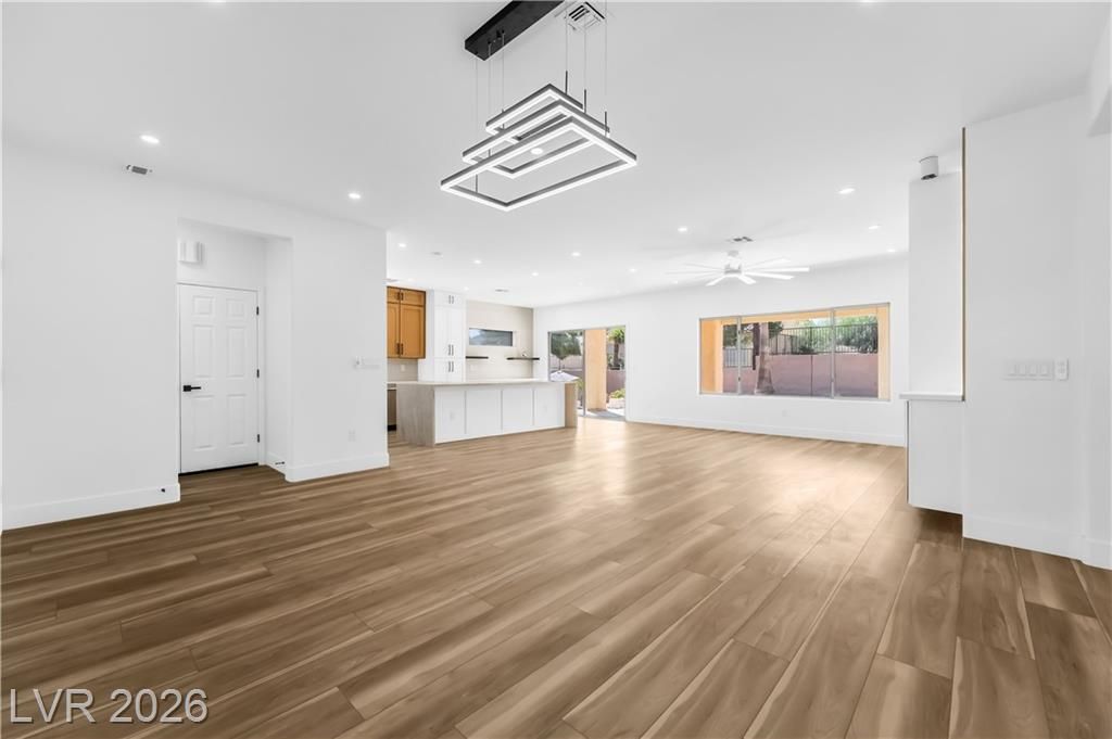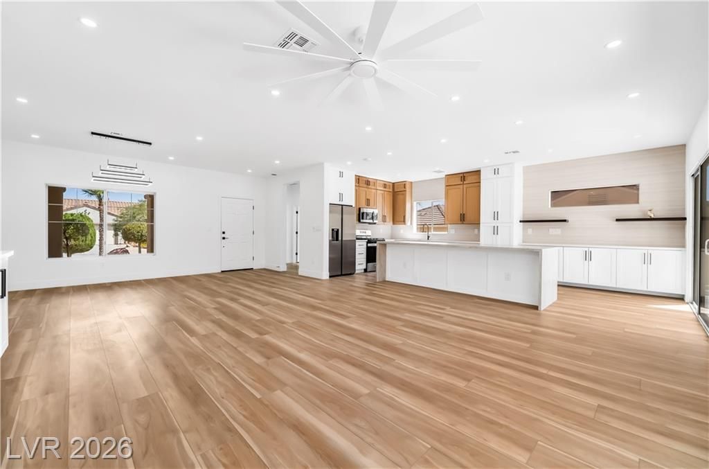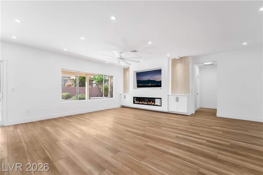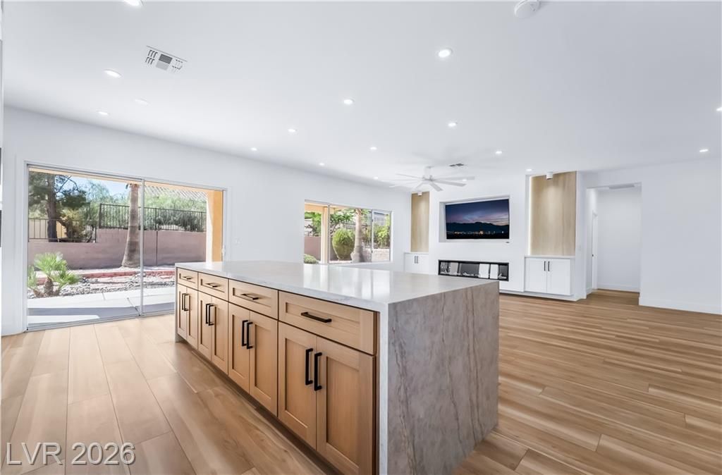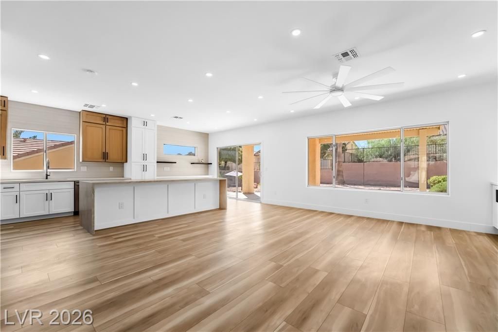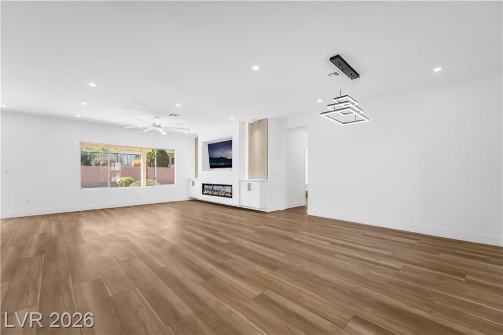 Experience this Immaculate Remodeled Single-Story in the heart of Sun City Anthem. Step inside to an airy, Open-Concept layout defined by seamless Luxury Vinyl Plank flooring. The Living Room draws you in with a custom Accent Wall featuring a built-in Electric Fireplace and brand-new 75” Smart TV. Transition into the showstopper Kitchen, boasting American-Made double-stacked cabinetry, Stainless Steel appliances, and a breathtaking dual-waterfall Taj Mahal Quartz island.Meticulous upgrades shine throughout, including High-End 75” Fans, American-Made Faucets, and a Separated Bedroom layout for ultimate privacy. Outside, enjoy tranquil mornings in a Beautifully Landscaped desert yard with Palms and Shrubs. Live the unrivaled Sun City Anthem lifestyle with access to Three World-Class Clubhouses, Resort Pools, Fitness Centers, Pickleball, and the premier Revere Golf Club. This home isn’t just a must-see—it’s a must-have.