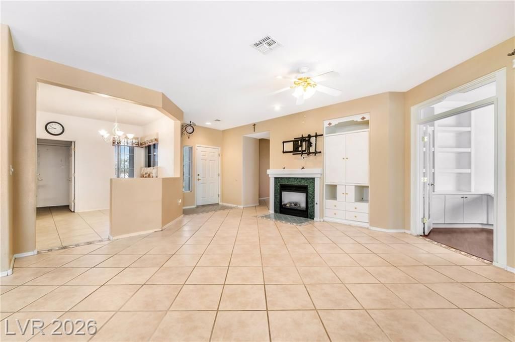 Amazing opportunity in Sun City Anthem's 55+ community for less than market value! Rare Patriot floorplan w/options not found in other models. This highly upgraded home features an optional front courtyard, an expanded patio w/a pergola, & floor-to-ceiling built-in cabinets in the living room, den, & office. Remodeled kitchen w/island & high-end stainless steel appliances. State-of-the-art refrigerator, plus additional refrigerator & full-size stand-up freezer in butler's pantry w/floor-to-ceiling cabinets. Custom trim tile throughout, including entry & fireplace. Spacious primary bath offers garden tub, dual sinks, & walk-in shower. Fireplace inside & firepit outside. Washer/dryer (recently replaced), & whole-house water softener. Prewired for alarm system if desired, & includes motion detectors at all entry doors. Private desert oasis backyard completely enclosed by six-foot stone wall. Unique home that has been lovingly owner-occupied by its original owner in a great community.