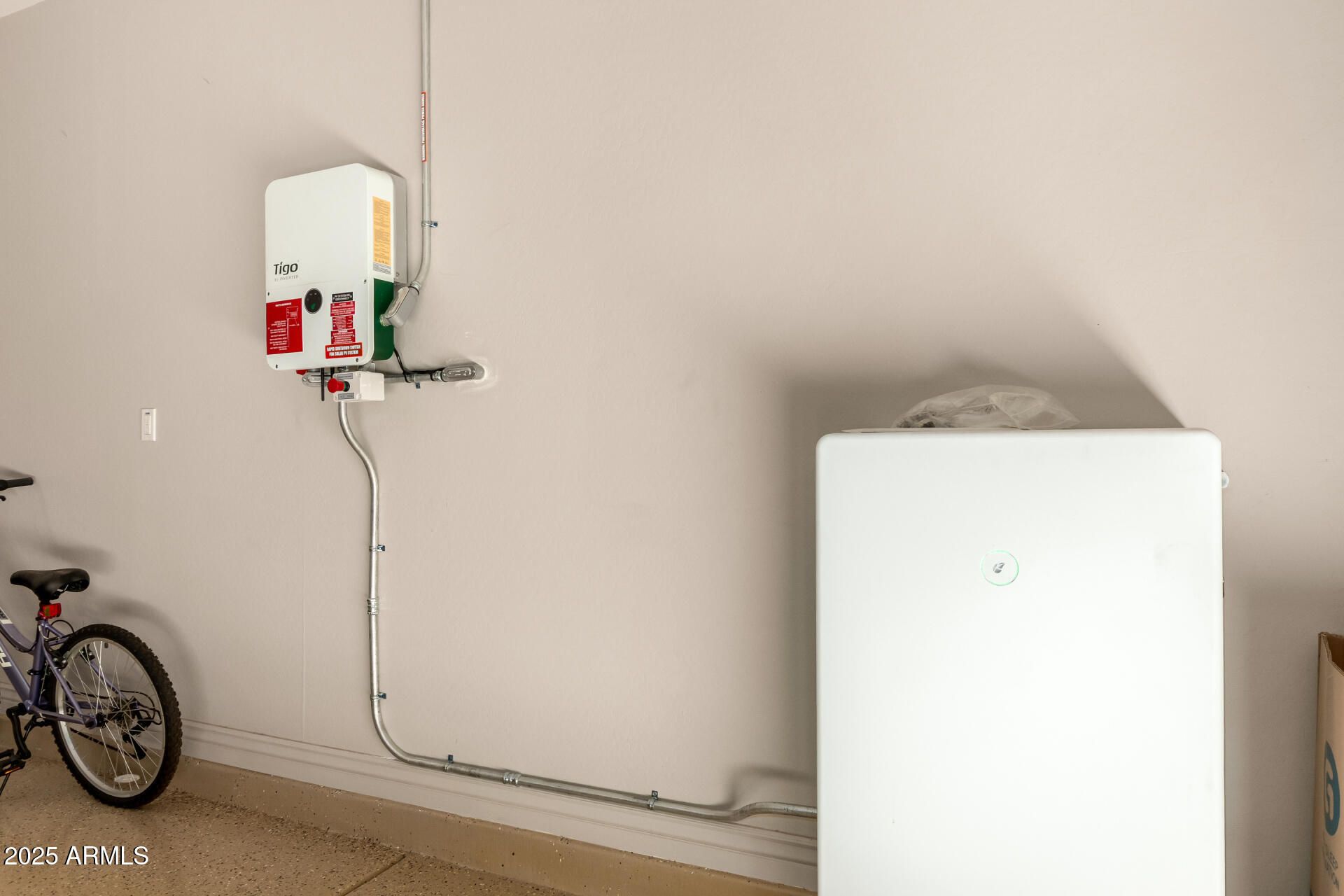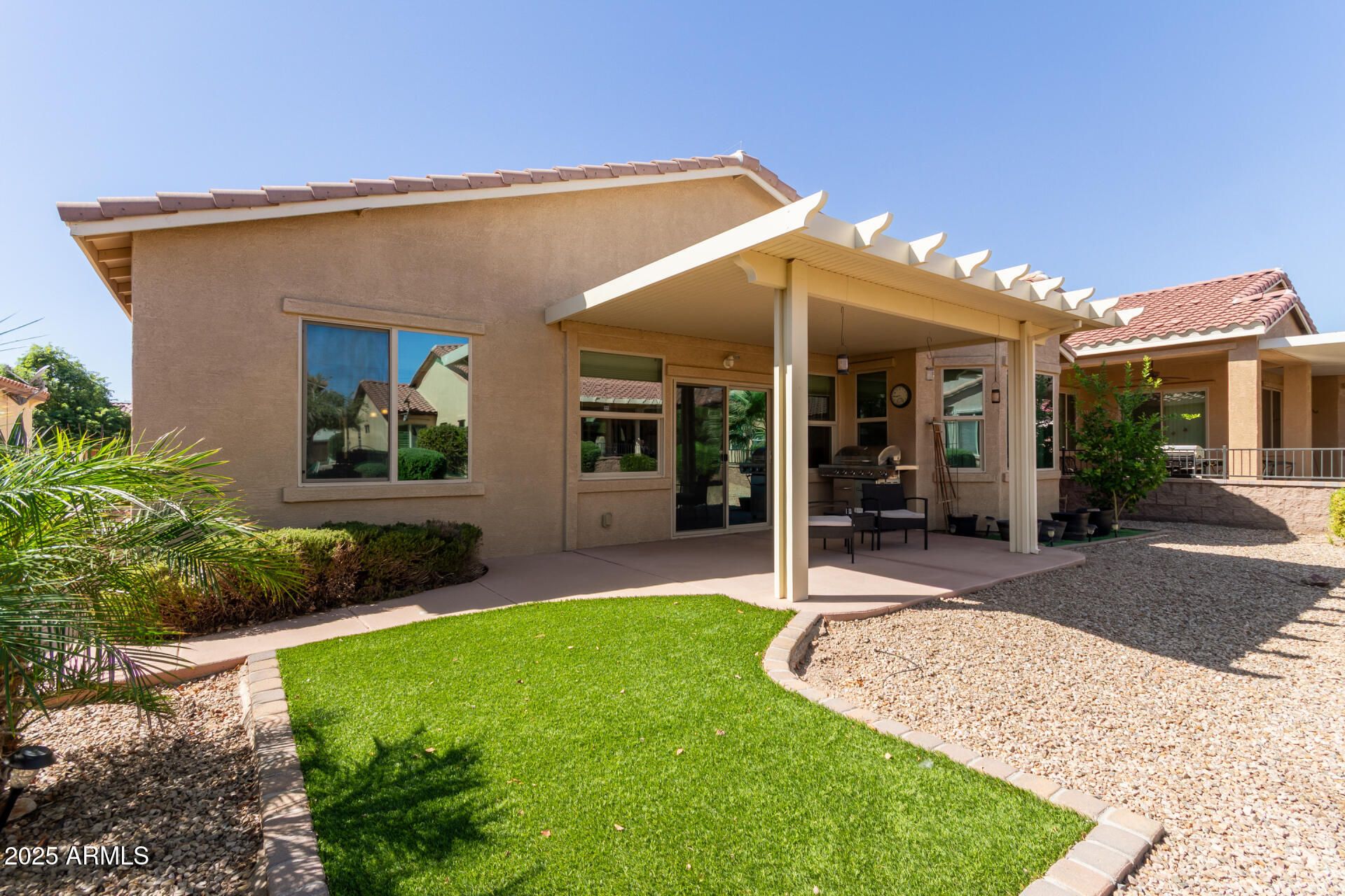 Welcome to the highly desirable 55+ Mission Royale community! This fully upgraded, all electric, energy-efficient home with PAID solar & additional battery with 7.5kwk of storage is move-in ready! Enjoy your morning coffee in the charming front courtyard before stepping inside to find 2 bedrooms, 2 bathrooms, tile & carpet flooring, recessed lighting, ceiling fans, & surround sound. The entertainer's kitchen features white cabinetry with hardware, granite countertops, drop-down deep sink, pendant lights, RO system, and stainless steel appliances. A 150 sq. ft. Arizona room offers extra living space. The primary suite boasts dual sinks and a walk-in shower. The extended garage impresses w/ cabinets, epoxy floors, sink, soft water system, and utility door. Furniture available for purchase. Mission Royale residents enjoy a 15,000+ sq. ft. clubhouse with fitness center, library, billiards, and crafts room. Outdoor amenities include pools, spa, walking paths, tennis, pickleball & bocce ball courts. Golf enthusiasts can join the Mission Royale Golf Club for access to the 18-hole course. Close to shopping, dining, medical centers, and parks, this is 55+ living at its finest!