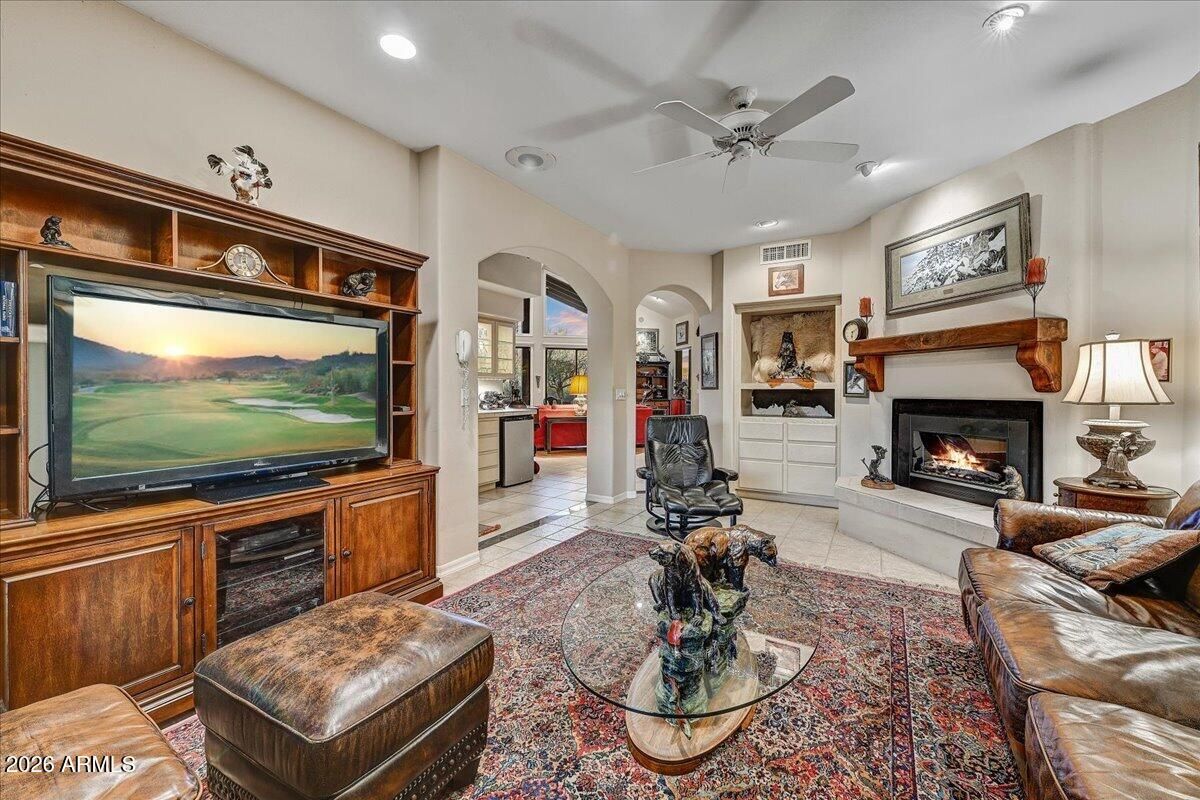 Unobstructed mountain views including Four Peaks. Front of home looks at a par 3, hole #6 on the White Wing golf course. The view extends to include protected view of Tonto National Forest. This is a wonderful entertaining home. Great flow from inside to very large covered patio. The floor-to-ceiling windows create an unlimited sense of openness. The home has a great-room open plan with floor to ceiling windows. Very light and bright. The master bedroom is on one end of house with an ensuite guest bedroom on the far side of the house; providing excellent privacy. The den can be for watching TV, reading or a home office. Large kitchen has island plus a service bar between breakfast room and dining room plus a built-in bar around the corner. Wait, there's more ...
