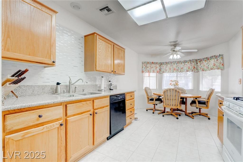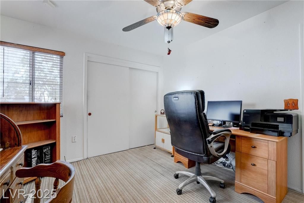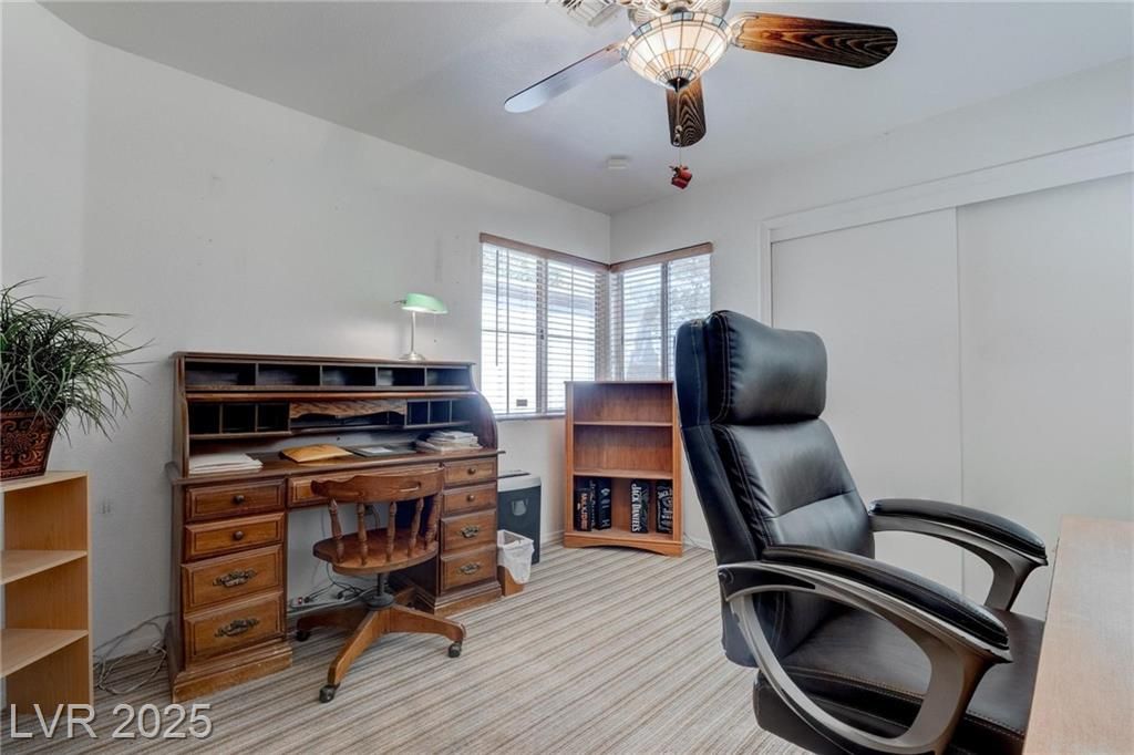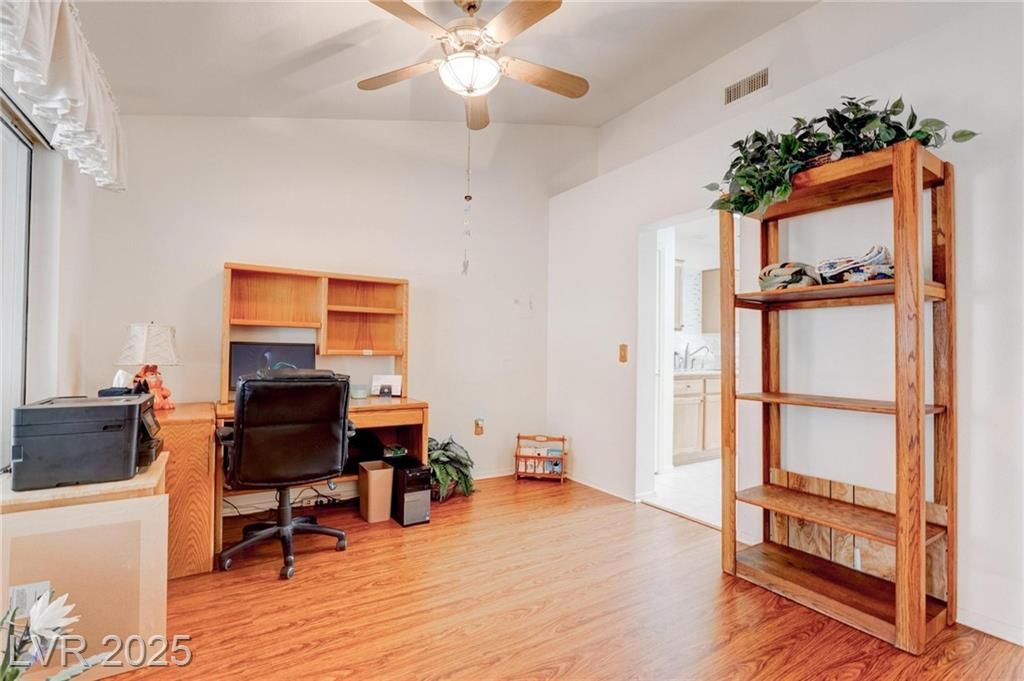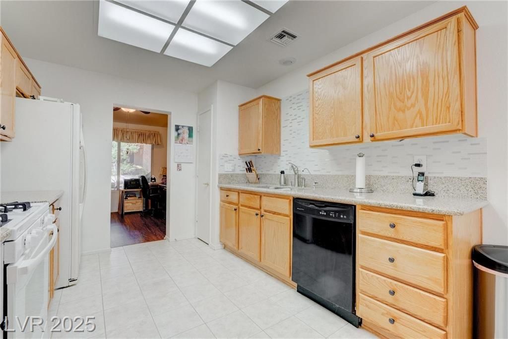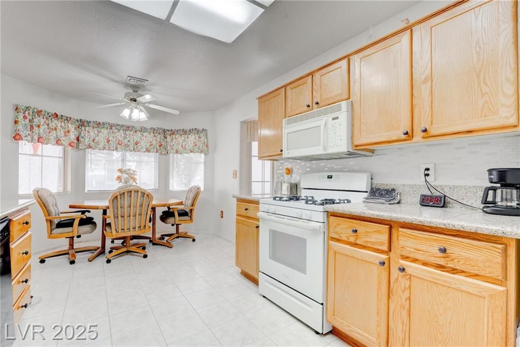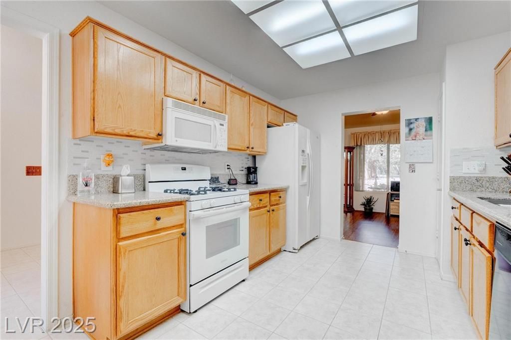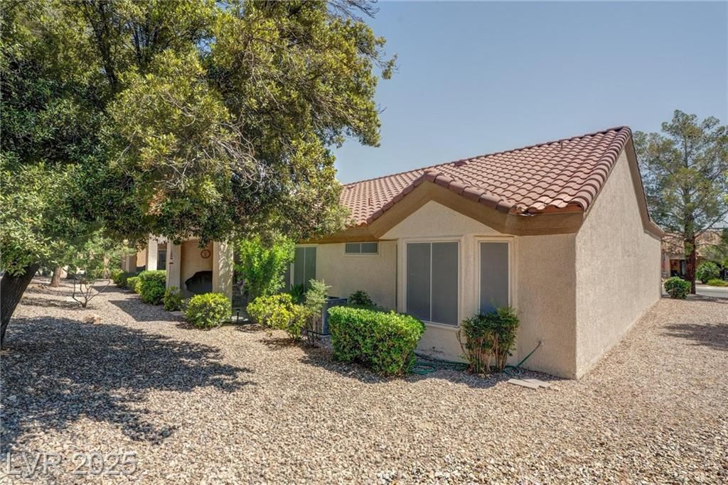 Light filled 2 bedroom and 2 bath townhome. This Popular and cozy Hanford Model offers a wonderful living space! Features a huge great room with vaulted ceiling that looks into generous 10x12 dining area. Kitchen has Granite tops and easy care flooring. 2nd bedroom with fan and light currently used as office. Primary Bedroom is in the rear with custom walk-in closet and Bay window for your pleasure. The A/C and Heater Were Recently Replaced. Home features raised panel Doors and large sliding glass door to the covered patio. Multiple surface flooring thru-out with Tile in both baths. The 2 car garage is equipped with spacious cabinets. Rear yard has covered patio. Sun City offers amenities galore such as community pool/spa, golf, recreation center, exercise room, and tennis/pickleball courts. Located close to shopping, Red Rock, and a variety of restaurants! . Seller may be willing to paint and possibly other improvements.
