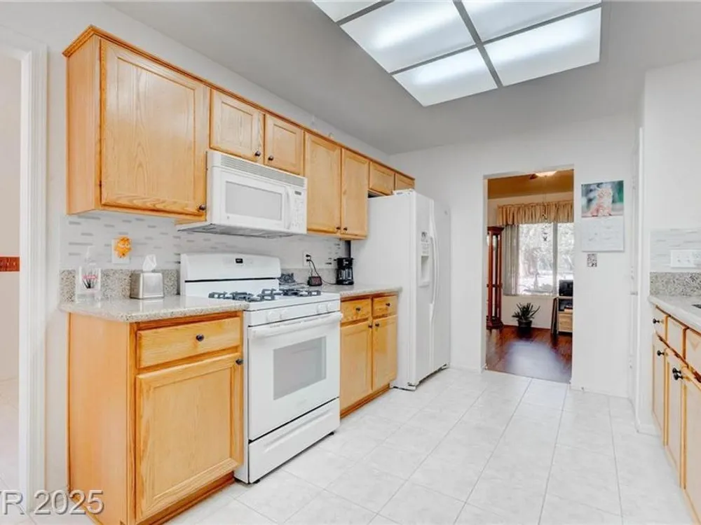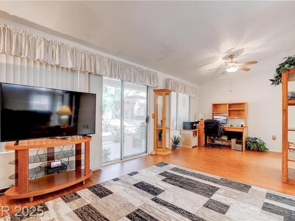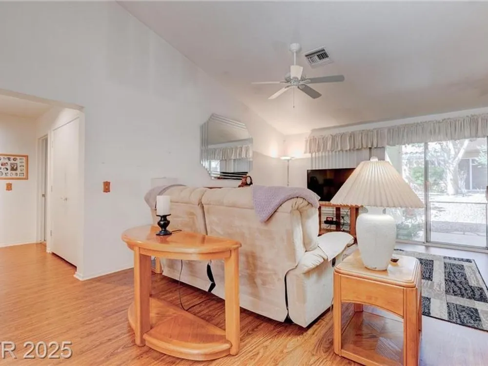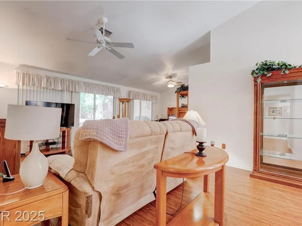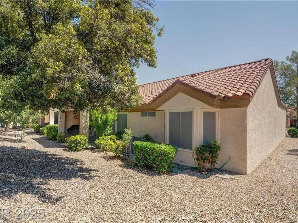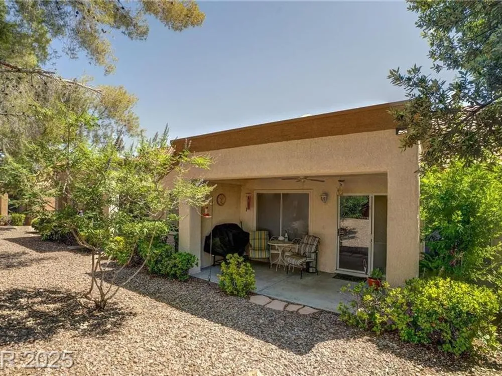 Light filled 2 bedroom and 2 bath townhome. This Popular and cozy Hanford Model offers a wonderful living space! Features a huge great room with vaulted ceiling that looks into generous 10x12 dining area. Kitchen has Granite tops and easy care flooring. 2nd bedroom with fan and light currently used as office. Primary Bedroom is in the rear with custom walk-in closet and Bay window for your pleasure. The A/C and Heater Were Recently Replaced. Home features raised panel Doors and large sliding glass door to the covered patio. Multiple surface flooring thru-out with Tile in both baths. The 2 car garage is equipped with spacious cabinets. Rear yard has covered patio. Sun City offers amenities galore such as community pool/spa, golf, recreation center, exercise room, and tennis/pickleball courts. Located close to shopping, Red Rock, and a variety of restaurants! You will love your new home in this special community!