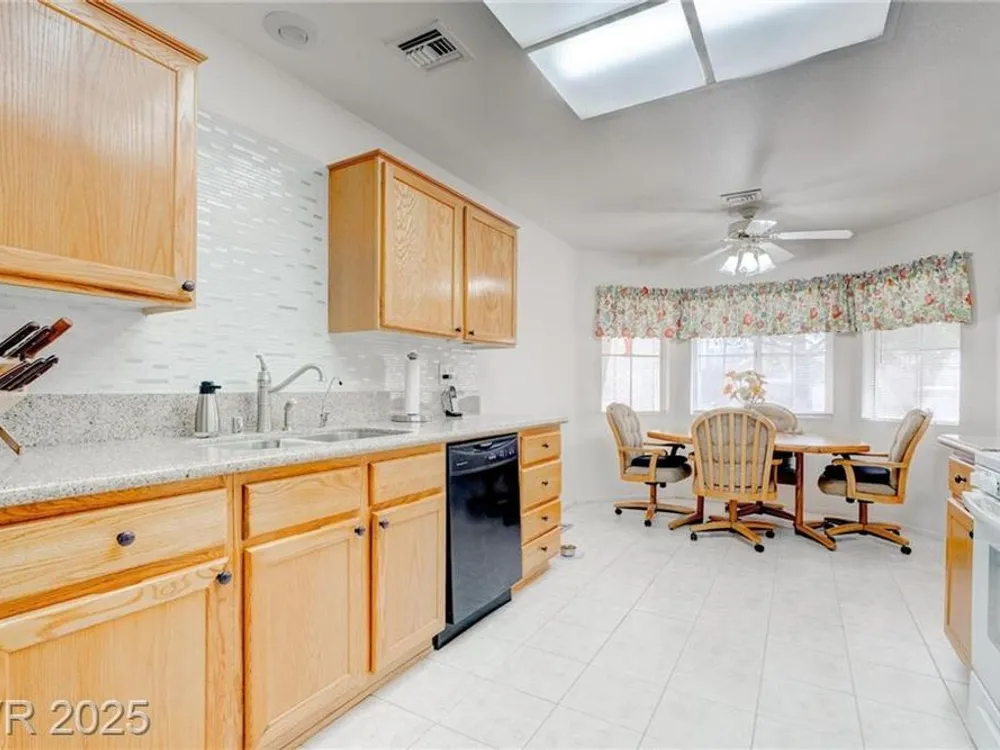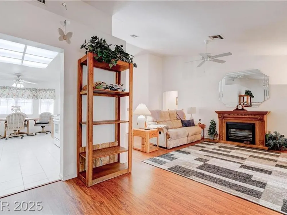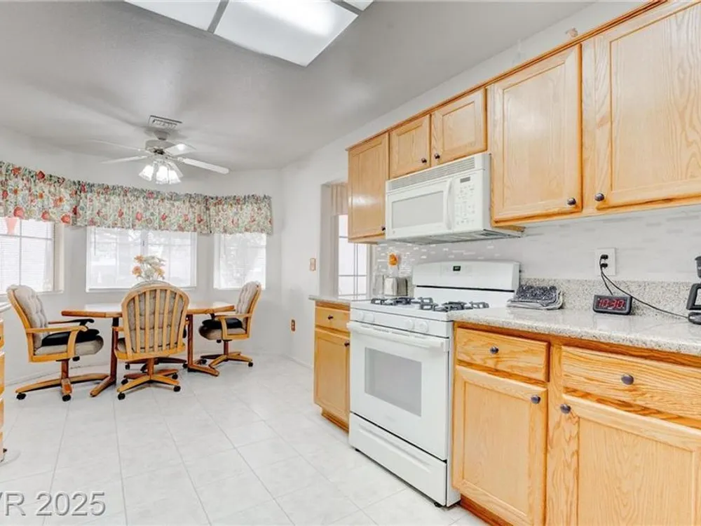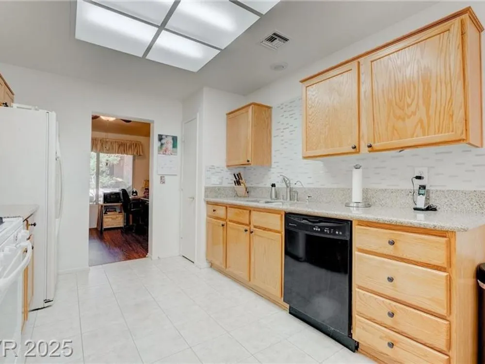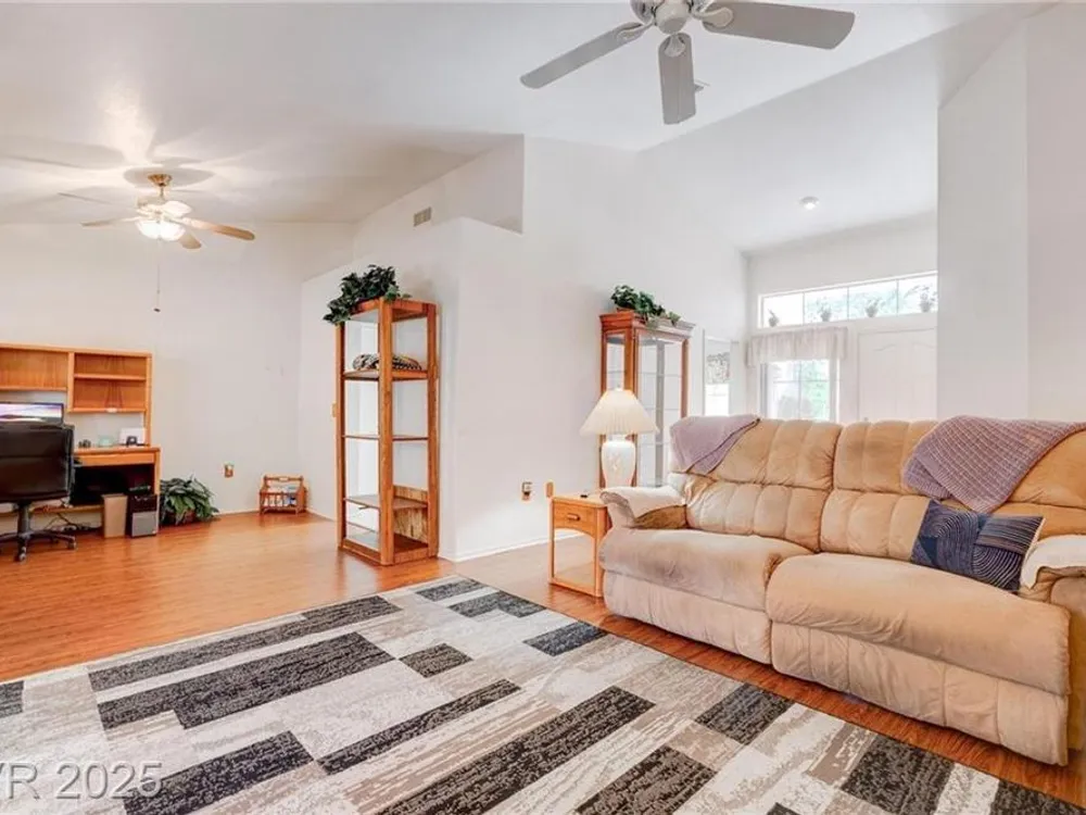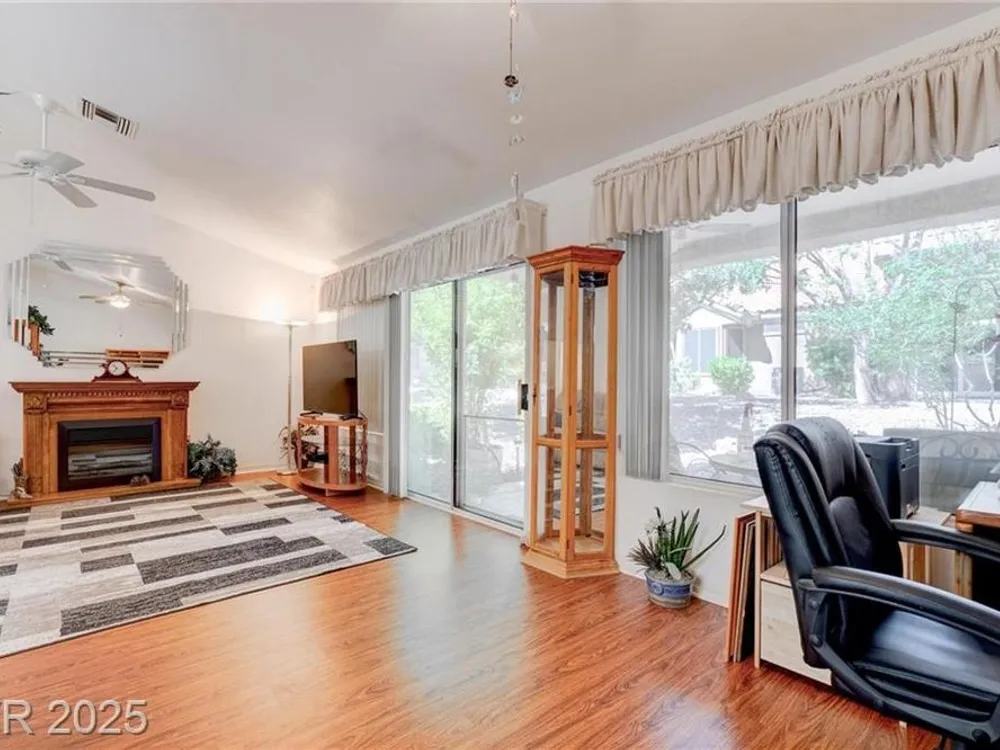 Light filled 2 bedroom and 2 bath townhome. This Popular and cozy Hanford Model offers a wonderful living space! Features a huge great room with vaulted ceiling that looks into generous 10x12 dining area. Kitchen has Granite tops and easy care flooring. 2nd bedroom with fan and light currently used as office. Primary Bedroom is in the rear with custom walk-in closet and Bay window for your pleasure. The A/C and Heater Were Recently Replaced. Home features raised panel Doors and large sliding glass door to the covered patio. Multiple surface flooring thru-out with Tile in both baths. The 2 car garage is equipped with spacious cabinets. Rear yard has covered patio. Sun City offers amenities galore such as community pool/spa, golf, recreation center, exercise room, and tennis/pickleball courts. Located close to shopping, Red Rock, and a variety of restaurants! You will love your new home in this special community!