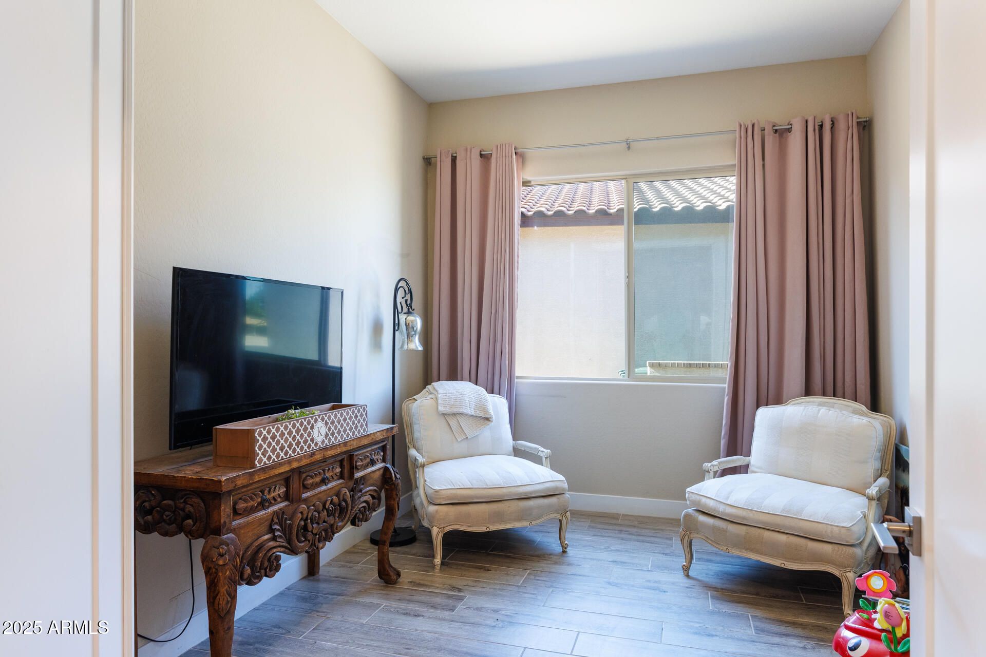 Experience Modern Golf Course Living at its Finest. Embrace luxury living in this stunning modern home, perfectly located on the golf course in the highly sought-after Mission Royale Active Adult Community. Designed for comfort and style, this residence features 2 bedrooms, 2.5 bathrooms, a versatile den, and smart home upgrades throughout. The open-concept layout and split floor plan create an inviting atmosphere filled with natural light, ideal for entertaining or relaxing in style. The gourmet kitchen is a chef's dream, showcasing an impressive 12-foot island, double ovens, and an abundance of custom cabinetry to meet all your culinary needs. Step outside and enjoy direct backyard access to the #2 hole of the golf course, offering breathtaking views and endless recreation.