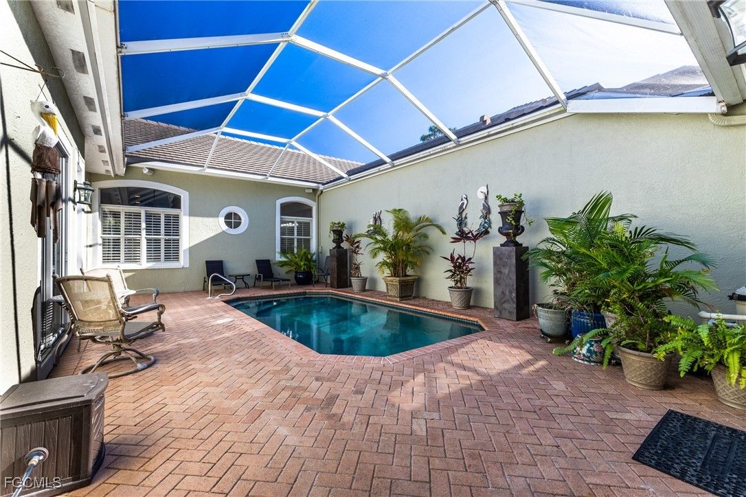 This is the home you have been looking for! A resort-style courtyard residence blending elegance, comfort, and Florida sunshine. All the convenience of a condo with the feel of a single-family home! Enter through a private courtyard to a screened pool oasis—perfect for swims, morning laps, or evening entertaining. The home offers nearly 2,000 sq ft with three bedrooms and three baths, including a detached guest cabana with a bedroom, full bath, and kitchenette, ideal for visitors, a home office, or studio. The open great room features soaring ceilings, abundant natural light, and water-and-fountain views. The kitchen is well-appointed with an electric cooktop, microwave, dishwasher, and reverse-osmosis system, complemented by a breakfast bar and two formal dining areas. Tile floors throughout provide a clean, low-maintenance finish. A third dining area on the screened lanai overlooks the pond and fountain After dinner, relax on the couch and living area on the lanai with southwest exposure for fabulous sunsets! The primary suite is a true retreat with dual vanities, a soaking tub, walk-in shower. This home has a split-bedroom layout for added privacy for each of the 3 bedrooms with their private baths and showers. Additional amenities include a two-car attached garage, pre-wired cable and internet, zoned stereo system to enjoy your favorite tunes inside and/or outside on the lanai or by the pool, a large-screen TV with surround sound in the living room, and a custom-built entertainment center with an electric fireplace. Each room has a large screen TV which really makes you feel like you are living on vacation! Visit website for more information and photos of this incredible neighborhood and amenities at https://pelicanlanding.com/amenities. The home is offered turnkey — move in with ease. Everything you need is already here! Community features include a private island with boat shuttle, staffed fitness center, tennis and pickleball courts with pros, bocce, kayaking parks, Sailboats with complimentary instruction and regattas, a butterfly garden, biking paths, and 24-hour gated security. The community is very pet friendly with bag stations along the walking paths for your convenience. 25413 Alicante Drive is more than a house — it’s a lifestyle. Schedule a tour to see it for yourself!