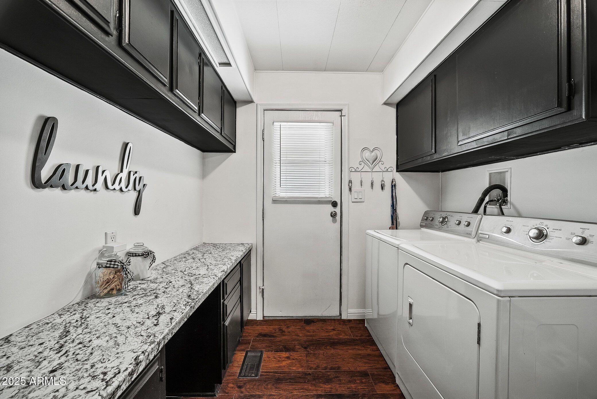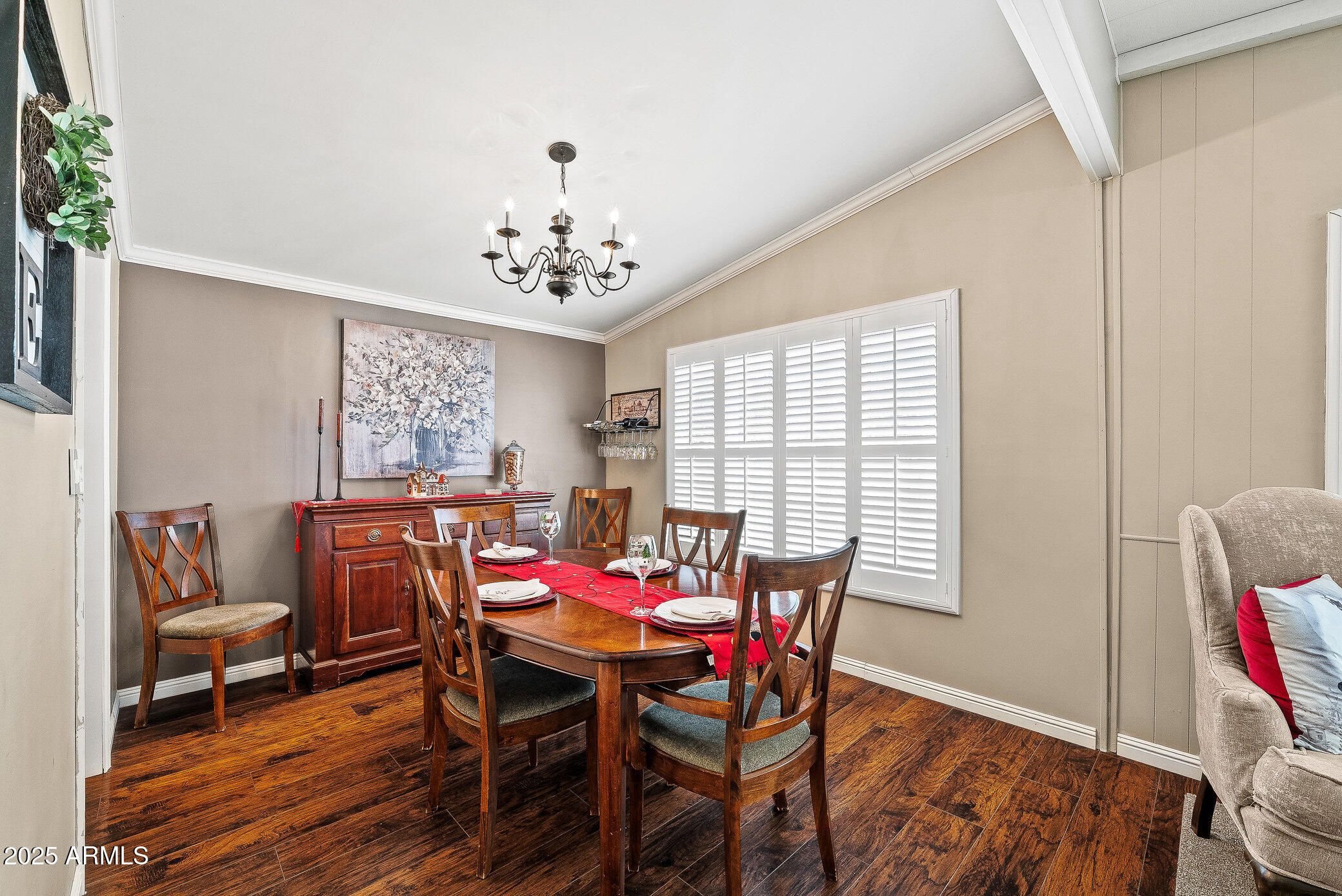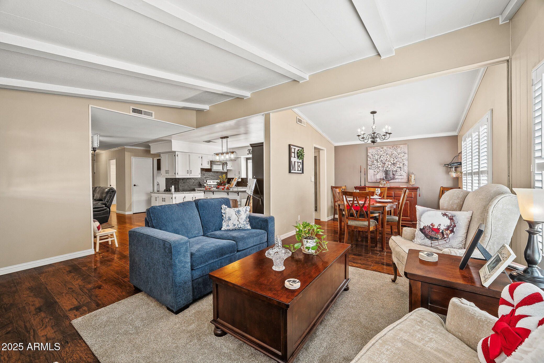 Welcome to this beautifully maintained, move-in-ready home situated on an approximately one-third-acre cul-de-sac lot, one of the largest in the desirable active adult community of Sun Lakes. The front yard features attractive, low-maintenance astroturf that looks like real grass while offering the added benefit of water savings. Inside, every detail has been thoughtfully considered, beginning with an open floor plan that seamlessly connects the living spaces and creates an inviting setting for both everyday living and entertaining. New HVAC installed in July, 2025. The living room is highlighted by wood flooring, crown molding, ceiling beams, and plantation shutters, and flows effortlessly into the dining area. Both the dining space and kitchen continue the warmth of wood flooring. The kitchen offers ample counter space, a custom backsplash, a stylish and functional sink, abundant cabinetry, and decorative lighting that adds an elegant finishing touch. The range and the microwave are newer and included in the sale. Both bathrooms feature step-in showers, providing comfort and convenience for residents and guests alike. The primary suite includes French doors that open to a covered, enclosed patio, newer carpet with high-end padding, a custom walk-in closet, and a beautifully updated primary bathroom with a walk-in shower. All windows throughout the home have been upgraded to dual-pane. The laundry room includes the washer and dryer and offers generous storage. An additional approximately 330 sq. ft. Arizona Room, not included in the listed square footage, is both cooled and heated and features a separate exterior entrance. This versatile space is ideal for use as a den, hobby room, or additional storage. The property continues to impress with a 20' x 30' extended-length, fully enclosed garage featuring built-in cabinets and ample space for two small vehicles, complemented by a carport that provides additional parking. The backyard provides a peaceful retreat with low-maintenance desert landscaping and solar exterior lighting, perfect for enjoying Arizona's beautiful weather. A security system is also included in the sale. Please note that the kitchen island, coffee bar, and front-yard arbor are personal property and do not convey, though they may be purchased separately on a bill of sale. This manufactured home meets the requirements for FHA financing approval. Residents of Sun Lakes enjoy access to exceptional amenities, including a recreation center, golf, tennis and pickleball courts, heated community pools and spas, organized adult activities, and on-site restaurants. There are several restaurants located throughout the Sun Lakes communities that residents are welcome to enjoy.