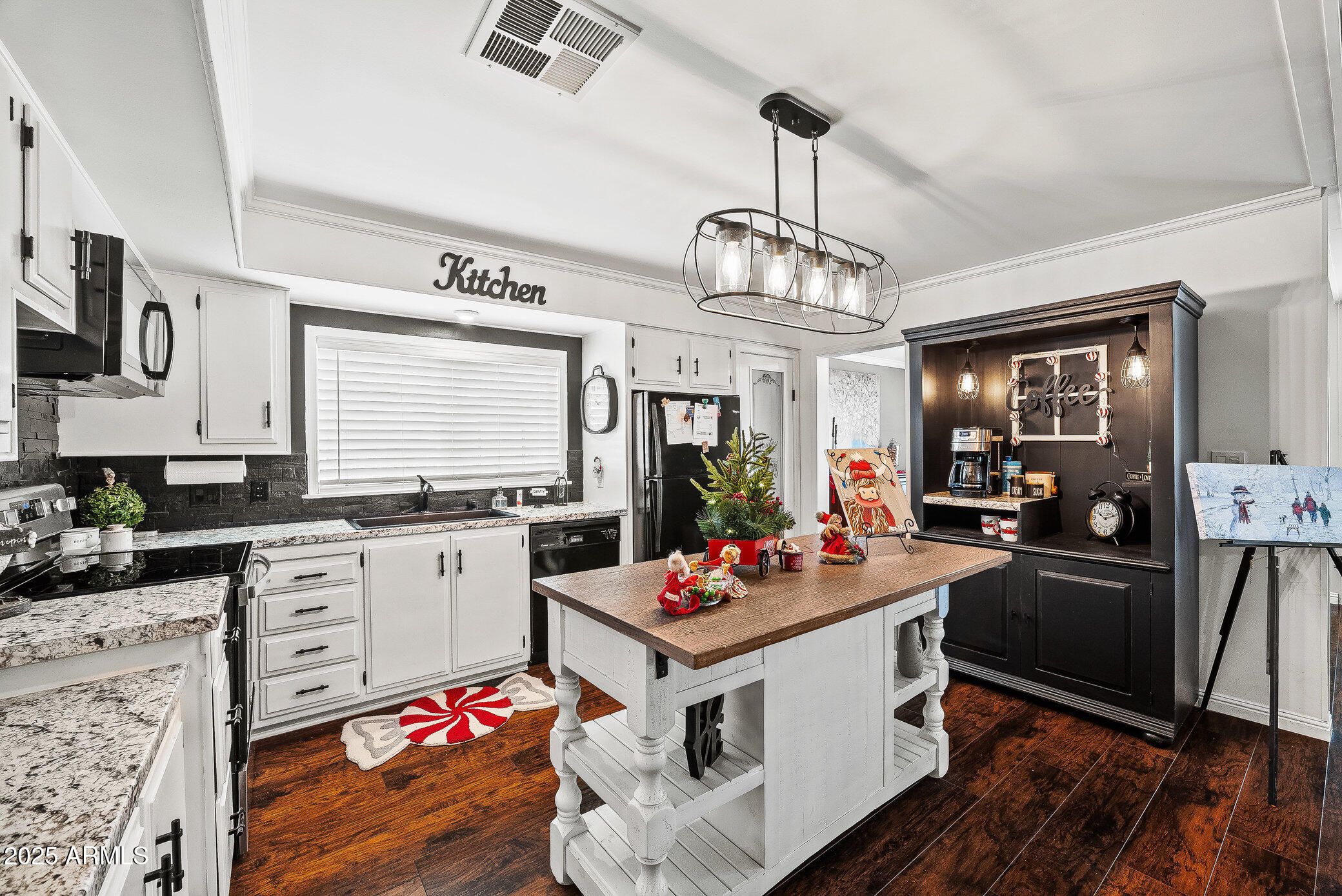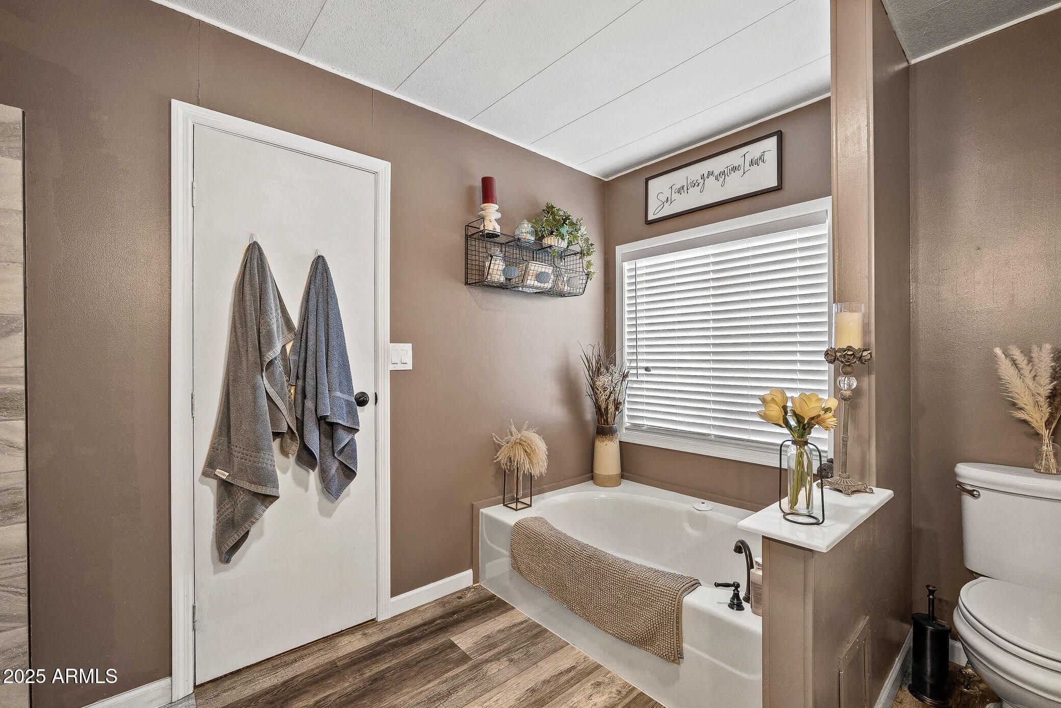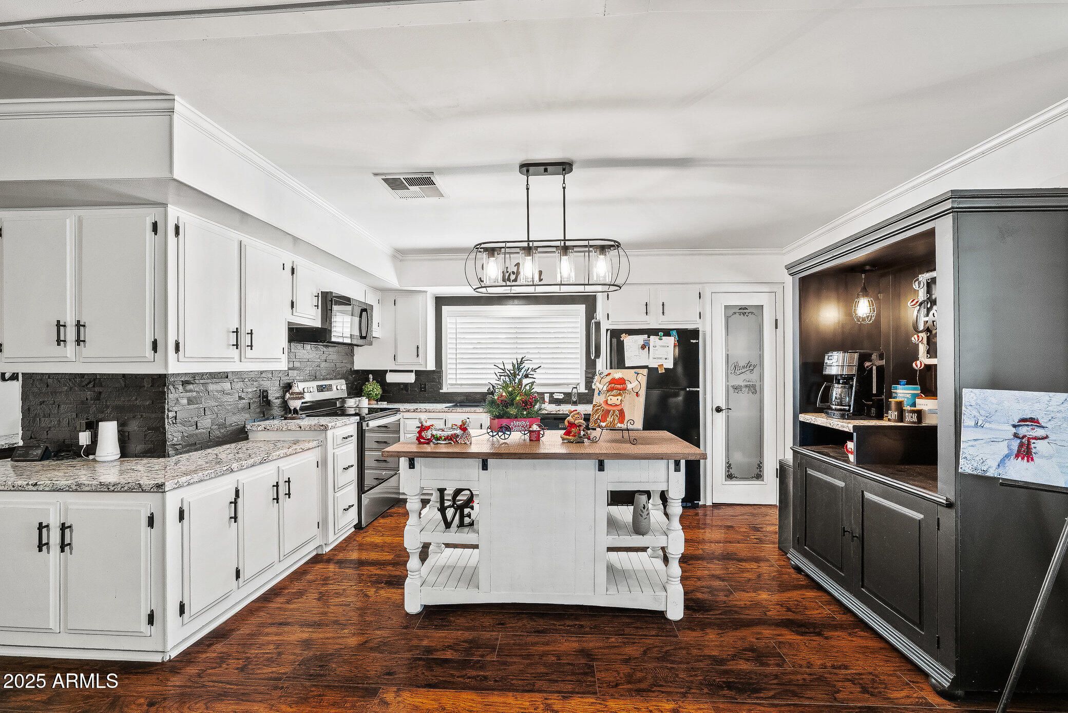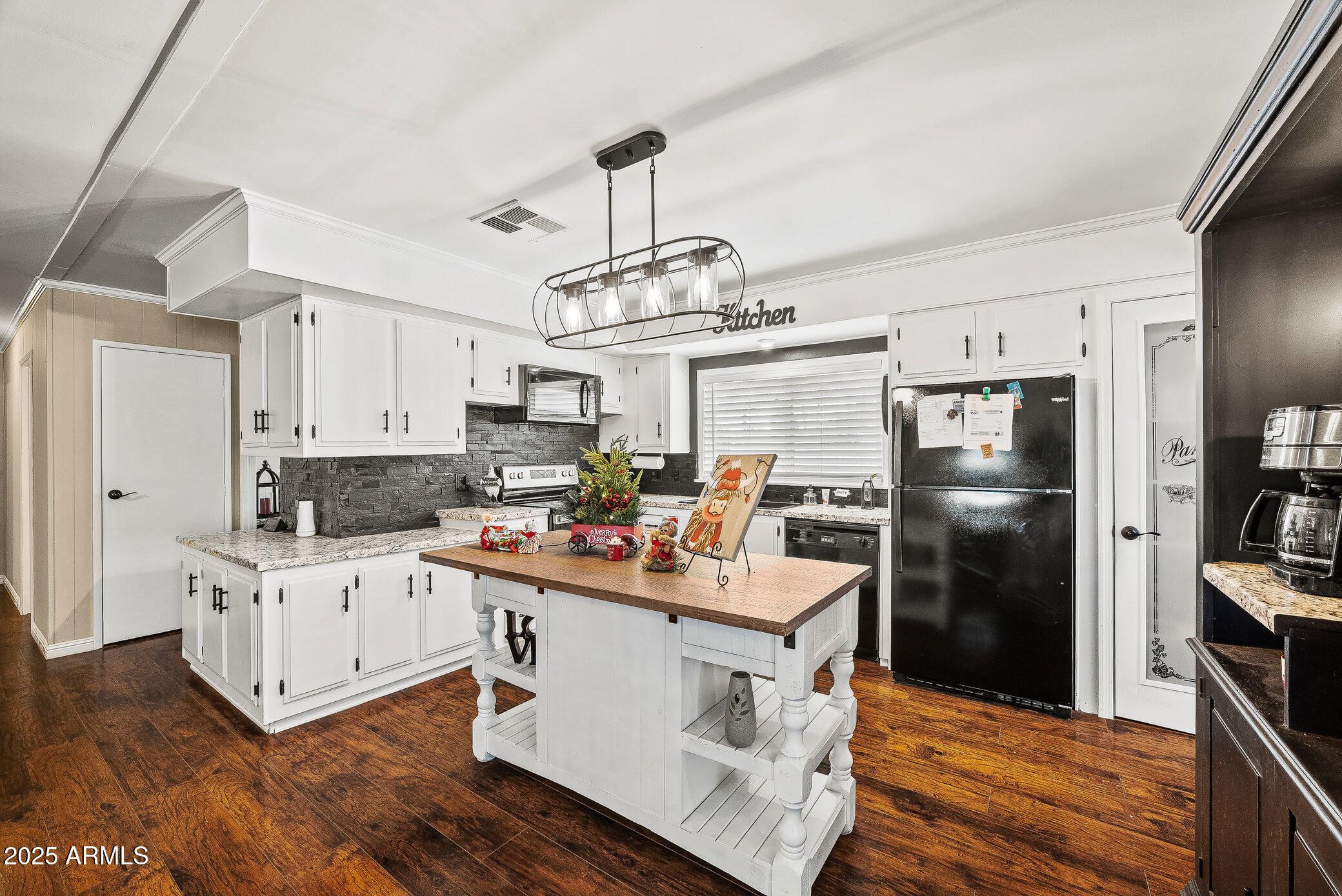 Welcome to this beautifully maintained, move-in-ready home situated on an approximately one-third-acre cul-de-sac lot, one of the largest in the desirable active adult community of Sun Lakes. The front yard features attractive, low-maintenance astroturf that looks like real grass while offering the added benefit of water savings. Inside, every detail has been thoughtfully considered, beginning with an open floor plan that seamlessly connects the living spaces and creates an inviting setting for both everyday living and entertaining. New HVAC installed in July, 2025. The living room is highlighted by wood flooring, crown molding, ceiling beams, and plantation shutters, and flows effortlessly into the dining area. Both the dining space and kitchen continue the warmth of wood flooring. The kitchen offers ample counter space, a custom backsplash, a stylish and functional sink, abundant cabinetry, and decorative lighting that adds an elegant finishing touch. The range and the microwave are newer and included in the sale. Both bathrooms feature step-in showers, providing comfort and convenience for residents and guests alike. The primary suite includes French doors that open to a covered, enclosed patio, newer carpet with high-end padding, a custom walk-in closet, and a beautifully updated primary bathroom with a walk-in shower. All windows throughout the home have been upgraded to dual-pane. The laundry room includes the washer and dryer and offers generous storage. An additional approximately 330 sq. ft. Arizona Room, not included in the listed square footage, is both cooled and heated and features a separate exterior entrance. This versatile space is ideal for use as a den, hobby room, or additional storage. The property continues to impress with a 20' x 30' extended-length, fully enclosed garage featuring built-in cabinets and ample space for two small vehicles, complemented by a carport that provides additional parking. The backyard provides a peaceful retreat with low-maintenance desert landscaping and solar exterior lighting, perfect for enjoying Arizona's beautiful weather. A security system is also included in the sale. Please note that the kitchen island, coffee bar, and front-yard arbor are personal property and do not convey, though they may be purchased separately on a bill of sale. This manufactured home meets the requirements for FHA financing approval. Residents of Sun Lakes enjoy access to exceptional amenities, including a recreation center, golf, tennis and pickleball courts, heated community pools and spas, organized adult activities, and on-site restaurants. There are several restaurants located throughout the Sun Lakes communities that residents are welcome to enjoy.