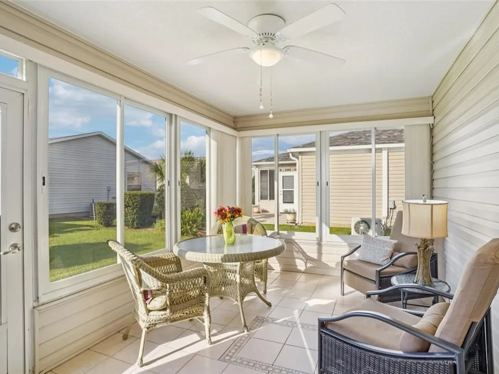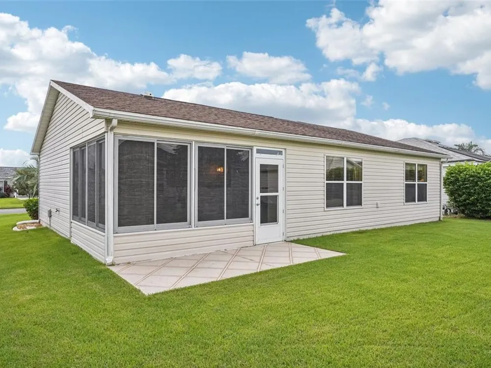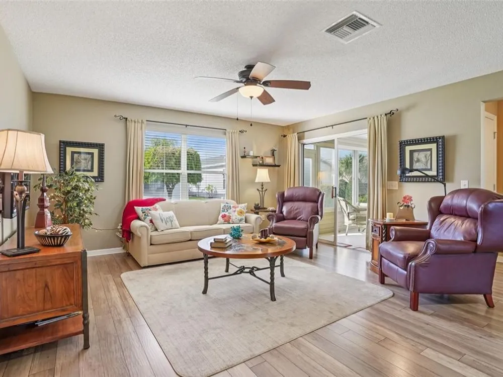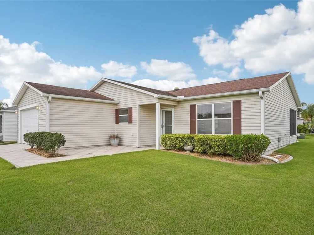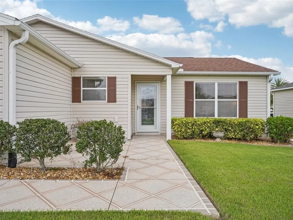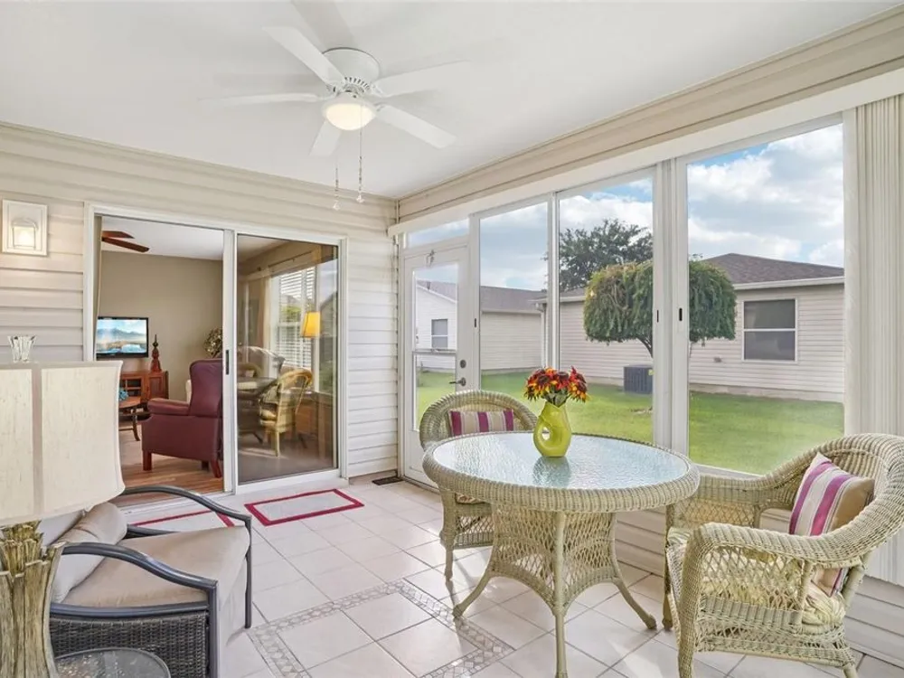 No Bond. Welcome to your Florida home in the Village of Duval, perfectly situated in the Sweet Spot in The Villages, Florida. Yes, the Sweet Spot in between the 6's and in between Morse and Buana Vista. Just minutes by Golf Cart to Sumter Landing and also Brownwood Town Square. This 2 BR 2 BA home comes Turnkey. Owners of this home have used this home as their in-season home only. Features: Beautiful laminate flooring in all rooms with Carpet in the bedrooms. The enclosed lanai has tile and baths have rolled vinyl. The kitchen has a breakfast bar, stainless steel appliances, tile backsplace, and beautiful cabinets with pullouts. A Solar Tube/Light over the dining room table is a perfect touch. The front patio area is large enough to enjoy sitting out and the walkway and driveway are painted. Irrigation system maintains your landscaping all year round. HVAC replaced June 2024 and home comes with a Yamaha Gas Golf Cart. If Security is a priority, The Villages is one of the safest places period. Add all the amenities to your Florida Home and this is your home to choose. Call me today for a private showing or a Facetime showing if not local.There is a $199.00 a month mandatory Amenity Fee to have access to all the amenities of The Villages.