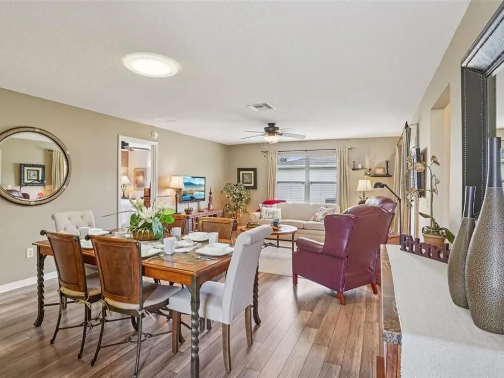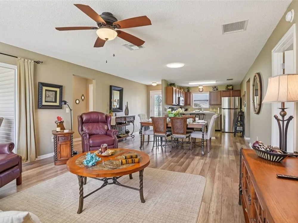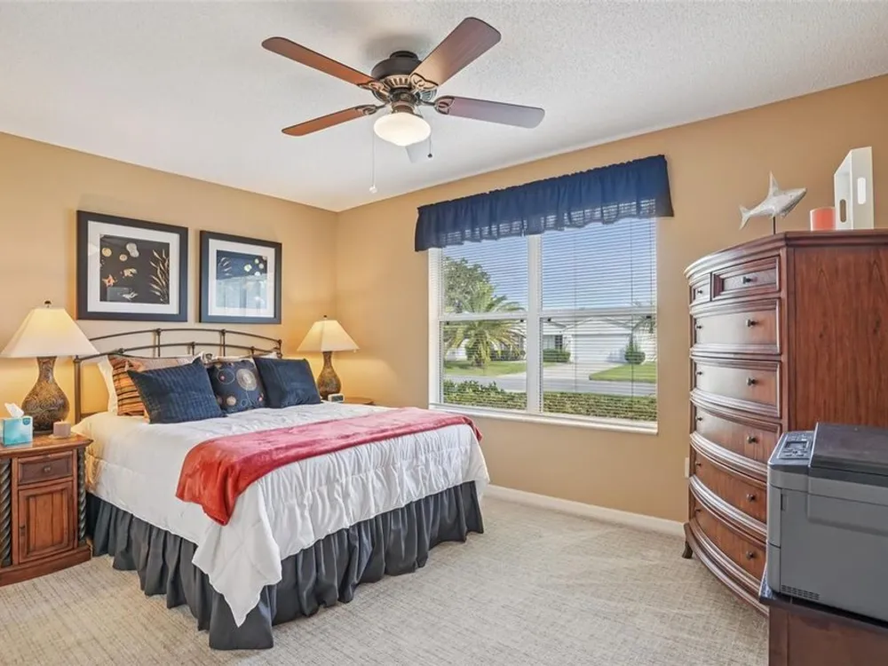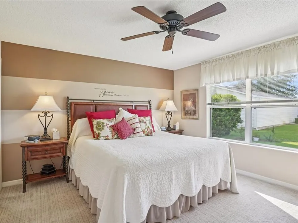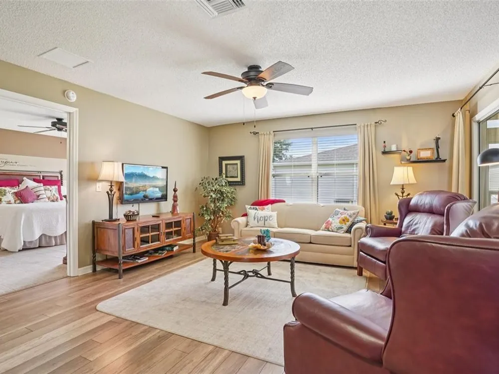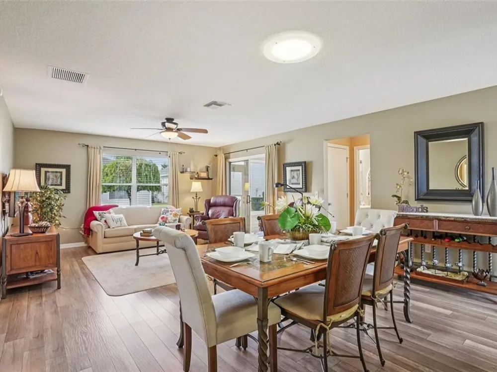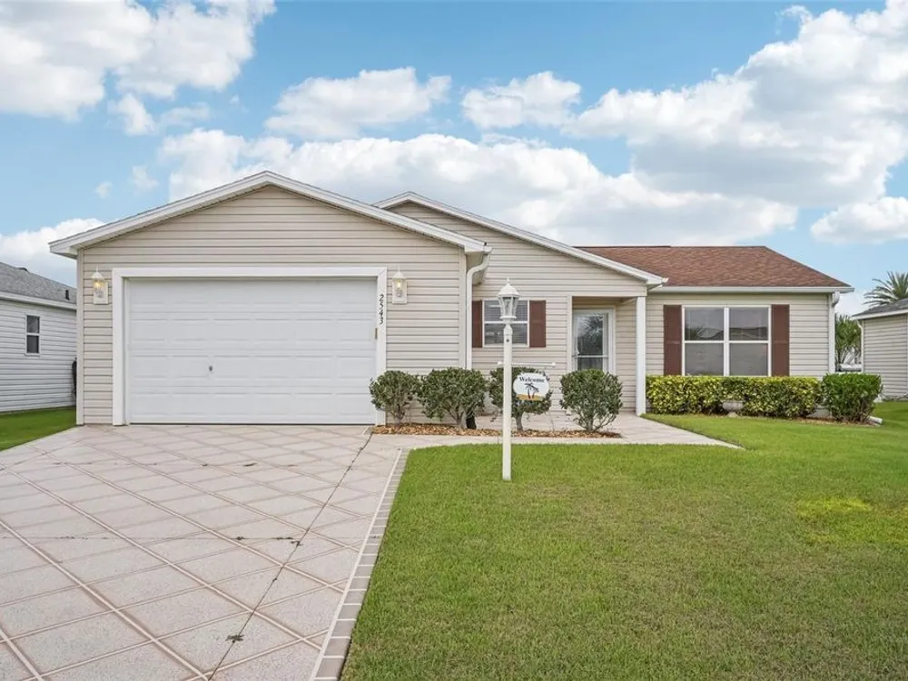 No Bond. Welcome to your Florida home in the Village of Duval, perfectly situated in the Sweet Spot in The Villages, Florida. Yes, the Sweet Spot in between the 6's and in between Morse and Buana Vista. Just minutes by Golf Cart to Sumter Landing and also Brownwood Town Square. This 2 BR 2 BA home comes Turnkey. Owners of this home have used this home as their in-season home only. Features: Beautiful laminate flooring in all rooms with Carpet in the bedrooms. The enclosed lanai has tile and baths have rolled vinyl. The kitchen has a breakfast bar, stainless steel appliances, tile backsplace, and beautiful cabinets with pullouts. A Solar Tube/Light over the dining room table is a perfect touch. The front patio area is large enough to enjoy sitting out and the walkway and driveway are painted. Irrigation system maintains your landscaping all year round. HVAC replaced June 2024 and home comes with a Yamaha Gas Golf Cart. If Security is a priority, The Villages is one of the safest places period. Add all the amenities to your Florida Home and this is your home to choose. Call me today for a private showing or a Facetime showing if not local.There is a $199.00 a month mandatory Amenity Fee to have access to all the amenities of The Villages.
