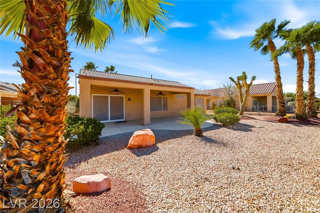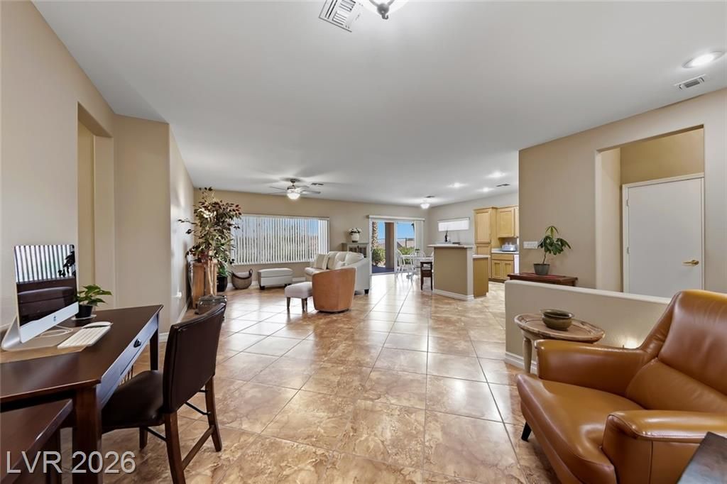 Immaculate, move-in ready Jefferson model on an oversized lot with beautiful mountain views. A private gated courtyard welcomes you into a bright, open layout designed for comfortable living & easy entertaining. The spacious great room flows into the eat-in kitchen with breakfast nook, while a versatile den offers ideal space for a home office or quiet retreat. Fresh designer paint, refined tile flooring & updated lighting create a clean, cohesive feel throughout. The elevated backyard features an expansive covered patio, mature low-maintenance landscaping & sweeping views, with palm trees enhancing the desert setting. Recent upgrades include newer HVAC, solar screens, updated irrigation & industrial-grade garage cabinetry for exceptional storage. Located in Sun City Anthem, residents enjoy three recreation centers, indoor & outdoor pools, fitness centers, golf, tennis, pickleball, walking trails & an active 55+ lifestyle just minutes from shopping & dining.
