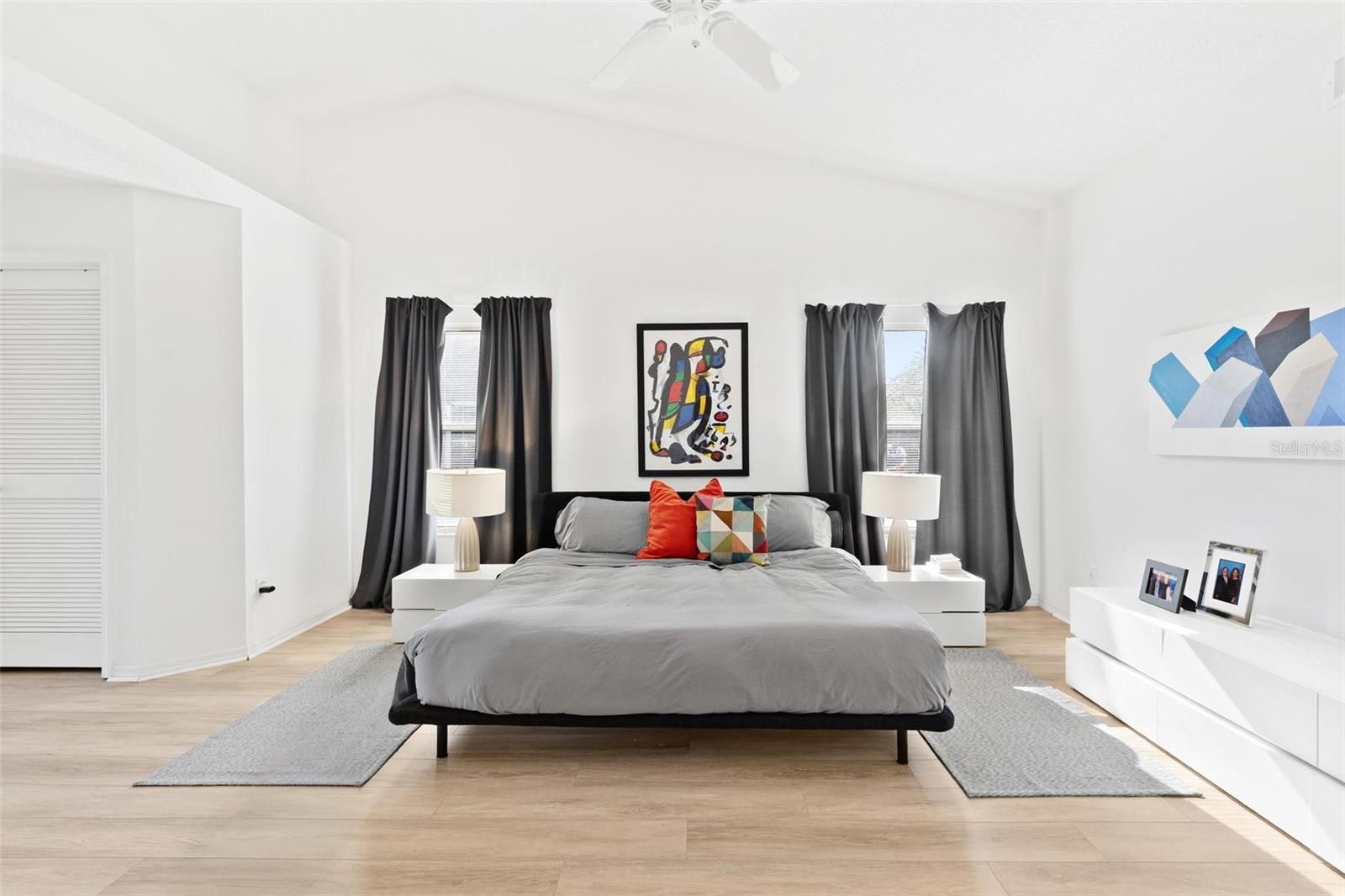- Ceiling Fan(s), High Ceilings, Main Level Primary, Split Bedrooms, Thermostat, Walk-In Closet(s), Window Treatments