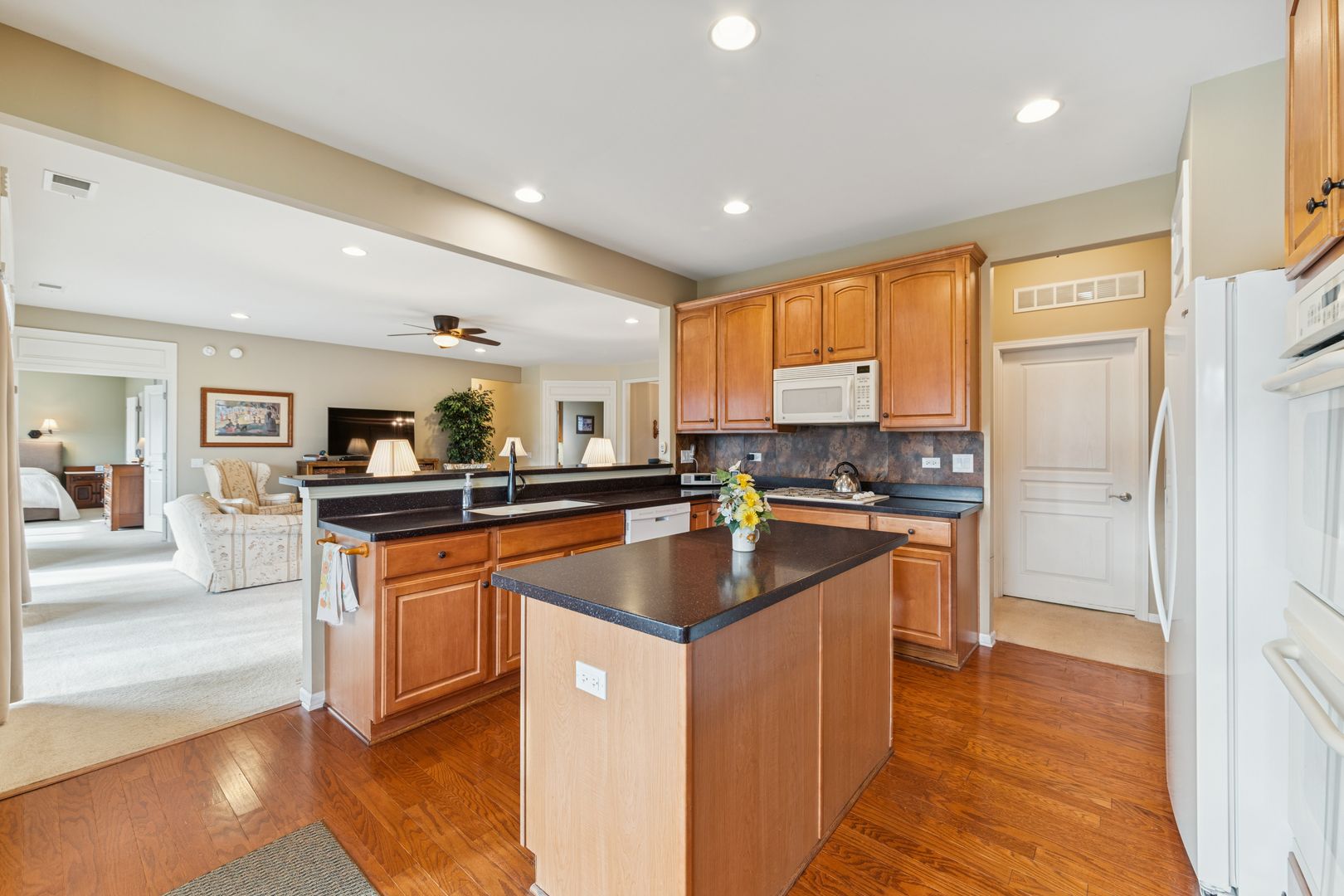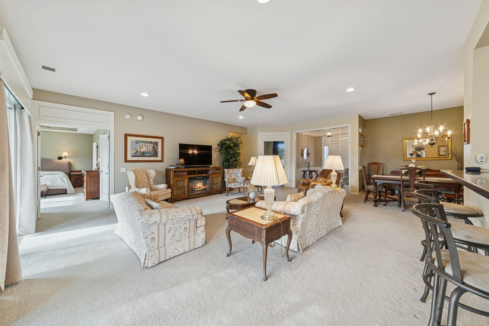 *OPEN SUNDAY 1:00-3:00**Exceptional location for this popular "Cascade" model across from Creekside Lodge and on walking path! Kitchen has 42" maple cabinets, granite counters, hardwood floors, and bay window. Look out the window or sit on the paver patio with pergola to see all the birds and wild-life! Master Bedroom has bay window and large walk-in closet. Master bath has cherry cabinets and soaking tub and separate shower. 2nd bathroom has roll-in shower and extra wide doors. Utility room has enclosed mechanicals. Extended garage with cabinet, pull down stairs,and epoxy floors. *Furnace, refrigerator, & new kitchen flooring was replaced. (Current owners qualified for Sr. Exemption but were not receiving it so tax bill for 2024 is $9,828.44 with only homestead exemption.) Edgewater is an Active Adult community and one resident in home needs to be at least 55+. Edgewater takes care of snow and lawn maintenance, seal coating and mulch every other year, and Creekside Lodge has indoor and outdoor pools, hot tub, fitness center, billiard room, tennis/bocce courts, and many activities. HOA on this home is $302.25 per month.