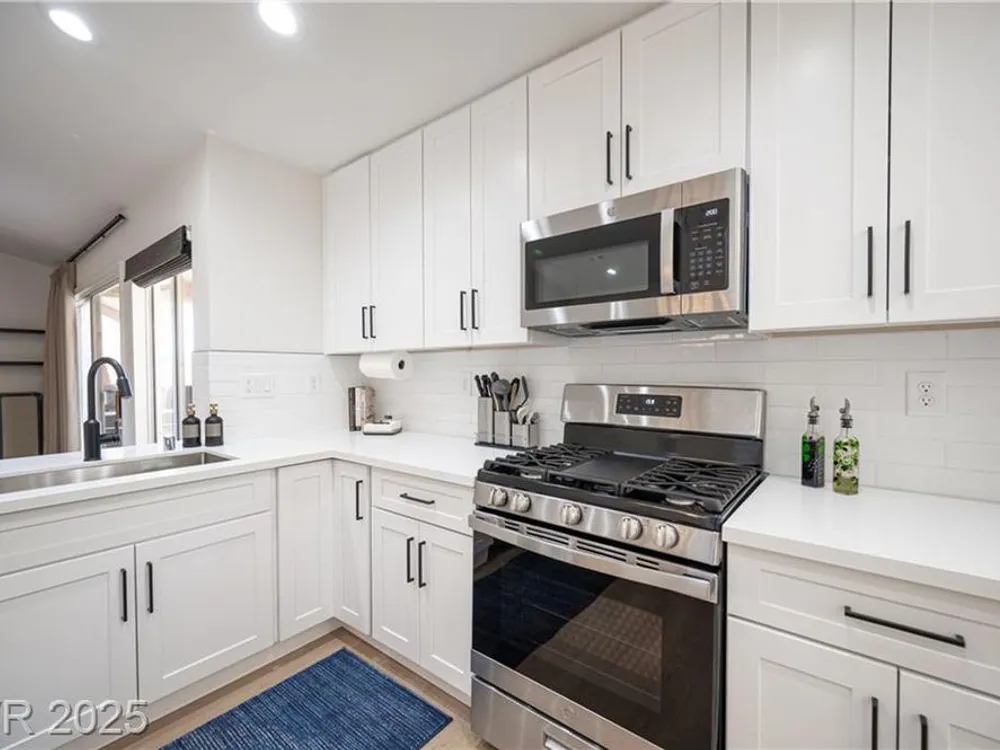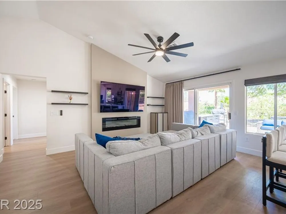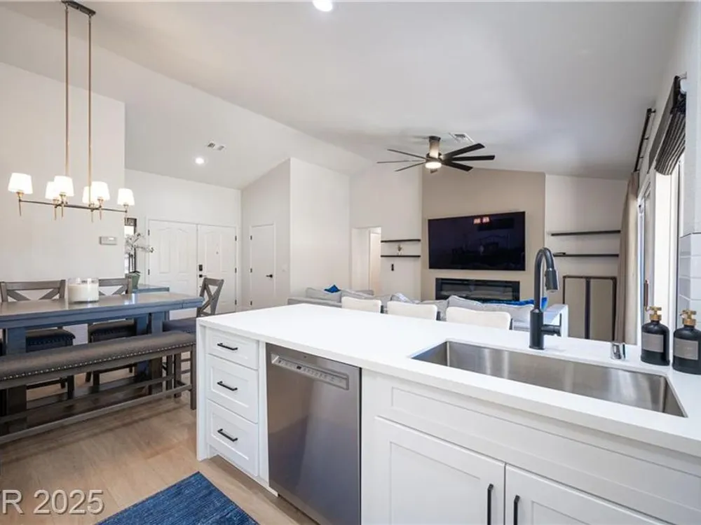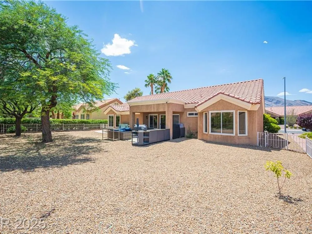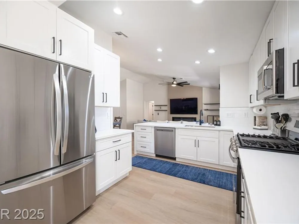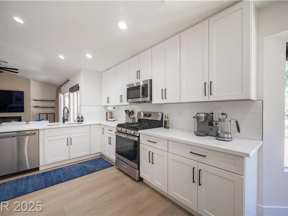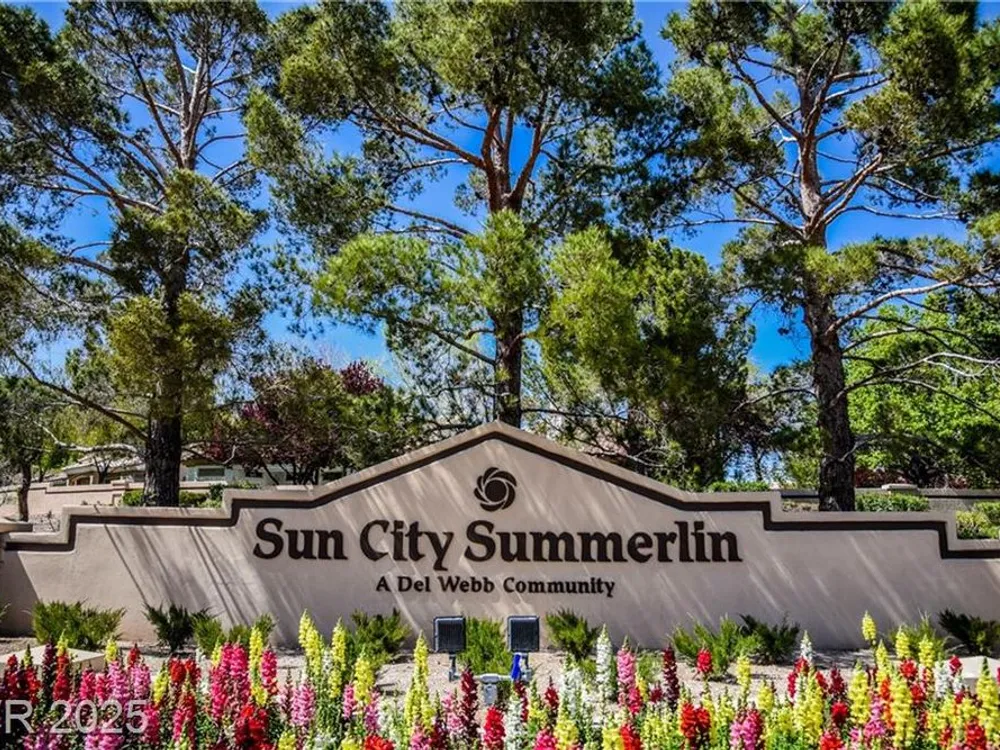 Welcome to your Sun City Summerlin oasis, completely transformed with modern design and functionality. The redesigned kitchen, featuring vaulted ceilings and a peninsula that overlooks the living room and new fireplace, creates an open and inviting layout. Upgrades include new 42" white shaker cabinets, white quartz countertops, a subway tile backsplash, and brand-new appliances. New luxury vinyl wood plank floors, plush bedroom carpet, and 5.5-inch baseboards. Both bathrooms have been remodeled, with the primary bathroom featuring a shower lined with large 16x48 porcelain tiles accented by a hexagon-pattern niche and flooring. Sleek black matte faucets in the kitchen and bathrooms complement the new hardware, mirrors, and finishes found throughout. The cohesive design extends to the new ceiling fans, stylish light fixtures, and LED recessed lights. Outside, the front and back yards have been landscaped with a new irrigation system and rock coverage, completing this move-in-ready home.