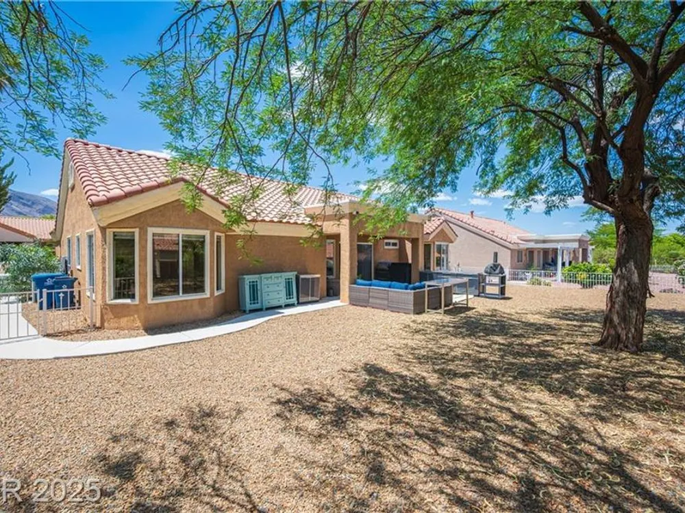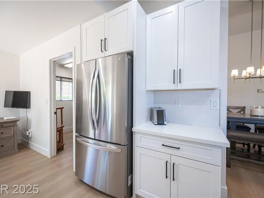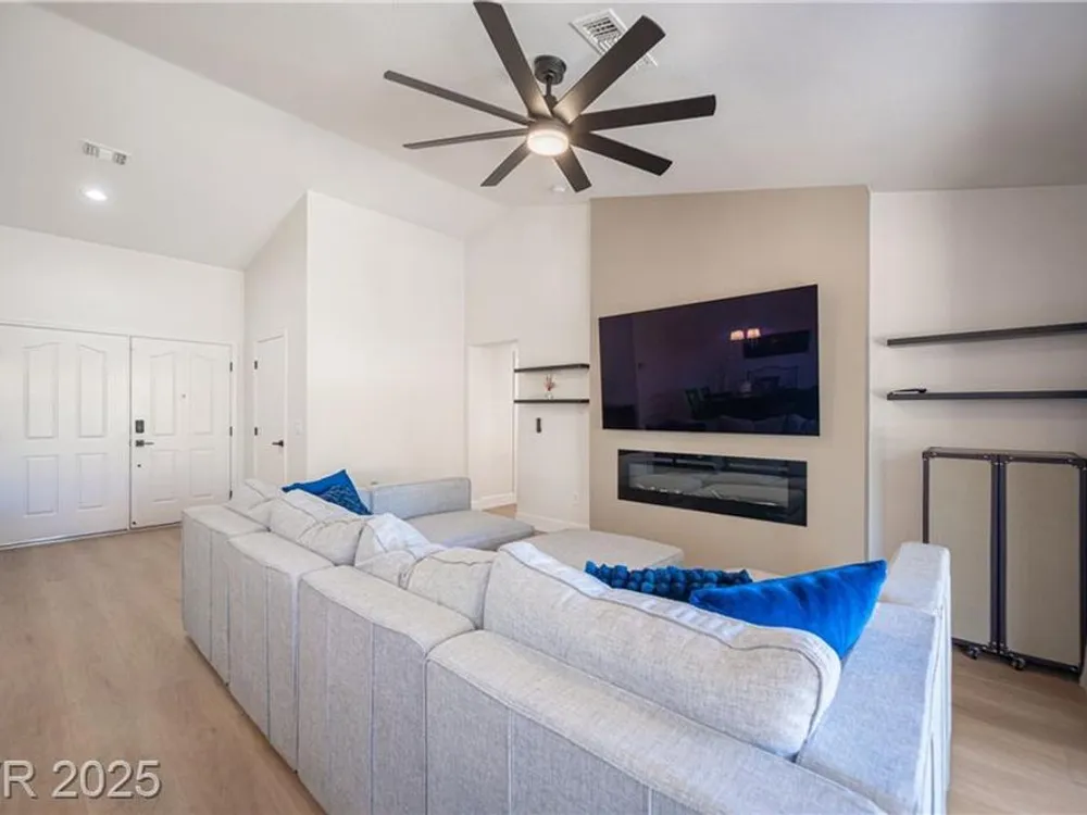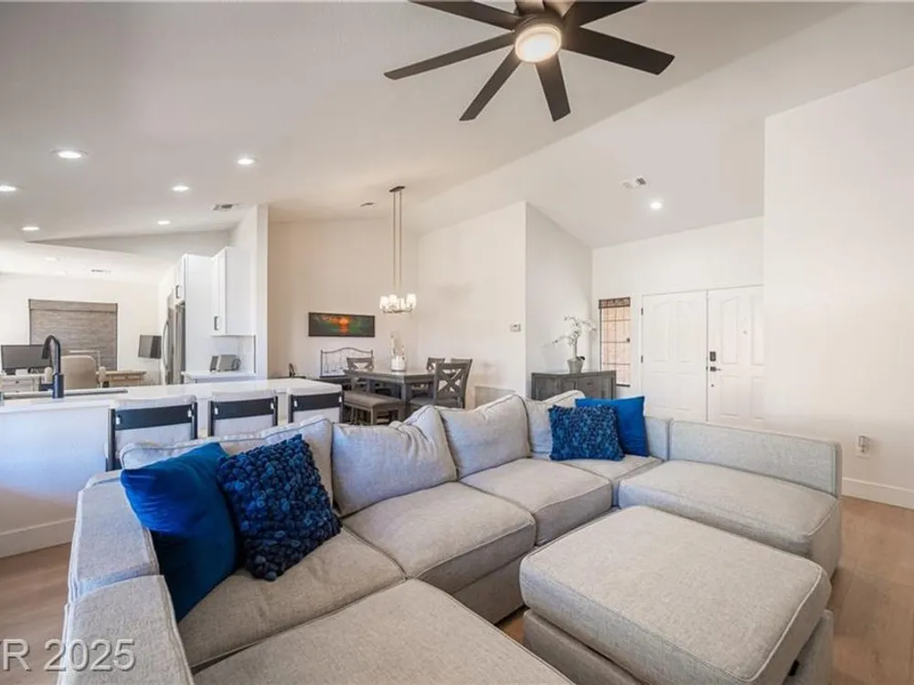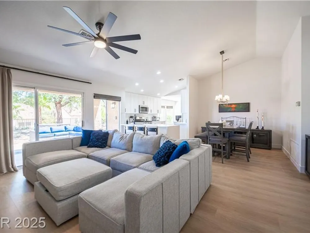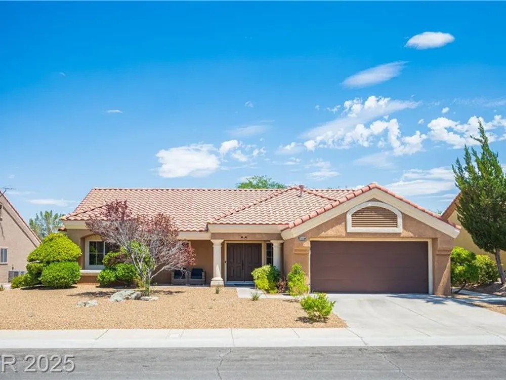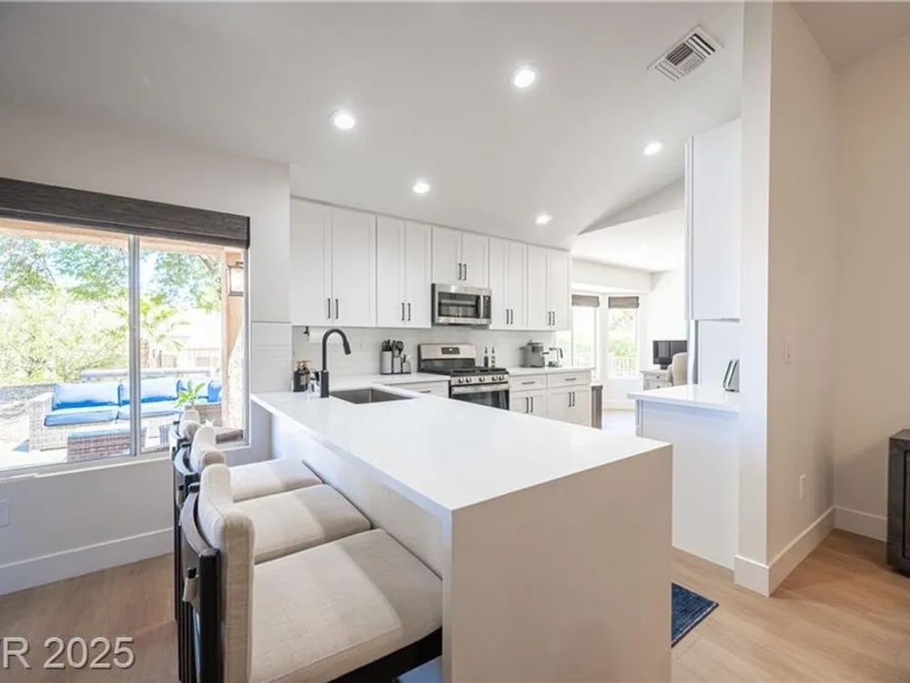 Welcome to your Sun City Summerlin oasis, completely transformed with modern design and functionality. The redesigned kitchen, featuring vaulted ceilings and a peninsula that overlooks the living room and new fireplace, creates an open and inviting layout. Upgrades include new 42" white shaker cabinets, white quartz countertops, a subway tile backsplash, and brand-new appliances. New luxury vinyl wood plank floors, plush bedroom carpet, and 5.5-inch baseboards. Both bathrooms have been remodeled, with the primary bathroom featuring a shower lined with large 16x48 porcelain tiles accented by a hexagon-pattern niche and flooring. Sleek black matte faucets in the kitchen and bathrooms complement the new hardware, mirrors, and finishes found throughout. The cohesive design extends to the new ceiling fans, stylish light fixtures, and LED recessed lights. Outside, the front and back yards have been landscaped with a new irrigation system and rock coverage, completing this move-in-ready home.