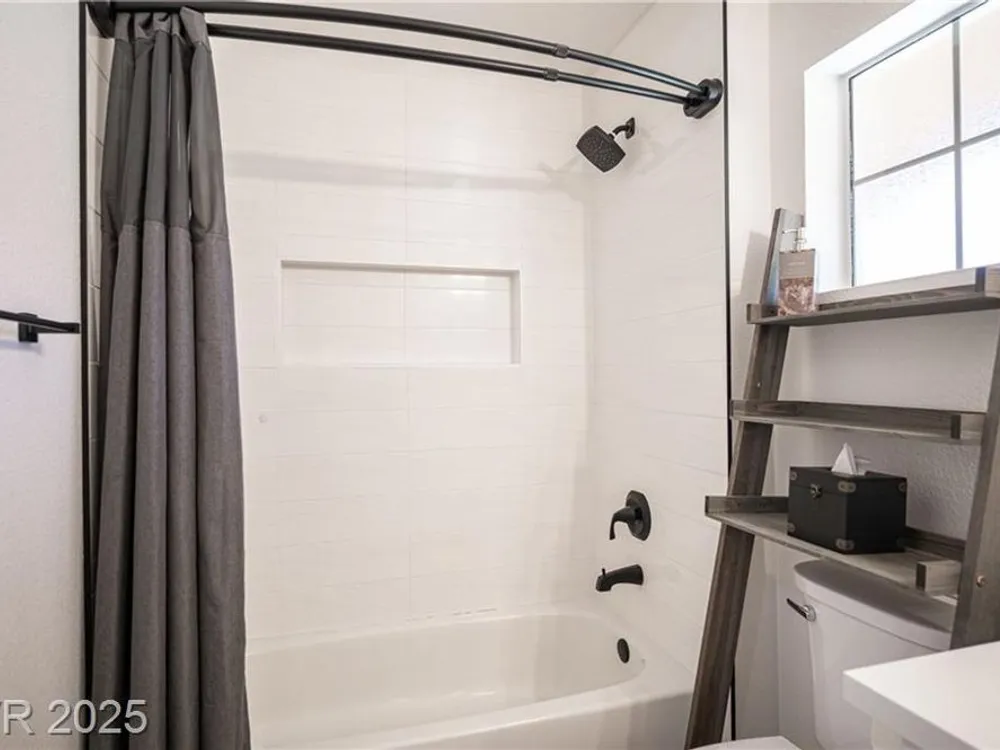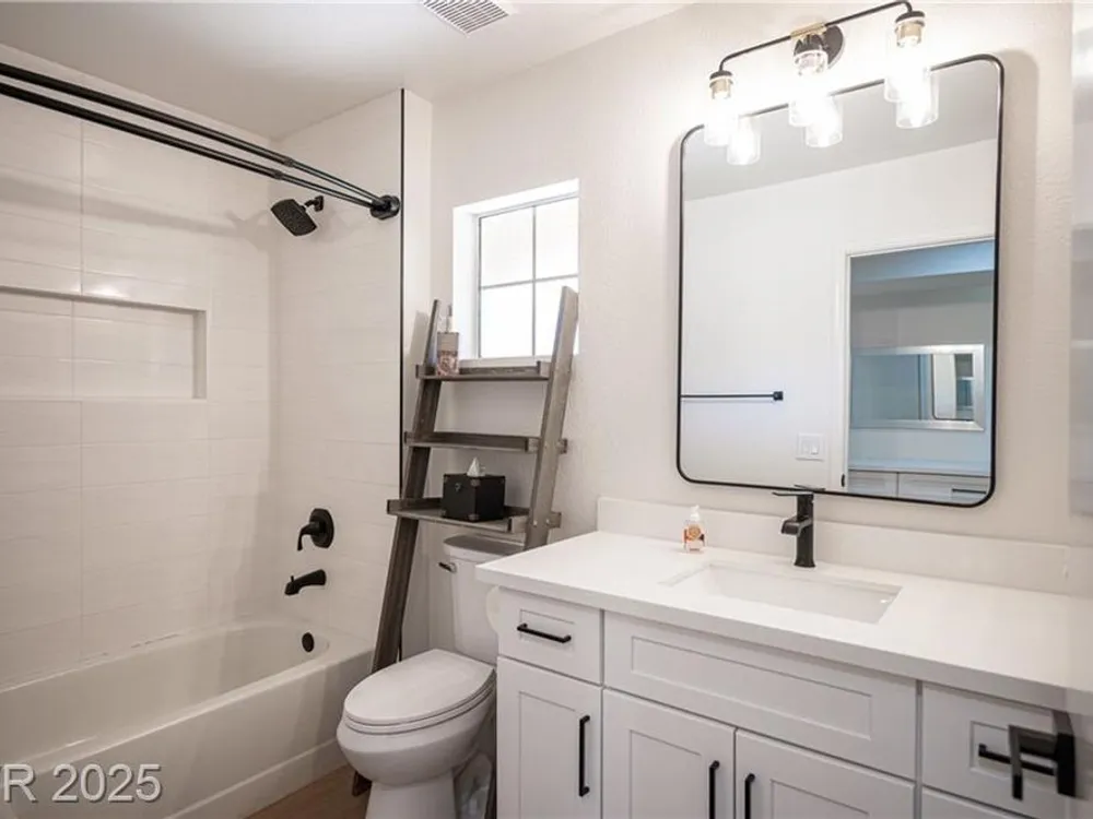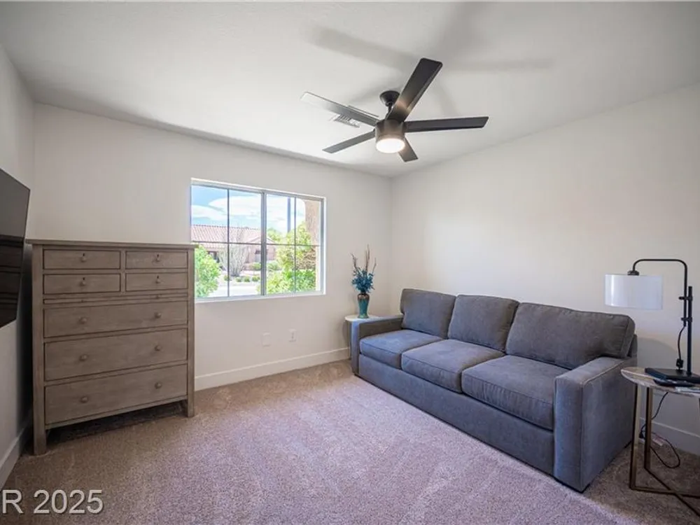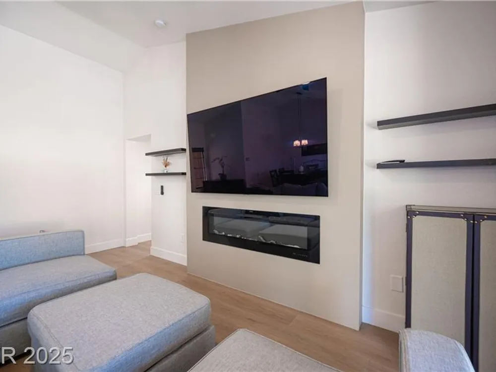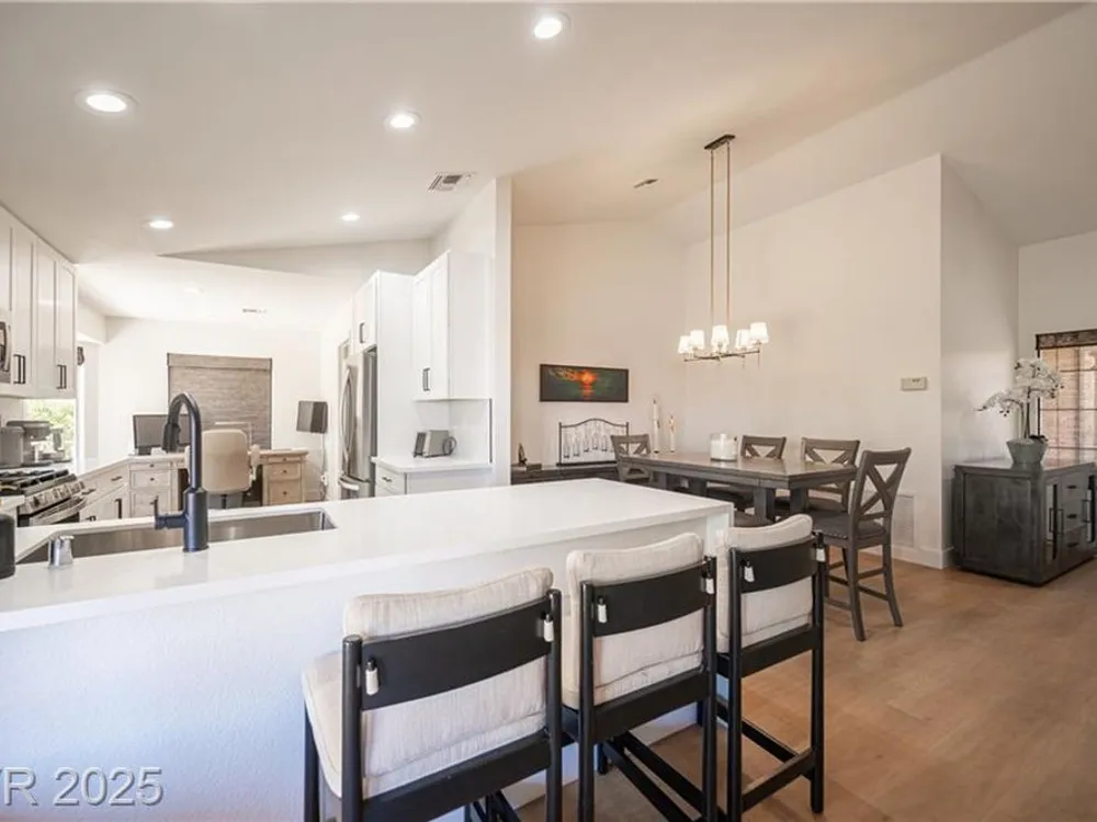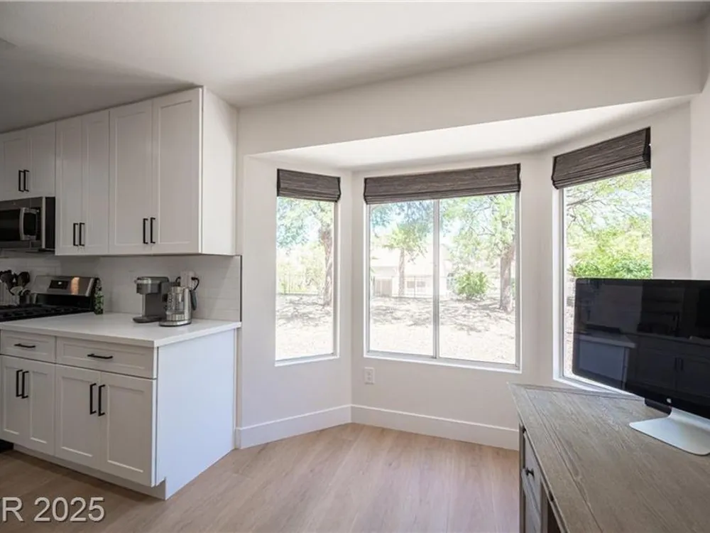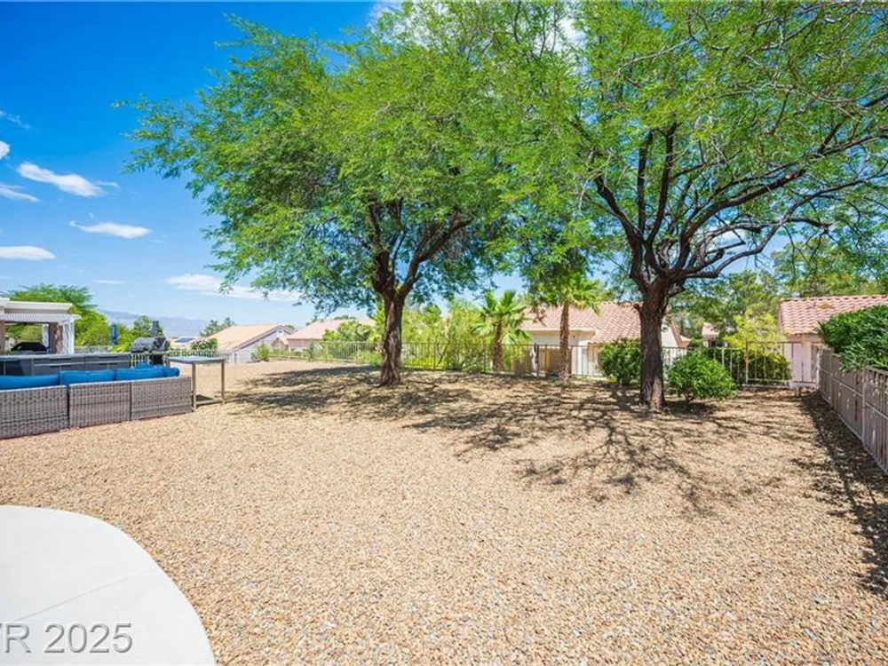 Welcome to your Sun City Summerlin oasis, completely transformed with modern design and functionality. The redesigned kitchen, featuring vaulted ceilings and a peninsula that overlooks the living room and new fireplace, creates an open and inviting layout. Upgrades include new 42" white shaker cabinets, white quartz countertops, a subway tile backsplash, and brand-new appliances. New luxury vinyl wood plank floors, plush bedroom carpet, and 5.5-inch baseboards. Both bathrooms have been remodeled, with the primary bathroom featuring a shower lined with large 16x48 porcelain tiles accented by a hexagon-pattern niche and flooring. Sleek black matte faucets in the kitchen and bathrooms complement the new hardware, mirrors, and finishes found throughout. The cohesive design extends to the new ceiling fans, stylish light fixtures, and LED recessed lights. Outside, the front and back yards have been landscaped with a new irrigation system and rock coverage, completing this move-in-ready home.