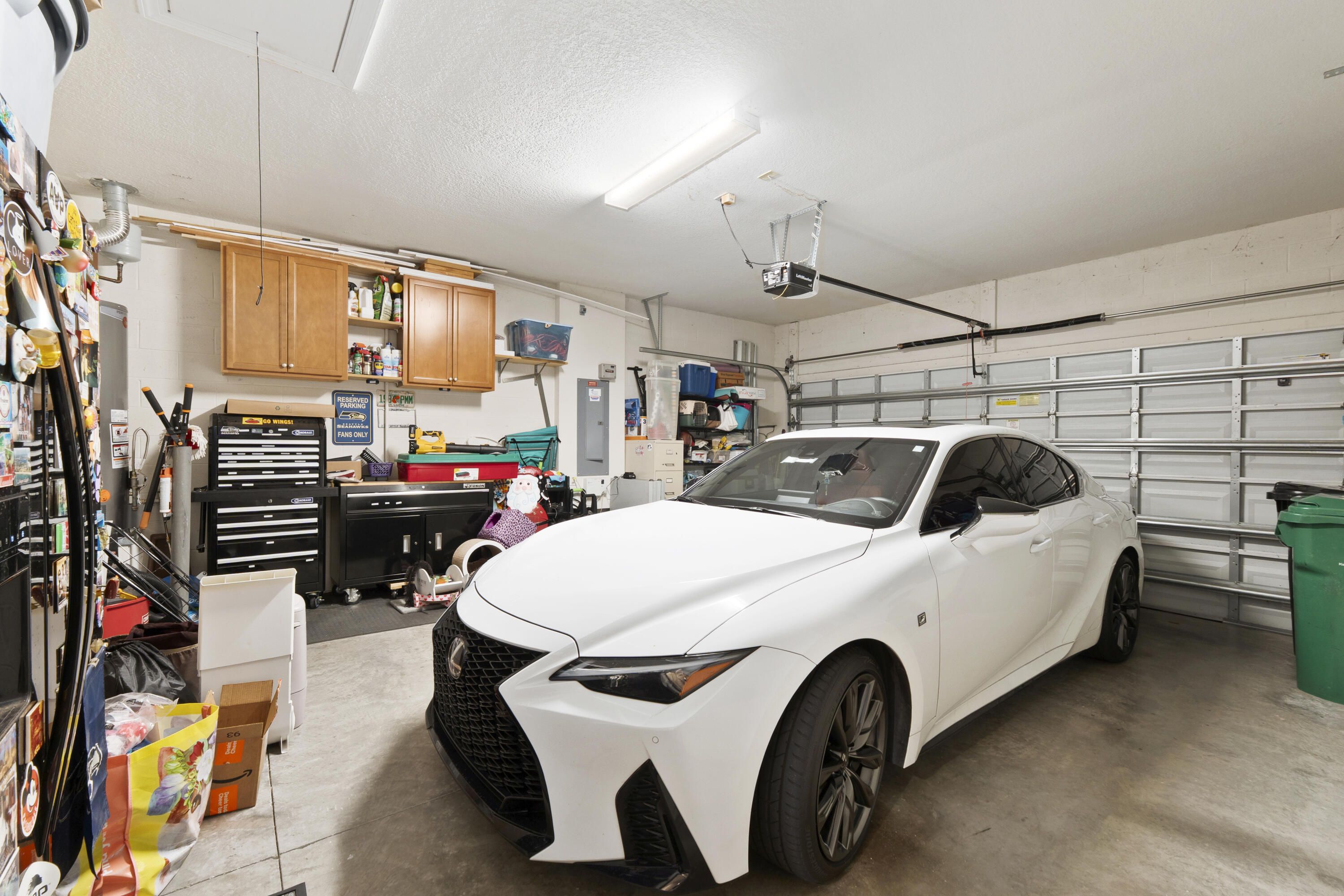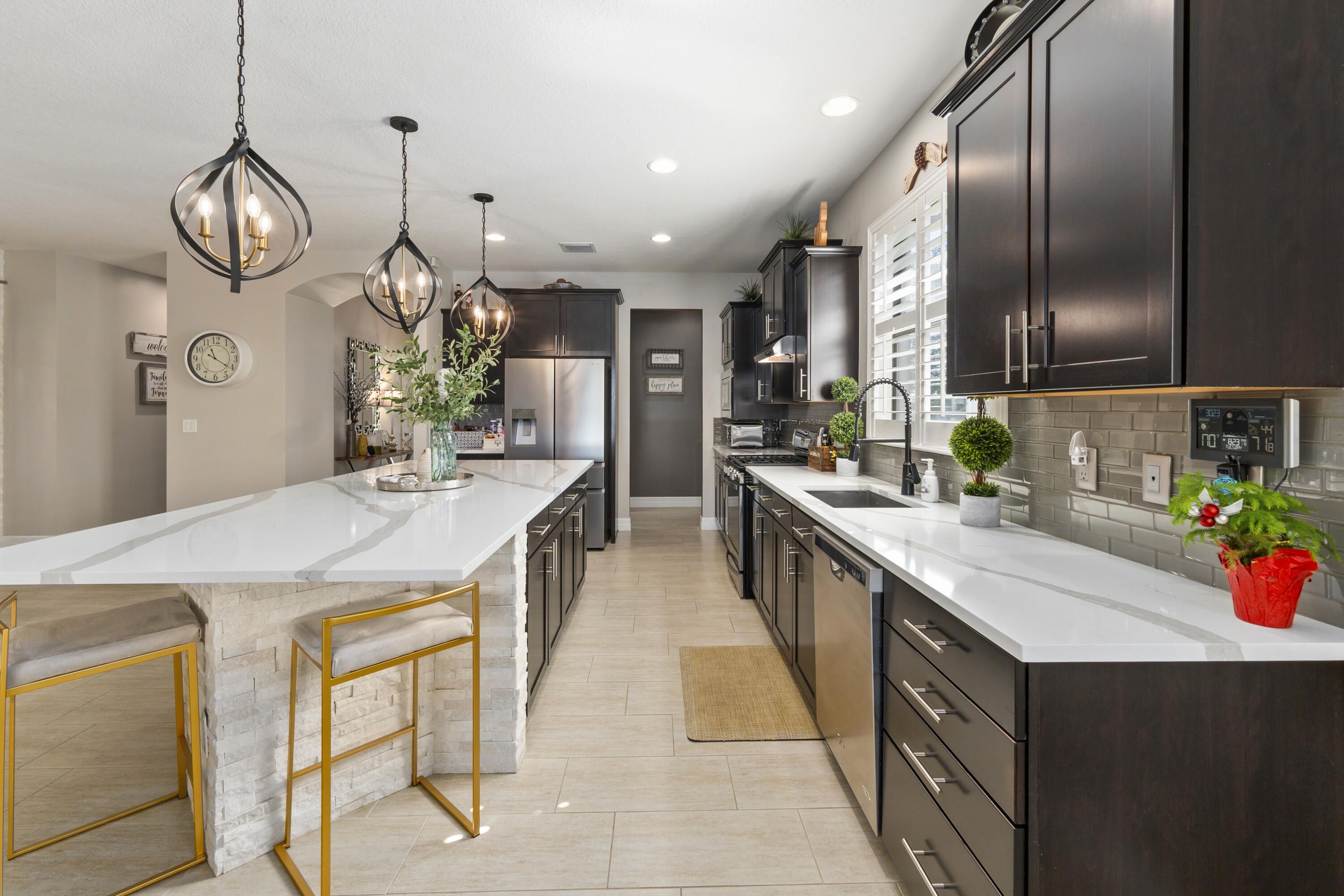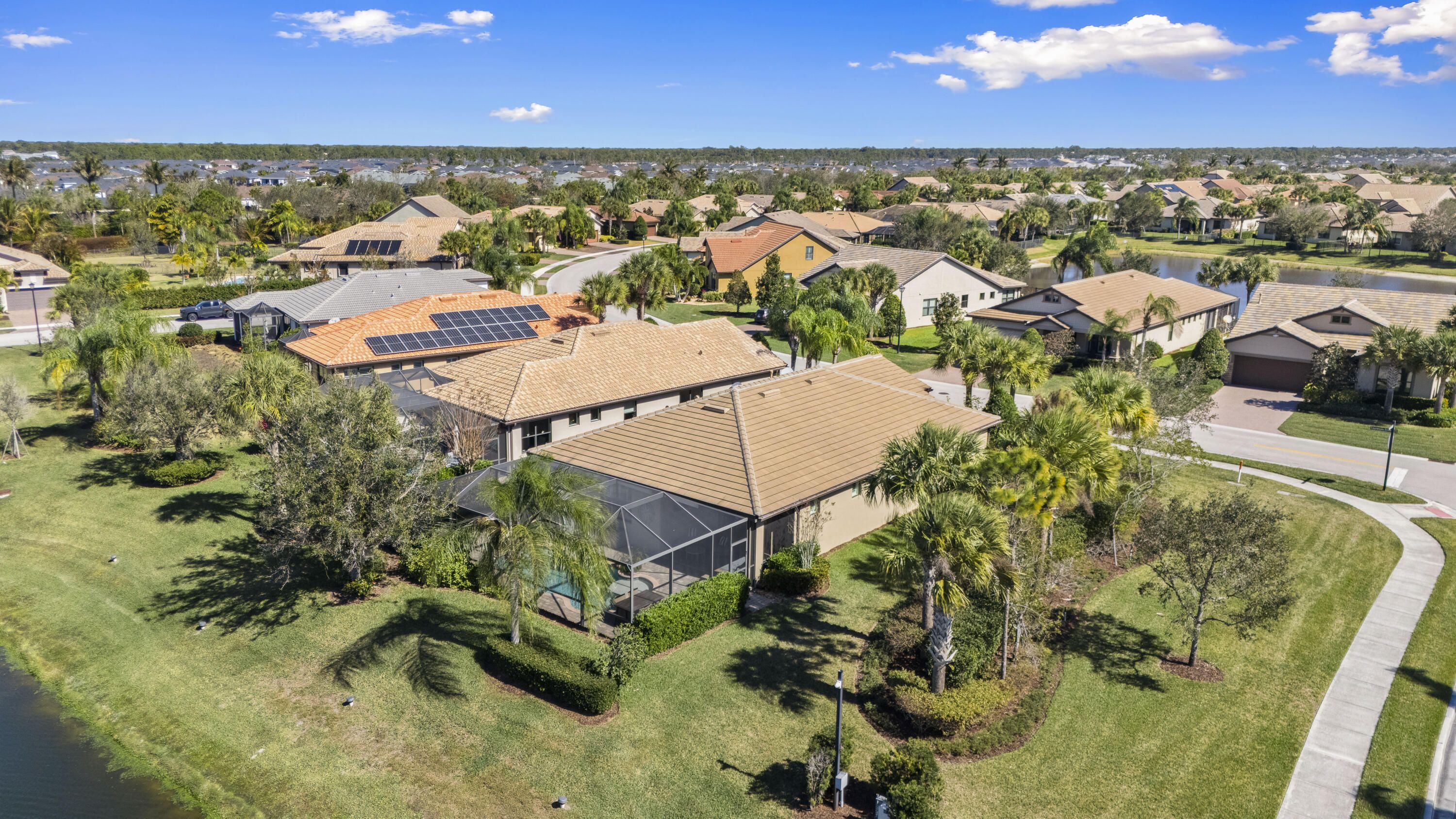 CBS 3Bed +Office 2Bath Extended 2 Car Garage, situated on corner lot long lake views. Screen Enclosed swimming pool with paver patio. Island Kitchen features 36'' Espresso cabinets with roll out trays, crown molding, Quartz counters, tile backsplash, Stainless Steel appliances, walk-in pantry has custom shelves, gas range, dry bar area with beverage cooler. Special features include, 16KW Generac whole house generator, high ceilings, Plantation shutters, custom ceiling fans, lighting & large title floors, stone accent wall in dining room & bench with shiplap in the drop zone by garage. Primary suite features wood look tile floors & tray ceilings. Walk-in closet has built-in custom cabinetry. Main bath has dual sinks & spacious tiled shower with massage jets. Comm Pool, Clubhouse, Tennis &