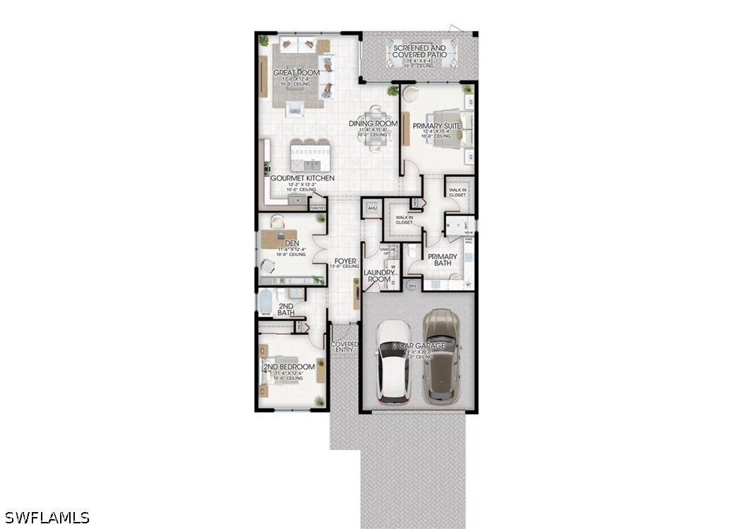 Welcome to luxury living in Valencia Sky—Naples’ newest premier 55+ community, where modern design meets resort-style living. This brand-new construction home, estimated for completion in October/November, offers 1,805 square feet of thoughtfully designed living space with a highly desirable southern exposure, filling the home with natural light throughout the day. Featuring 2 bedrooms, 2 bathrooms, a versatile den, and an expansive great room, this residence is perfectly designed for both everyday comfort and effortless entertaining. The open-concept layout flows seamlessly into a beautifully appointed kitchen, showcasing European-style frameless cabinetry with 42” uppers in designer-selected finishes, sleek quartz countertops with a coordinating backsplash, and an upgraded GE appliance package complete with a 36” hood. A stainless steel dual-compartment undermount sink adds both function and style. The spacious primary suite serves as a private retreat, offering two walk-in closets, a double vanity, and a beautifully tiled walk-in shower. Every detail has been carefully considered to provide both comfort and sophistication. Additional highlights include impact-resistant windows and sliding glass doors for peace of mind, along with a 2-car garage for added convenience. Located in one of Naples’ most exciting new active adult communities, residents of Valencia Sky will enjoy a vibrant lifestyle with world-class amenities, social activities, and a prime location close to everything Naples has to offer. This is your opportunity to own a brand-new home without the wait—secure your place in Valencia Sky today. *photos displayed are of the model home, not the actual home.