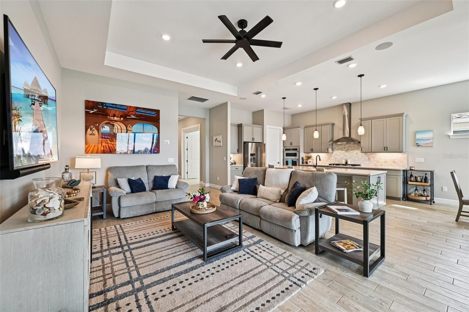 ****Seller is offering a $5,000 closing cost concession if the transaction closes by 12/31**** Discover your own paradise -this gorgeous home has it all. Enjoy your evenings sitting poolside in this upgraded Prestige model home with a waterview and amazing sunset views. Step inside and you’ll immediately notice the thoughtful upgrades and welcoming flow. The gourmet kitchen is a chef’s dream — quartz counters, 42" custom cabinets, built-in pantry, and KitchenAid stainless appliances (including a 5-burner gas cooktop). Porcelain tile runs throughout the common areas, and the 10' ceilings plus 8' interior doors add a sense of openness and sophistication. Storage is abundant with built-in cubbies, custom cabinets, Cheyenne-style interior doors, and generous walk-in closets. Your lanai overlooks the water and is a perfect spot to sip coffee in the morning or unwind while watching nature drift by. And yes — the saltwater pool and spa are yours to enjoy in private luxury. Tech-savvy buyers will love the built-in Sonos in the gathering room and lanai, Sonos amplifiers (convey), Wi-Fi access points, MyQ garage door system, Zodiac iAqualink pool automation, Cat-6 wiring, and pre-installed TV mounts. The garage has been upgraded with epoxy flooring, and the home includes six new Hunter ceiling fans, tray ceilings, and plumbing/gas hookup ready for your outdoor kitchen idea. Outside, the curb appeal delivers: paver-style driveway, low-maintenance tile roof, 4-foot extension on the garage, upgraded lighting, and lush landscaping all around. Best of all — this home was untouched by water intrusion during the 2024 storms. All of this in a community built for active, vibrant living: 10 pickleball courts, 5 tennis courts, 6 bocce courts, a community garden, dog park, clubhouse, saltwater pool, hot tub, fitness center, firepit, and more. A brand new (April 2025) tiki-style poolside bar and grill are ready for you. The Waterline Restaurant, which will be an upscale restaurant, will be opening soon. Beachwalk is just under 2.5 miles from Manasota Beach and minutes from downtown Venice and Englewood — fantastic for shopping, dining, and local flavor. The community runs on natural gas, has no CDD fees, and offers a surprisingly affordable HOA for the amenities involved. Move into an exquisite home that already has all the upgrades in place. Schedule your private tour today — your sunset view awaits.