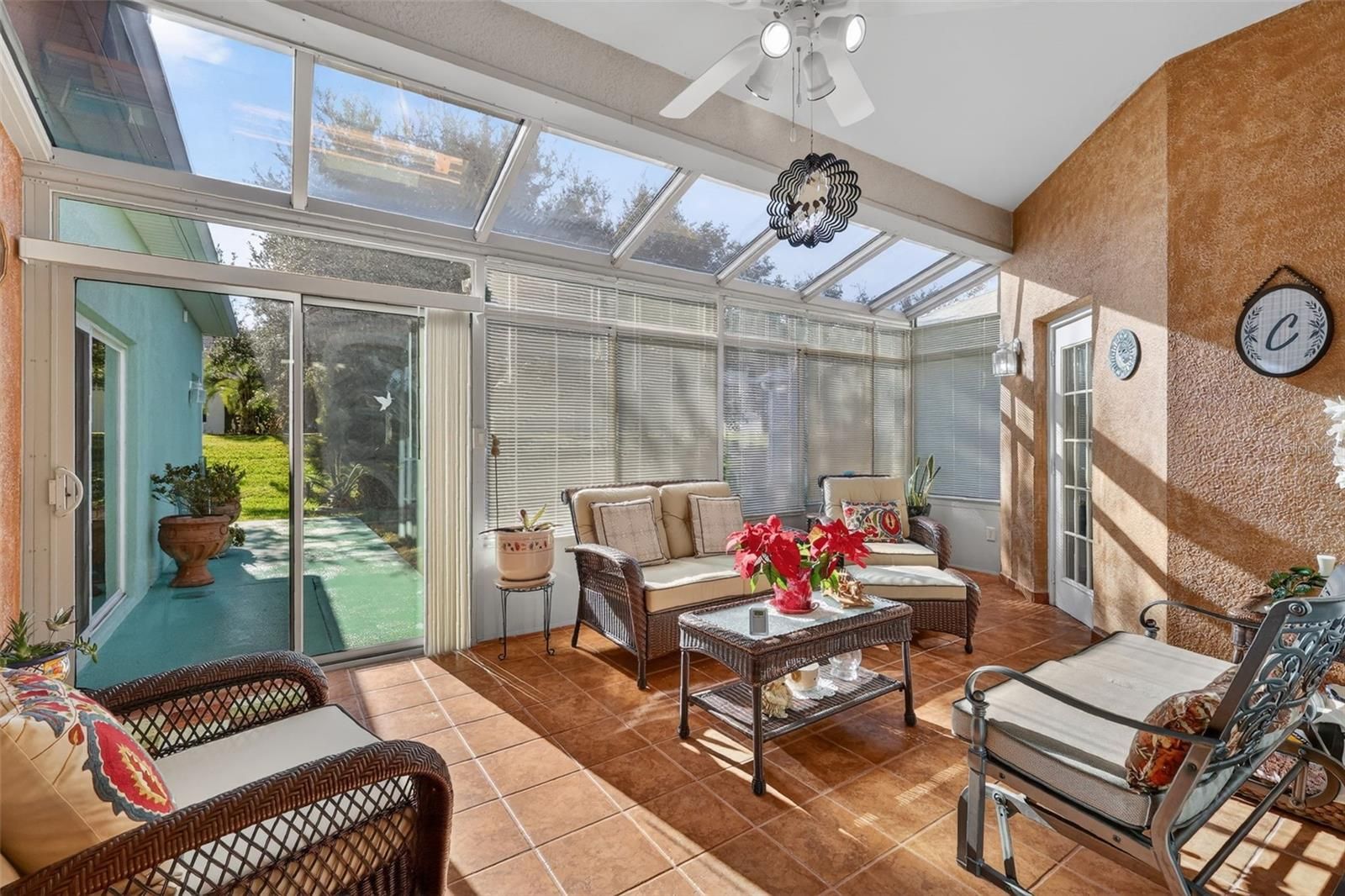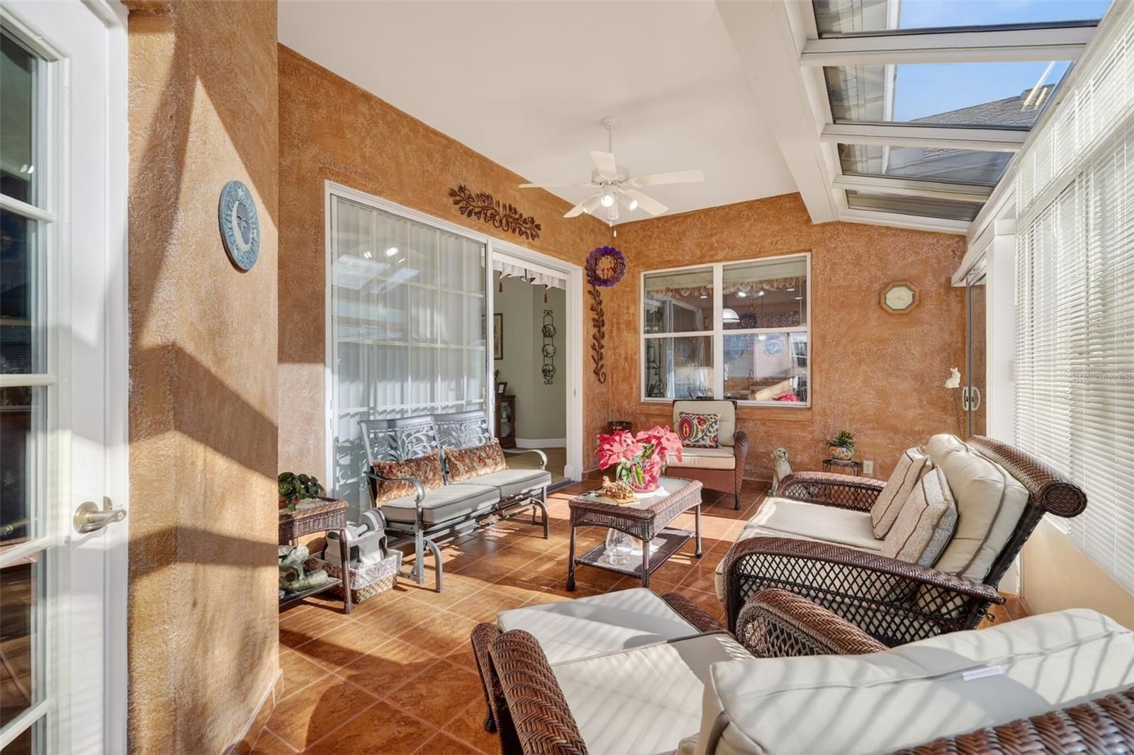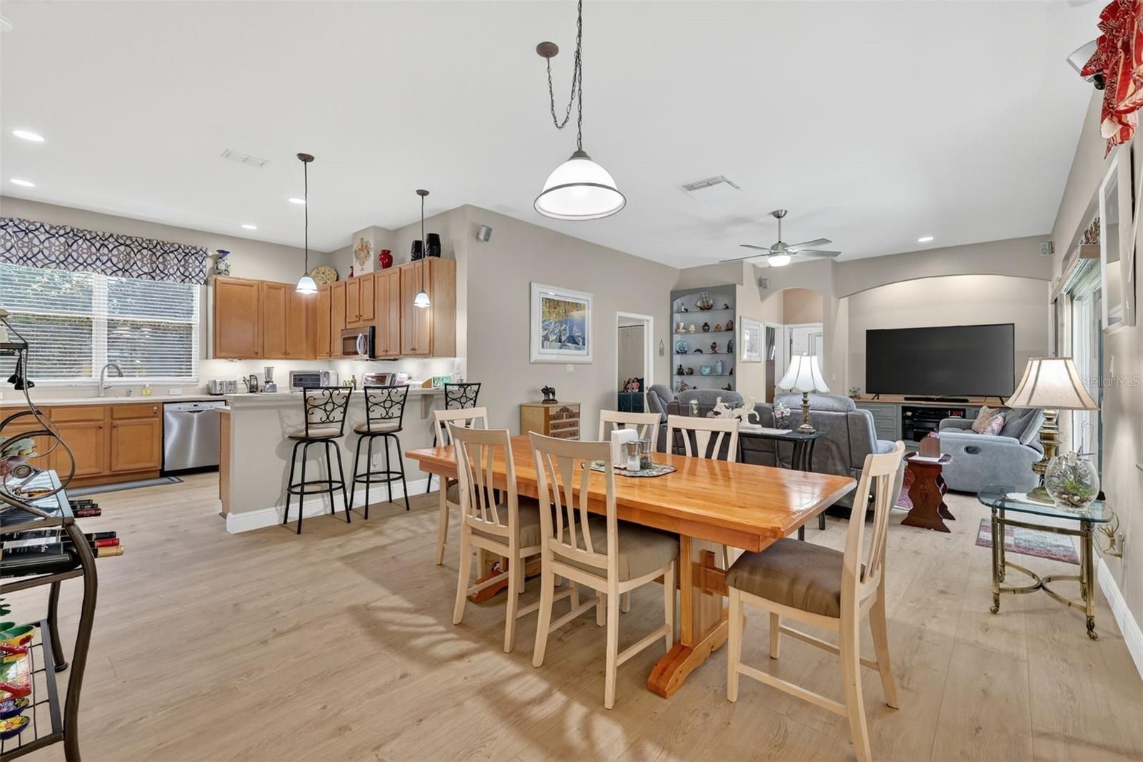 Discover the perfect blend of comfort and elegance in this meticulously maintained Bird of Paradise home, offering 3 bedrooms, 2 baths, and a dedicated office with a stylish workspace. The third bedroom even features a built-in desk for added versatility. An extended, enclosed lanai (added in 2008) creates a stunning Florida room, while the oversized 2.5-car garage provides ample space for vehicles and a workshop and/or golf cart. The kitchen is a chef’s delight, boasting recessed lighting, 42” maple cabinets with under-cabinet lighting, upgraded stainless steel appliances, Corian countertops, a new garbage disposal, a spacious breakfast bar, and a cozy dining area. The inviting family room features custom built-in cabinetry and surround sound, while the utility room offers generous storage, a utility sink, and a high-end washer and dryer. Additional highlights include double-pane windows with 3M hurricane protection, tailored foam insulation, and R30 insulation over the lanai and garage. Recent updates include New durable heavy domestic Finfloor lifetime warranty laminate flooring throughout the home (2025), new Goodman HVAC system (2025), a new roof (2022), front entry screen enclosure (2015), under cabinet lighting in kitchen, office, and utility room, and LED lighting throughout. The block/stucco exterior has been freshly painted ensuring excellent curb appeal. Nestled in the gated, beautifully landscaped 55+ community of The Plantation at Leesburg, this home grants access to resort-style amenities, including: tennis, pickleball, shuffleboard, bocce, horseshoes, three pools with hot tubs, three clubhouses, two golf courses, a driving range, a putting green, exercise rooms, a sauna, an outdoor kitchen pavilion, lots of social activities, entertainment, and clubs Plus, enjoy the convenience of a restaurant, diner, medical clinic, cigar lounge, nail salon, thrift shop, and place of worship—all within a short golf cart ride! Experience the best of Florida living—schedule your showing today!