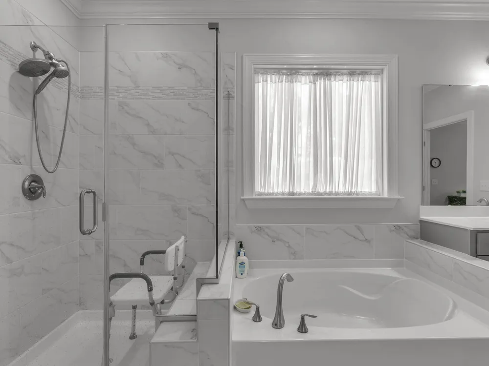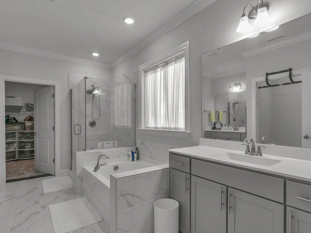 - Tub Shower, Breakfast Bar, Double Vanity, Eat-in Kitchen, Entrance Foyer, High Ceilings, High Speed Internet, Kitchen Island, Living/Dining Room, Open Floorplan, Pantry, Master Downstairs, Quartz Countertops, Recessed Lighting, Separate Shower, Smooth Ceilings, Storage, Walk-In Closet(s), Walk-In Shower, Water Closet(s)