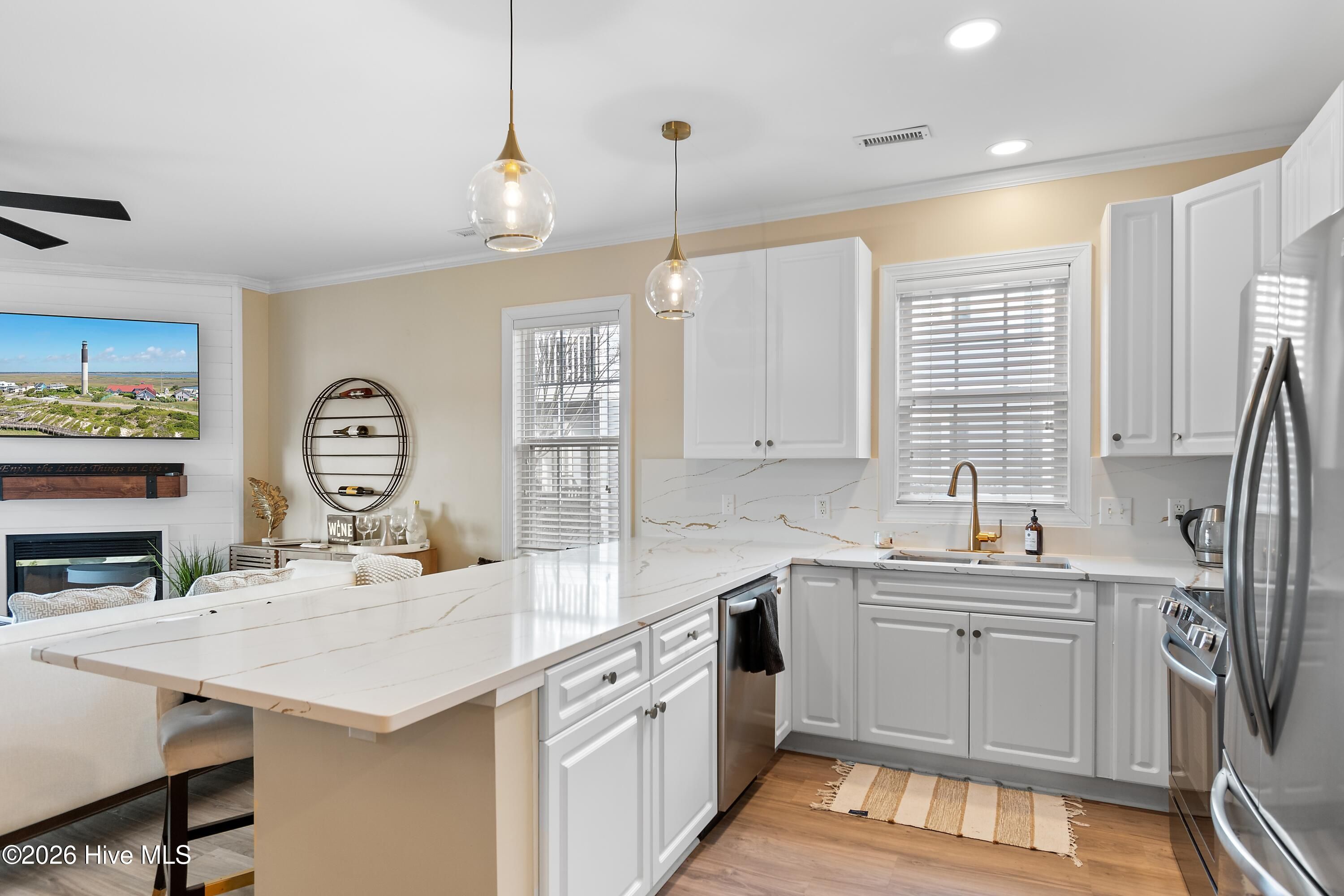 Wake up to panoramic views of St. James Marina from this beautifully updated 1st floor Shipwatch condo in St. James Plantation. Ideally located in one of Southport's most desirable gated communities, St. James Plantation. This 3-bedroom, 3-bathroom residence offers the perfect blend of coastal charm and low-maintenance living. The third bedroom/bathroom doubles as a lockout with its own private entrance and kitchenette. Step inside to find an open-concept living area filled with natural light and a private screened porch that's perfect for enjoying your morning jo and evening cocktails while watching boats come and go. New impressive upgrades you will love include flooring, quartz countertops, appliances, toilets, vanities, plumbing and lighting fixtures, ceiling fans, fireplace mantel, garbage disposal, hardware, HVACS and water heater in 2024. The spacious primary suite boasts water views, a walk-in closet, and an en-suite bath. A split floor plan offers privacy for guests or a home office. As part of St. James Plantation, you'll enjoy world-class amenities including multiple golf courses, a private beach club, fitness centers, pools, tennis courts, pickleball and miles of walking and biking trails. Want more? How about a full-service marina with Beacon 315 Restaurant and Tiki Bar, The Apothecary boutique pharmacy, kayak launch, dog parks, and an outdoor amphitheater just to name a few. Whether you're looking for a full-time residence, a vacation getaway, or an investment opportunity, this marina-front condo offers the best of coastal living in a vibrant community just minutes from historic downtown Southport and Oak Island's pristine beaches. Enjoy coastal living at its best and own a front-row seat of paradise on the water.