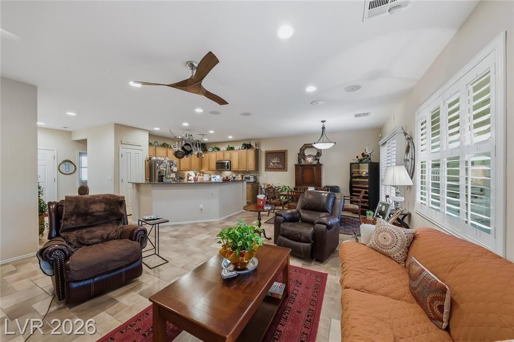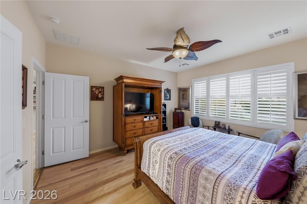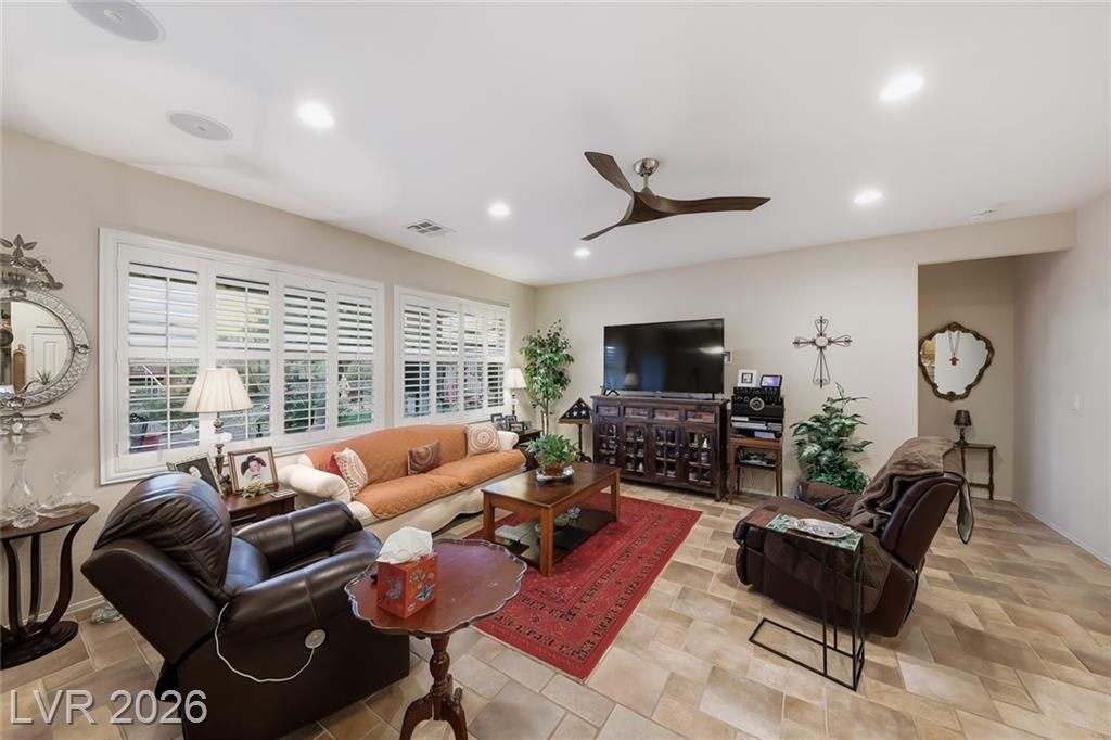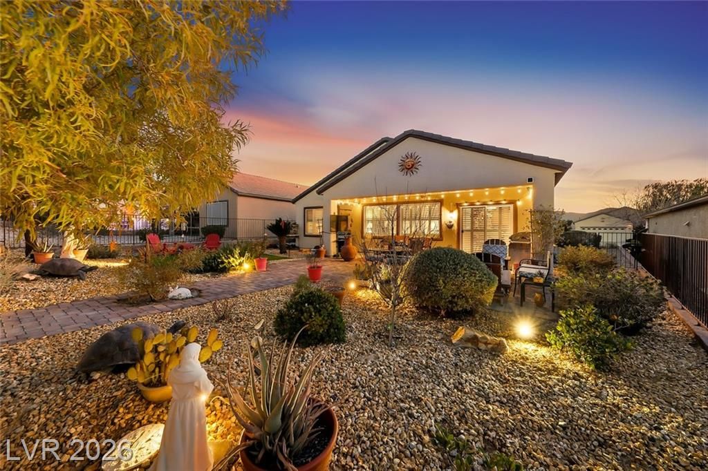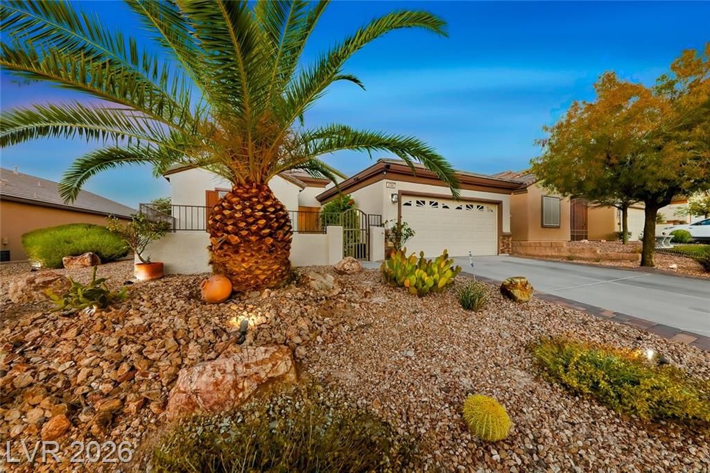 Move-In Ready Popular Whitney Open Floorplan with Great Room & Two Bedrooms plus Den! Great curb appeal with gated Front Courtyard Entry to enjoy the Mountain Sunsets. Entertainers Paradise on a large fully landscaped & fenced lot. Enjoy watching TV on the Covered Patio. Kitchen features Stainless Steel Appliances, Breakfast Bar, Pantry & rollout drawers. Custom tile & wood flooring throughout. Plantation Shutters. HVAC system replaced in 2020 & upgraded filtration system. Garage features built-in storage cabinets & overhead rack. Solera at Anthem is a beautiful active 55+ Del Webb community with views of the Black Mountains & the Las Vegas Valley. 24,000 sq.-ft clubhouse with fitness center & indoor swimming pool. The clubhouse offers a catering kitchen for hosting a small get-together & arts and crafts room. Four bocce ball courts & four tennis courts & outdoor spa. Lifestyle Director, Monthly Magazine & Social Calendar with Events & Clubs. It’s just not a Home; it’s a Lifestyle.