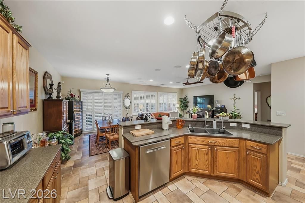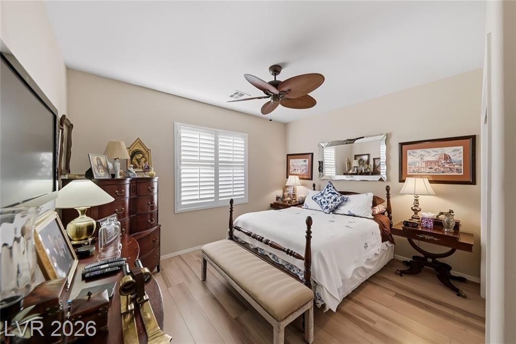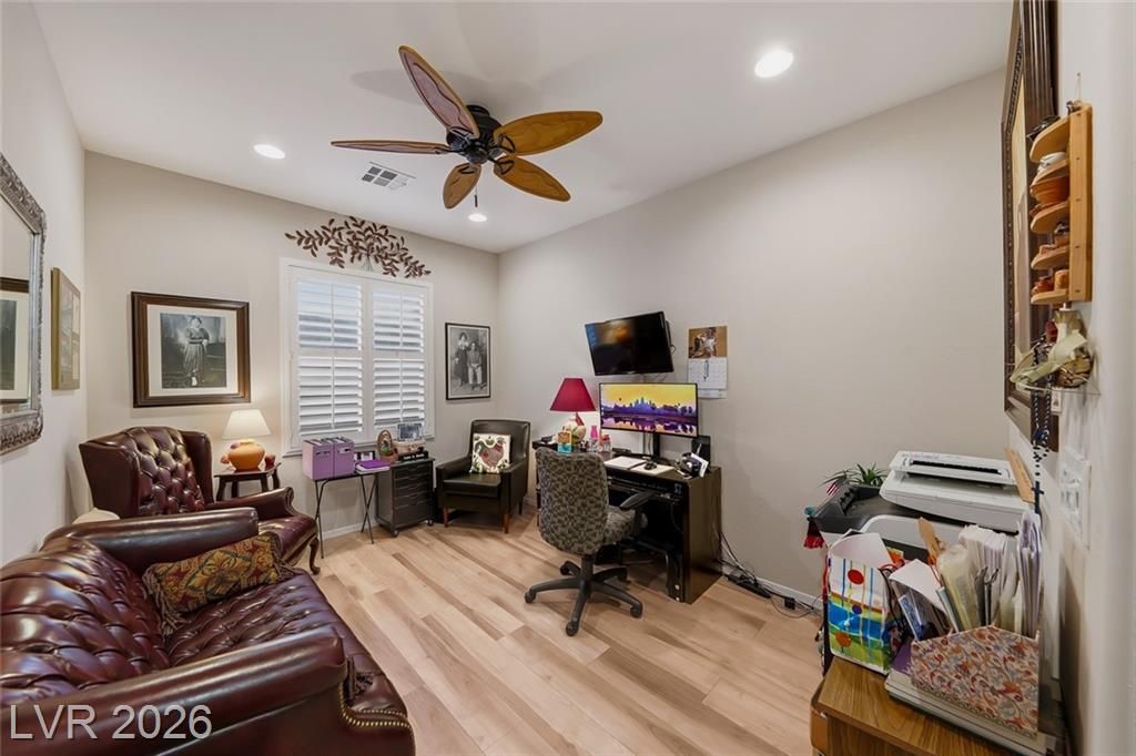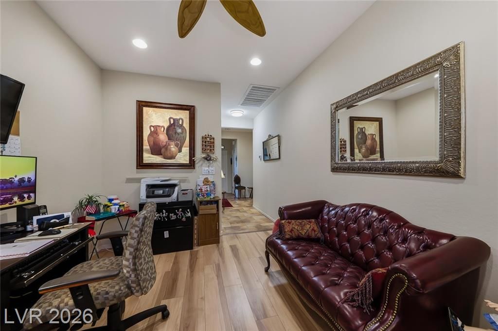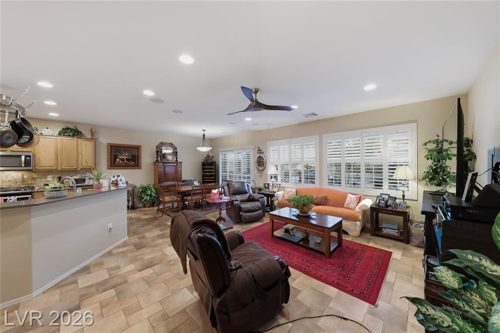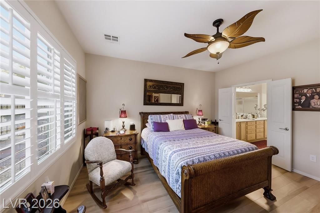 Move-In Ready Popular Whitney Open Floorplan with Great Room & Two Bedrooms plus Den! Great curb appeal with gated Front Courtyard Entry to enjoy the Mountain Sunsets. Entertainers Paradise on a large fully landscaped & fenced lot. Enjoy watching TV on the Covered Patio. Kitchen features Stainless Steel Appliances, Breakfast Bar, Pantry & rollout drawers. Custom tile & wood flooring throughout. Plantation Shutters. HVAC system replaced in 2020 & upgraded filtration system. Garage features built-in storage cabinets & overhead rack. Solera at Anthem is a beautiful active 55+ Del Webb community with views of the Black Mountains & the Las Vegas Valley. 24,000 sq.-ft clubhouse with fitness center & indoor swimming pool. The clubhouse offers a catering kitchen for hosting a small get-together & arts and crafts room. Four bocce ball courts & four tennis courts & outdoor spa. Lifestyle Director, Monthly Magazine & Social Calendar with Events & Clubs. It’s just not a Home; it’s a Lifestyle.