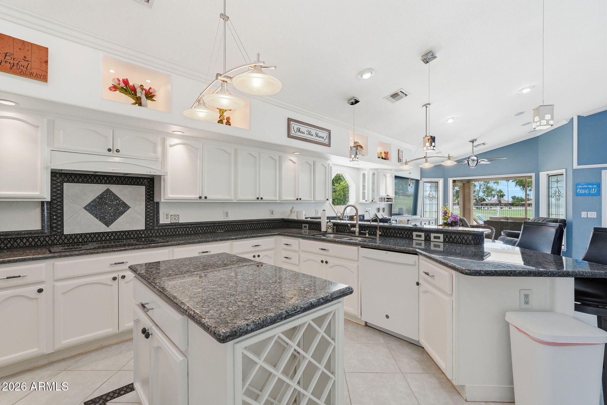 PRIME GOLF COURSE LOT on the 3RD HOLE in SUN LAKES PALO VERDE! This well-kept SINGLE LEVEL home offers a great layout, spacious living areas, and an ideal indoor/outdoor setup. Inside you'll find a sizable foyer, FLEX SPACE perfect for an office or hobby room, inviting living area with FIREPLACE, and an UPDATED KITCHEN featuring GRANITE COUNTERS, WHITE CABINETRY, quality appliances, WET BAR, DRY BAR, and ample storage. The PRIMARY SUITE offers backyard access, while the UPDATED PRIMARY BATH includes DUAL SINKS and a WALK-IN SHOWER. Step outside to your backyard retreat with a POOL, OUTDOOR KITCHEN, TRAVERTINE PATIO, RETRACTABLE STORM SHADES, and beautiful GOLF COURSE VIEWS.