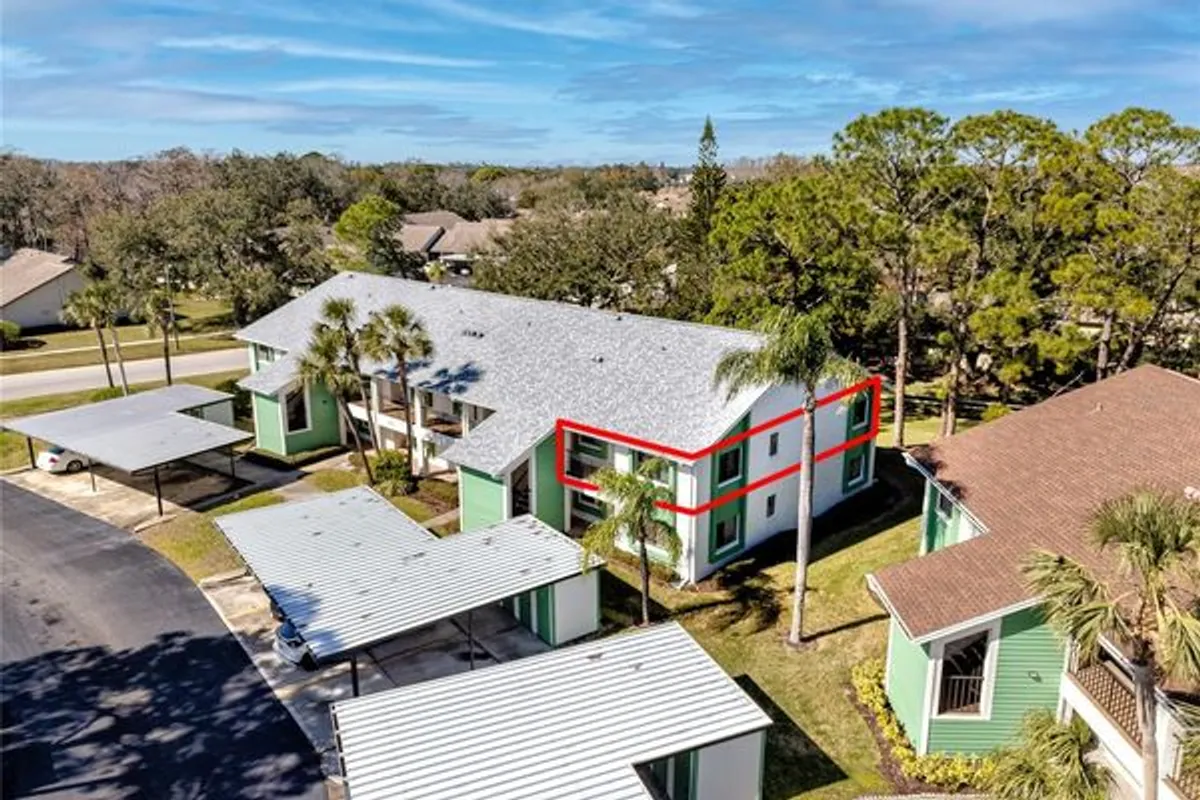Welcome to your new home in the CORNER UNIT of the 55+ community at Village on the Green, located in a non-flood and non-evacuation area of Pinellas County. This neighborhood boasts one of the highest elevations in Pinellas County. Moreover, as a two-story structure, this community is exempt from milestone inspections. This spacious and meticulously maintained second-floor condo includes a primary bedroom with an ensuite bathroom, a generous second bedroom with a bathroom in the hallway, an open concept living/dining area, a laundry room equipped with a full-size washer and dryer, a large kitchen, and a lanai that offers a stunning, private view of the mature landscaping. The condo features a carport for parking and a storage unit conveniently located at the front of the building. There are also ample guest parking spaces available nearby. The water heater and electrical panel have been recently upgraded, the air conditioning unit is just 5 years old, and the washer and dryer are brand new. The popcorn ceilings have been removed and replaced with knockdown ceilings, and the entire unit has been freshly painted. The HOA fee covers Cable TV, Common Area Taxes, Community Pool, Escrow Reserves Fund, Insurance, Exterior Maintenance, Grounds Maintenance, Manager, Pool Maintenance, Recreational Facilities, Sewer, Trash, and Water. Village on the Green is conveniently located near restaurants, Countryside Mall, and other major shopping centers. Clearwater and Honeymoon Island beach are only a 20-minute drive away. This unit is awaiting the new owner's personal touches. Schedule your showing today!