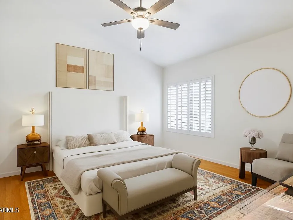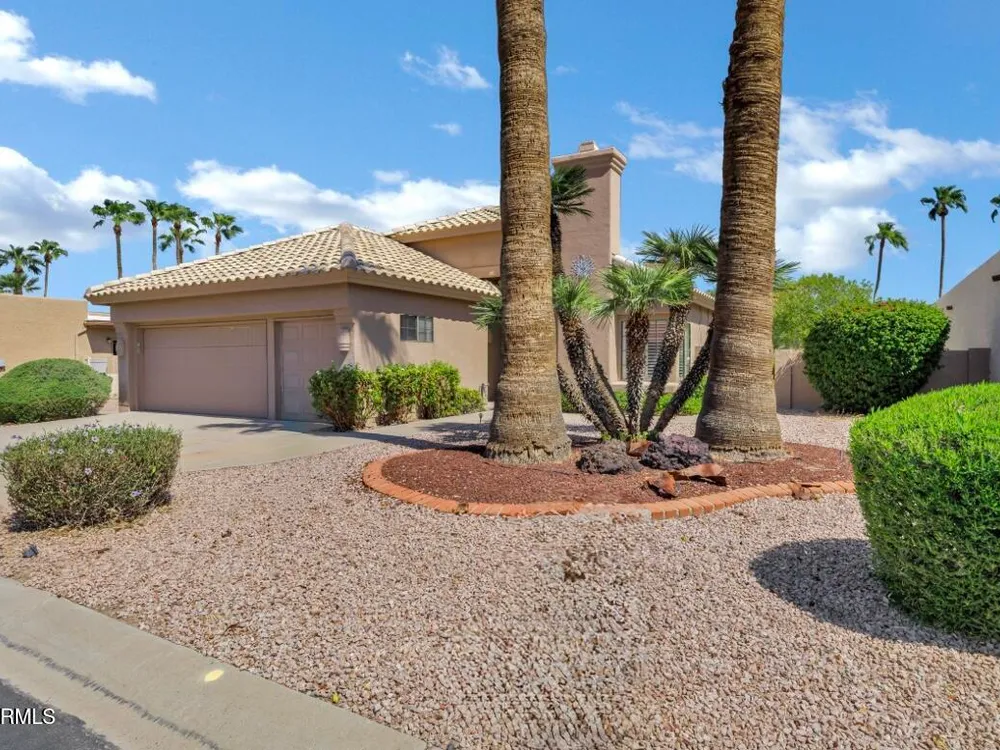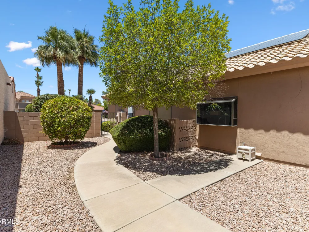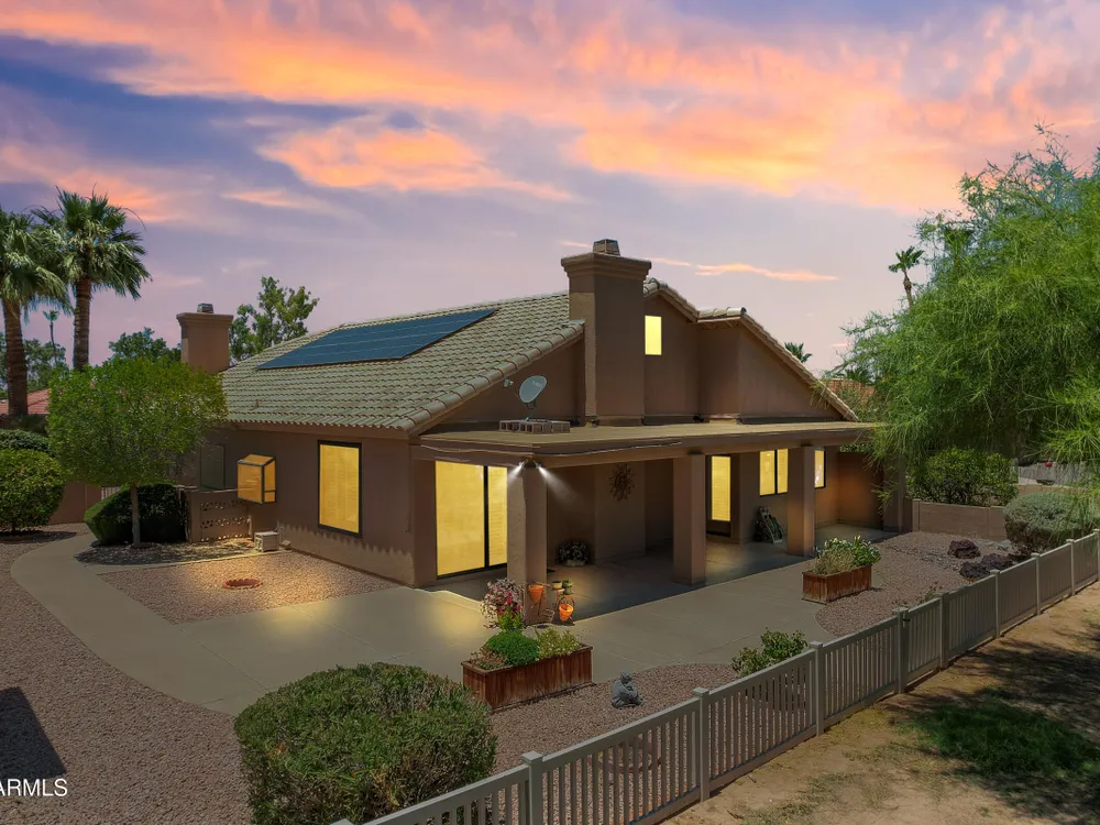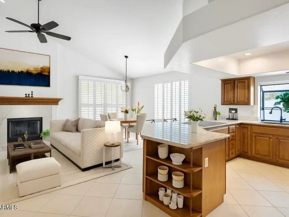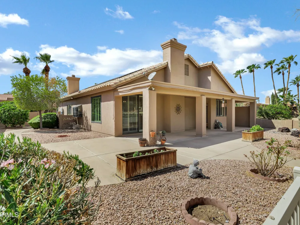 Beautiful home on a SPECTACULAR golf course lot, HOLE 10, in the guard-gated active adult community of Palo Verde in Sun Lakes. This 2-bedroom, 2-bathroom home offers over 2100+ square feet of comfortable living with a NEW HVAC system, OWNED SOLAR, NEW Water Heater, Water Softener, and Reverse Osmosis system, all updated in 2024. HOME WAS JUST FRESHLY REPAINTED ON THE INSIDE! Enjoy formal living and dining areas, a cozy great room with a fireplace, and a second fireplace in the front living room. Solid wood Plantation Shutters, Laminate Flooring, and abundant natural light add warmth and charm. The Kitchen is UPGRADED with Granite Countertops, DUAL KitchenAid Ovens, Stainless Steel Appliances, and a convenient Wet Bar. The oversized guest bedroom is perfect for visitors, a hobby room , or an office, with a beautifully updated Travertine bathroom nearby. The spacious Primary suite includes a Sizable walk-in closet, a Travertine walk-in shower, a separate jetted tub, and private backyard access. Take notice of the WIDENED hallways and doorways that create an open, easy-to-navigate space, perfect for WHEELCHAIR access. An extended 2.5-car garage with built-in cabinets offers plenty of space for vehicles, golf carts, or storage. The extra-wide lot provides additional outdoor space, ideal for gardening, outdoor entertaining, or the potential to add a future casita. Lovingly maintained by its ORIGINAL OWNER, this home offers comfort, quality, and the vibrant lifestyle of Palo Verde.