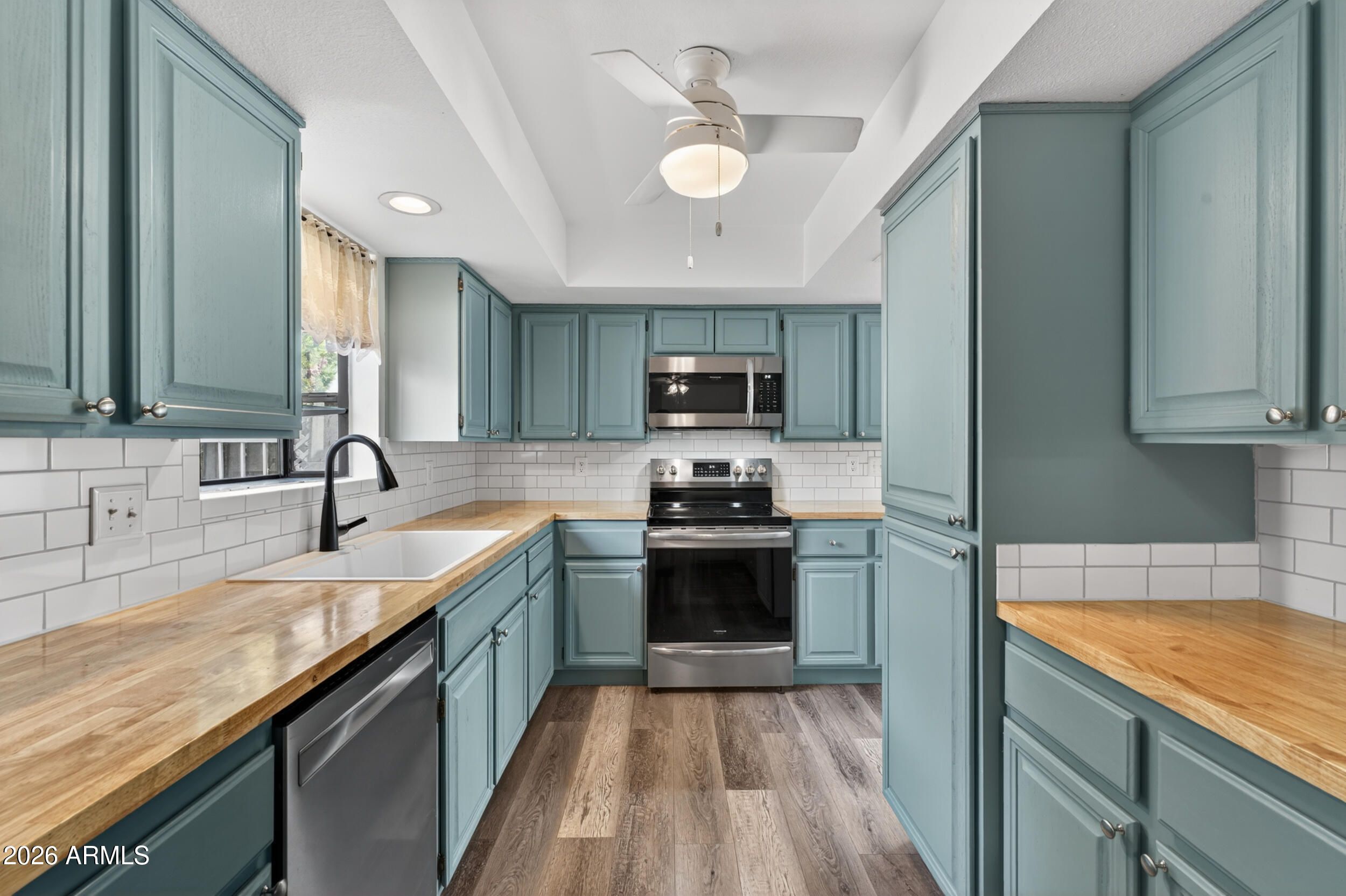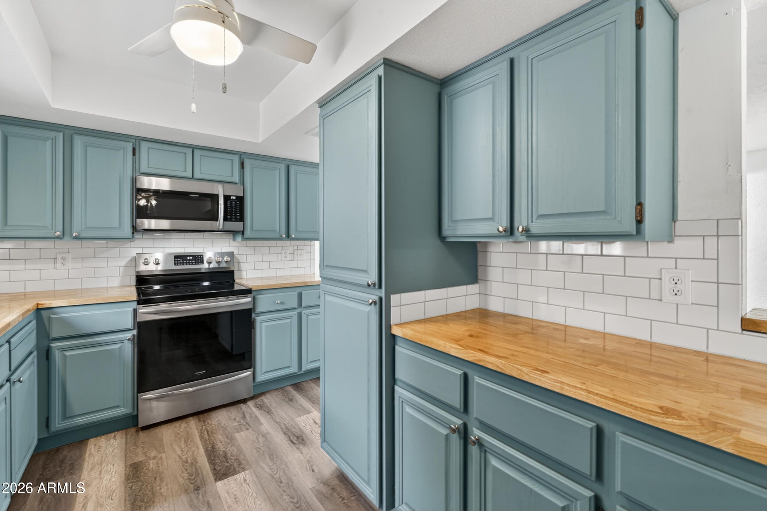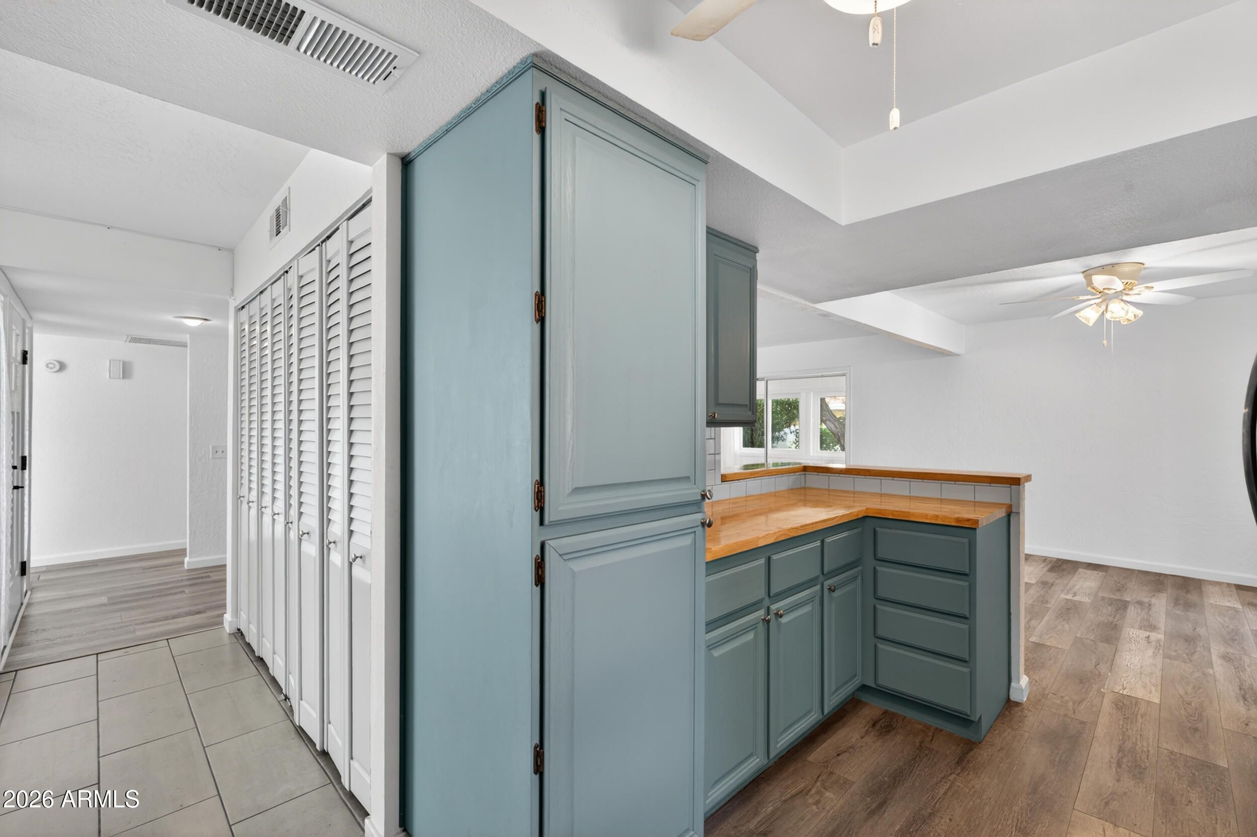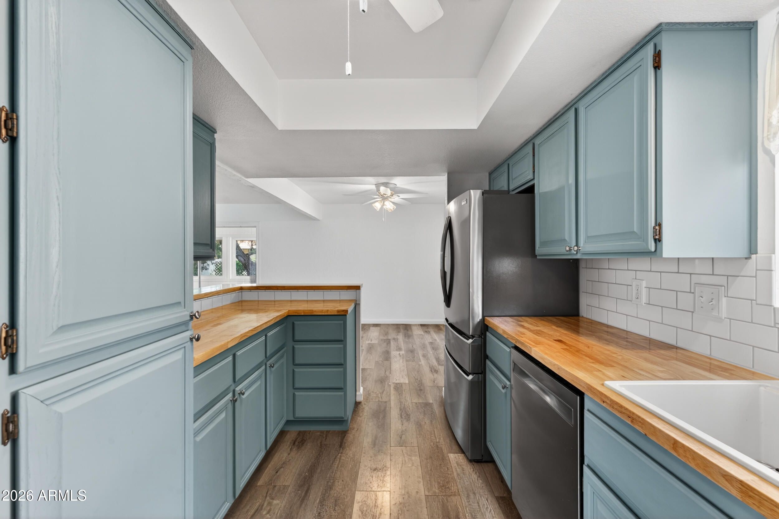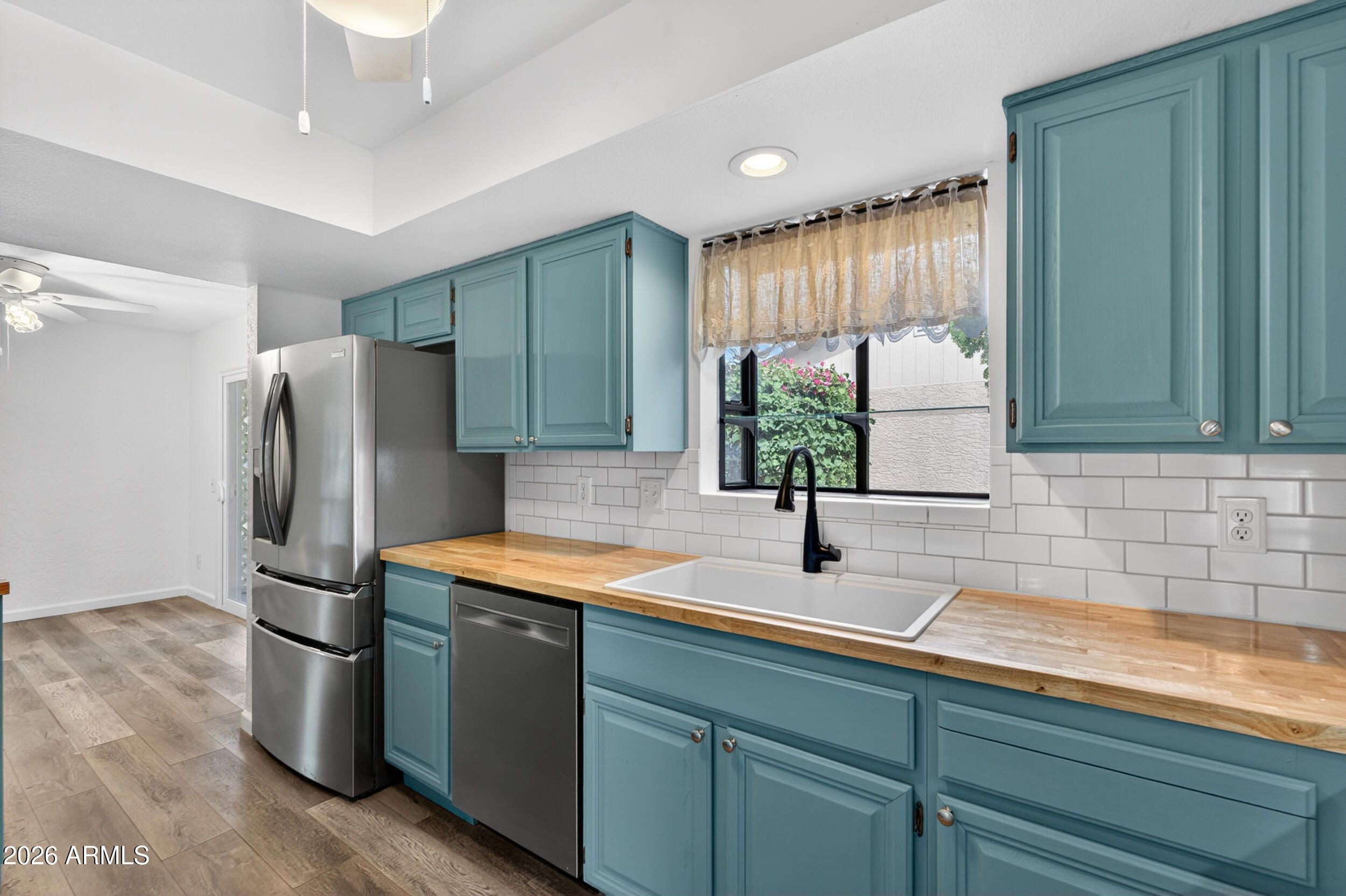 Stylish and move-in ready, this Sun Lakes home blends comfort with character in all the right ways. The open-concept layout flows effortlessly from the spacious living area into a beautifully refreshed kitchen featuring eye-catching cabinetry, warm butcher block counters, and a clean, modern backsplash. A versatile bonus room offers flexibility for a home office, hobby space, or additional living area. The primary suite provides a relaxing retreat, while the split layout adds privacy for guests. Step outside to a serene, low-maintenance backyard with mature landscaping, shaded patio space, and plenty of room to unwind or entertain. Located in a sought-after active adult community with resort-style amenities, this home delivers both lifestyle and livability.
