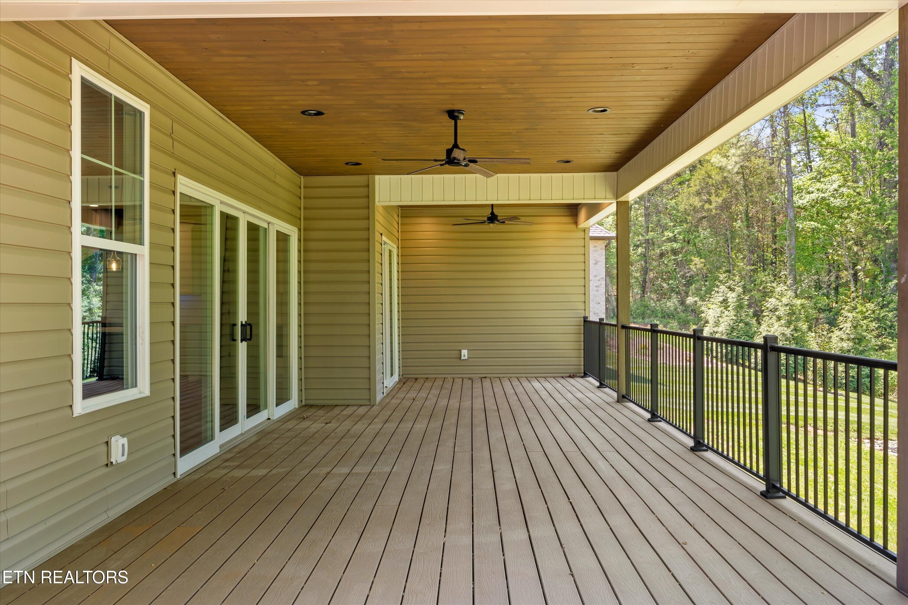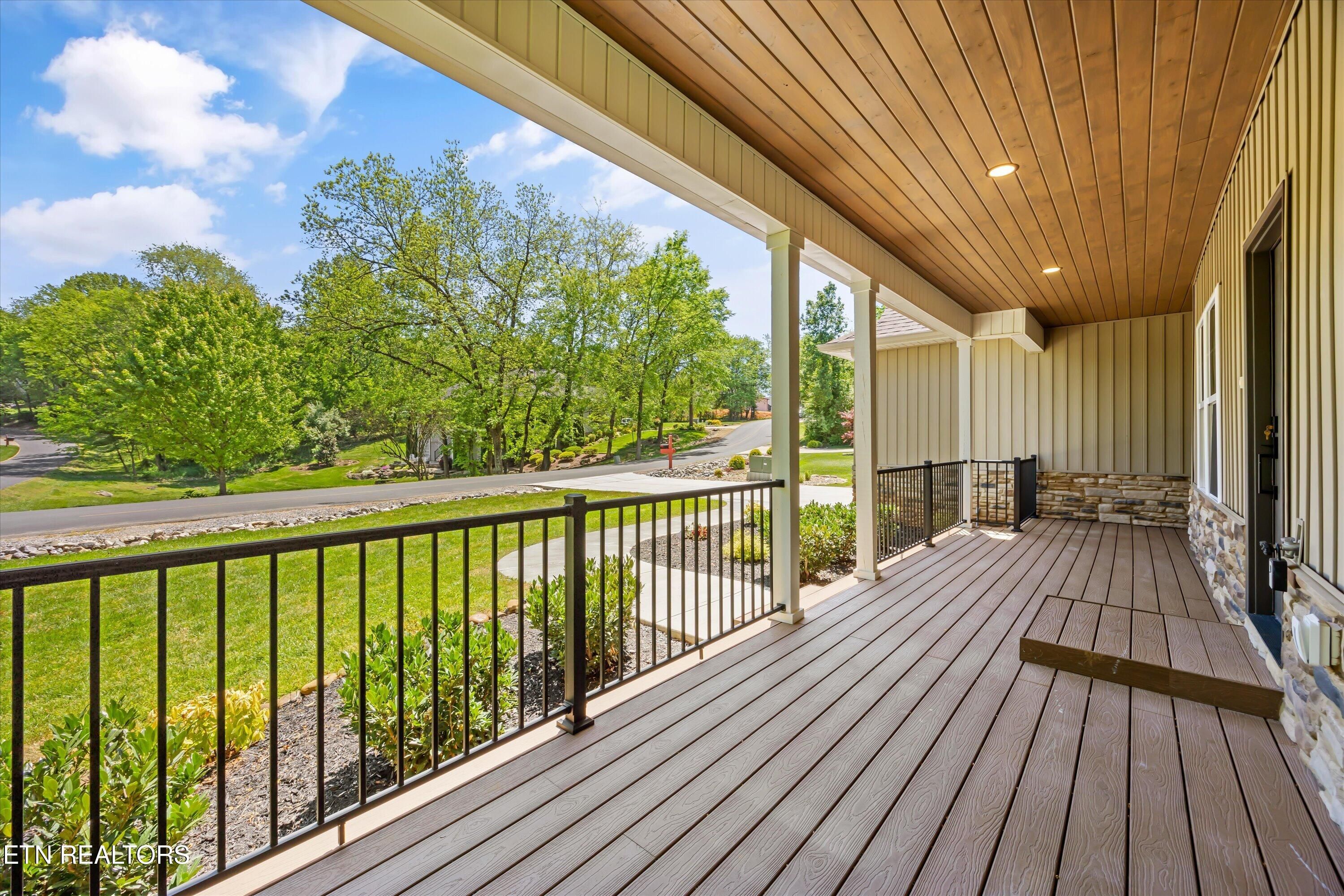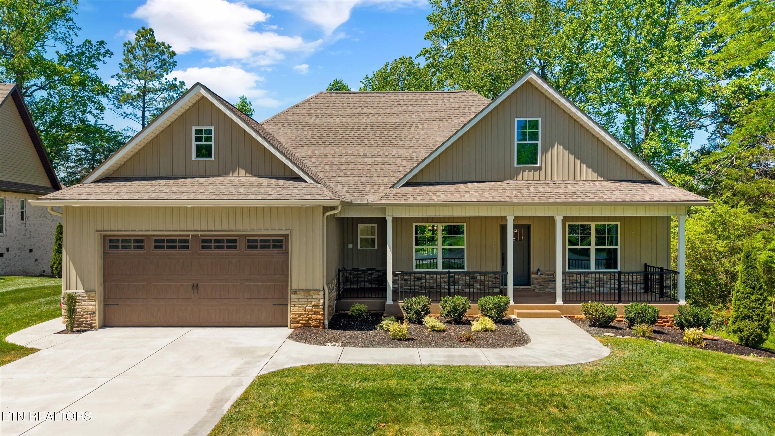 Like-New Custom Home with One-Level Living + Premium Outdoor Space in Tellico Village Professionally built and never occupied, this less-than-one-year-old home offers the benefits of new construction without the wait. Designed for true main-level living, the open floor plan features engineered hardwoods throughout, 9' ceilings, and a vaulted living room with wood beam detail and gas stone fireplace. A custom wood ceiling highlights the formal dining area, adding warmth and character. The kitchen blends function and style with semi-custom cabinetry, quartz countertops, walk-in pantry, and a dedicated coffee/wine bar with built-in wine fridge. All three bedrooms are located on the main level, including a well-appointed primary suite with double vanity, custom walk-in closet, and a large tiled walk-in shower. Secondary bath also features full tile finishes. Upstairs offers additional flexibility with a private office and bonus room--ideal for guests, work, or media. Outdoor living is a standout feature, with a 32' covered front porch and an expansive 45' covered rear patio with composite decking, open-air space, gas hookup for grilling, and a private, landscaped backyard setting. Additional features include a 2-car garage with epoxy flooring and quality finishes throughout. Located in Tellico Village, offering lake access, golf, restaurants, pickleball, tennis, and a rec center with pool and fitness facilities.