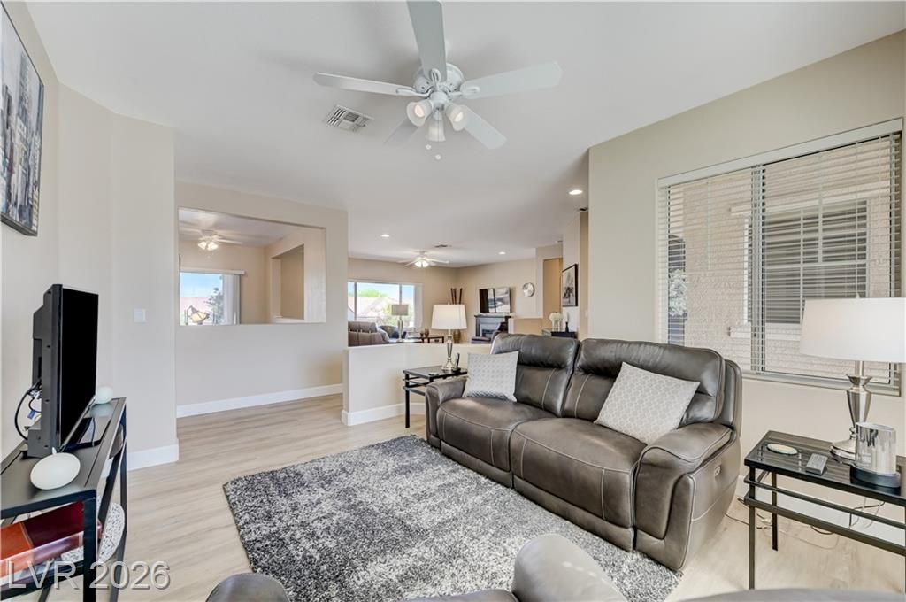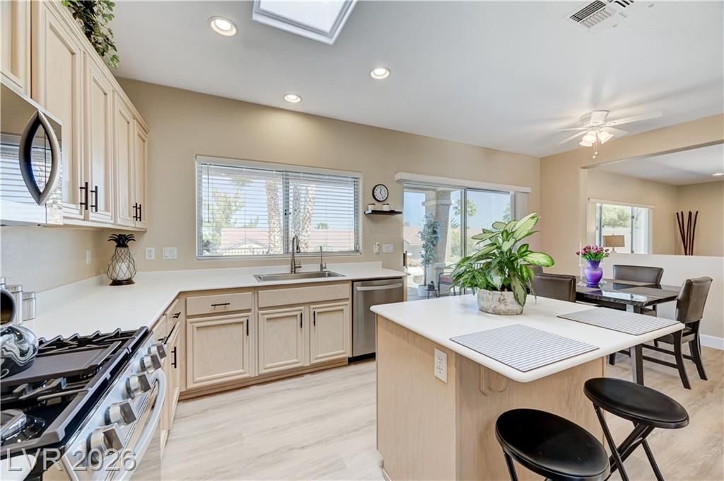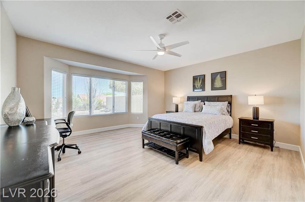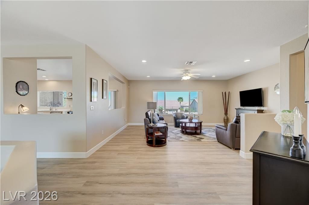 Located in the prestigious 55+ community of Sun City Anthem, this beautifully upgraded single story home offers 2beds/2bath, & a versatile den ideal for an office or retreat. Situated on an elevated 8,200 sq ft lot, the property offers added privacy & a serene setting. Enjoy resort-style living with access to golf, community pools, tennis, & more. Inside, recent upgrades within the last 2 years include HVAC, furnace, luxury vinyl plank flooring, kitchen appliances, water softener, reverse osmosis system, & more. The kitchen features newer stainless steel appliances, skylight, recessed lighting, an island & flows into a dining area with a built-in desk—perfect for everyday functionality. A spacious living room opens to a serene setting, while the primary suite showcases peaceful backyard views, dual sinks, soaking tub, separate shower, & walk-in closet. Backyard features covered patio & built-in BBQ. Complete with a 2.5-car garage, workbench, & Ring security system.