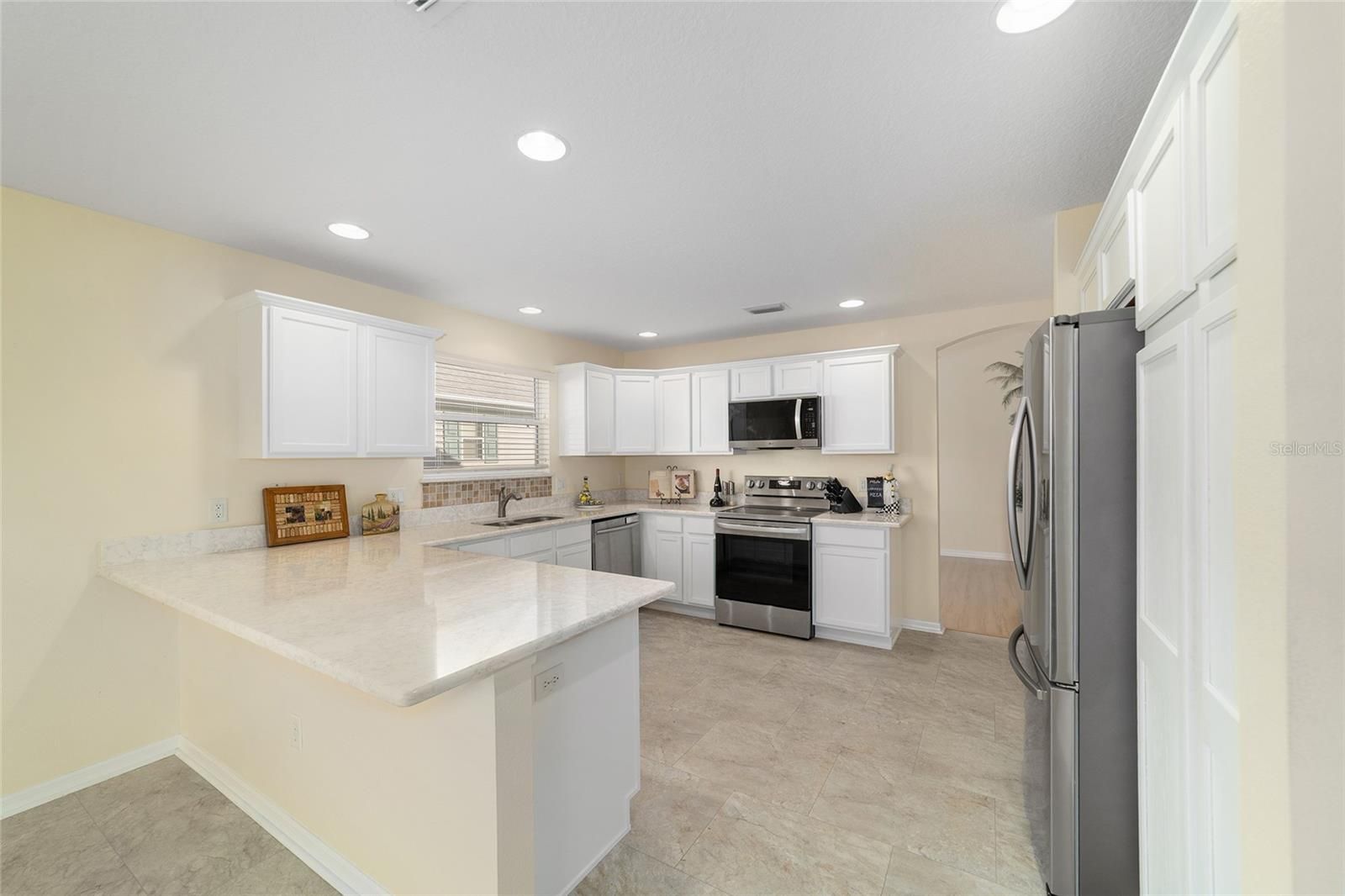 This beautiful CYPRESS model is in a PRIME LOCATION .in the Village of HADLEY. THIS 1827 sq ft home is a very well cared for 3 bedroom 2 bath with 2 WALK IN CLOSETS IN THE MASTER SUITE. There are ceiling fans throughout all the bedrooms and the Living room. The kitchen is gorgeous with stunning QUARTZ COUNTERTOPS WITH A LARGE PENINSULA that is a show stopper. The eat in kitchen area can accommodate a large table with chairs and has 3 windows for lots of natural sunlight. This home comes complete with STAINLESS STEEL APLIANCES including STATE OF THE ART LG SMART APPLIANCES. The refrigerator is roomy and comes with a self filling filtered pitcher, LG THIN Q RANGE AND MICROWAVE WITH APP FUNCTIONS FOR PREHEATING and other desirable functions. Just off the kitchen is the spacious dining room with a window for natural sunlight. The Living room space is quite large and well laid out. The Master bath has DUAL VANITIES WITH QUARTZ COUNTERTOPS and a step in shower. The 2nd and 3rd bedrooms have a shared guest bathroom with QUARTZ COUNTERTOP VANITY. The laundry area has lots of cabinet space and the washer and dryer are included. The private Lanai area is perfect for a relaxing afternoon enjoying the Florida breeze and taking in the garden area. There is a privacy wall in back that is perfect for the garden space. Come take a look at this gem and find out why HADLEY IS A SOUGHT AFTER AND PRIME LOCATION.