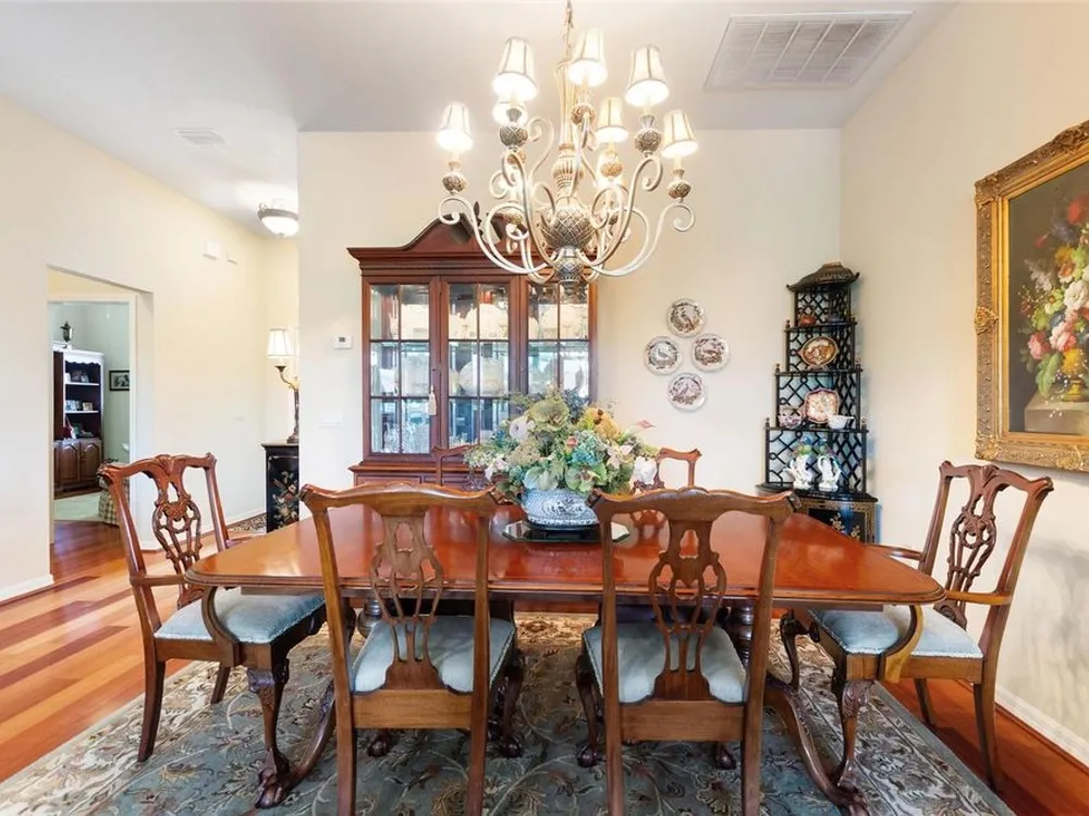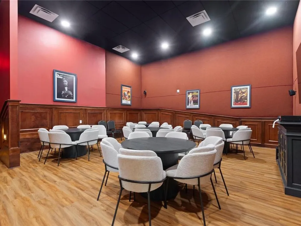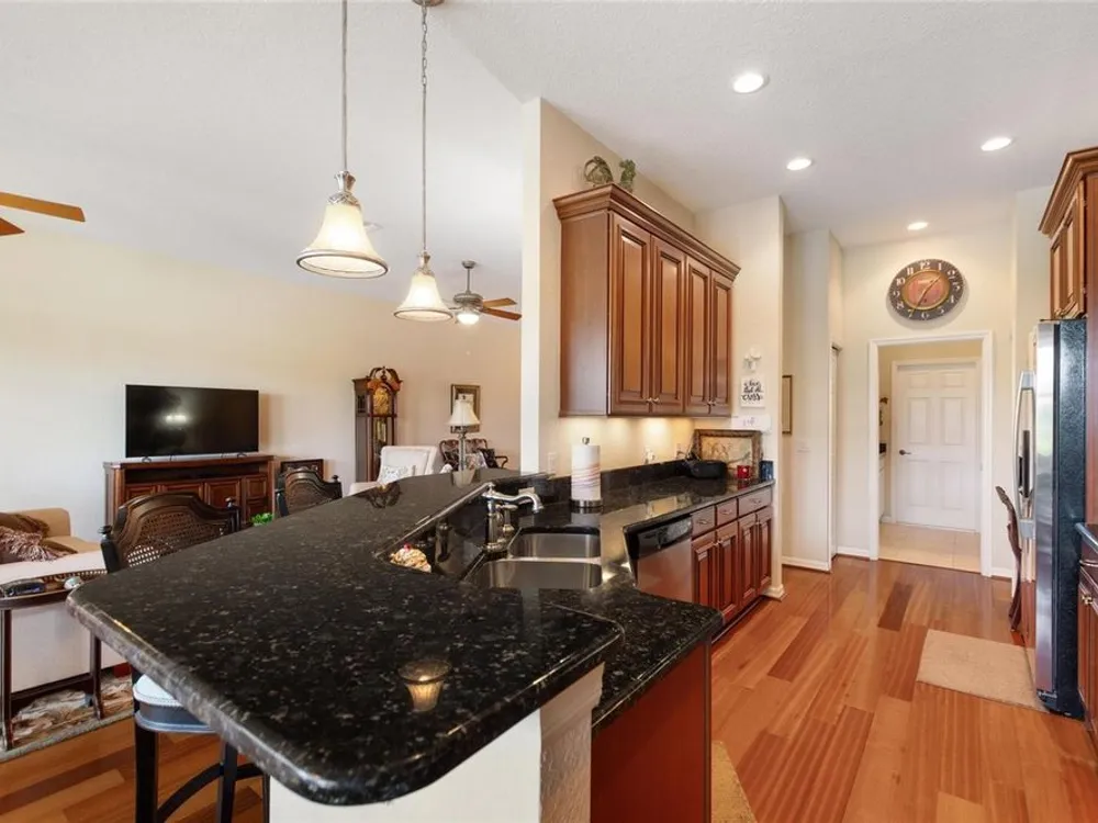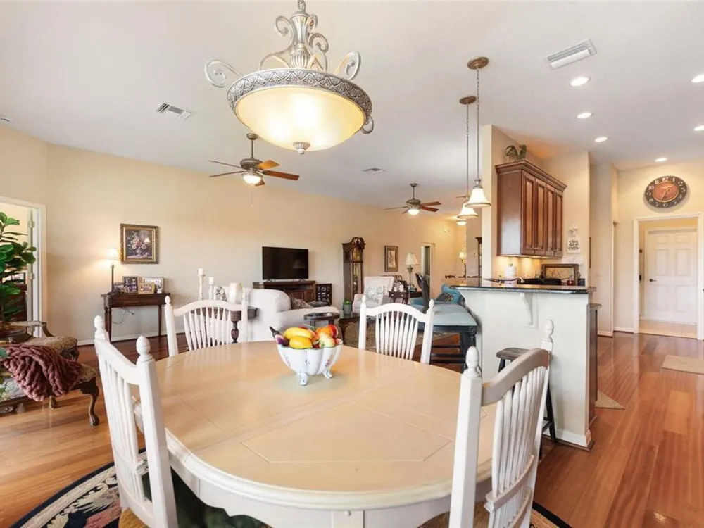 - Eat-in Kitchen, High Ceilings, Kitchen/Family Room Combo, Living/Dining Room, Open Floorplan, Main Level Primary, Solid Surface Counters, Solid-Wood Cabinets, Split Bedrooms, Stone Counters, Thermostat, Window Treatments