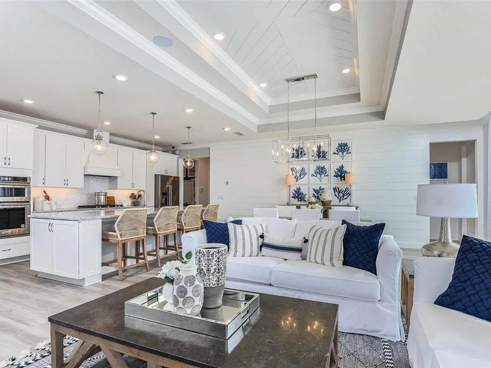 - In-Wall Pest Control, Kitchen/Family Room Combo, Living/Dining Room, Open Floorplan, Split Bedrooms, Stone Counters, Thermostat, Tray Ceiling(s), Walk-In Closet(s)