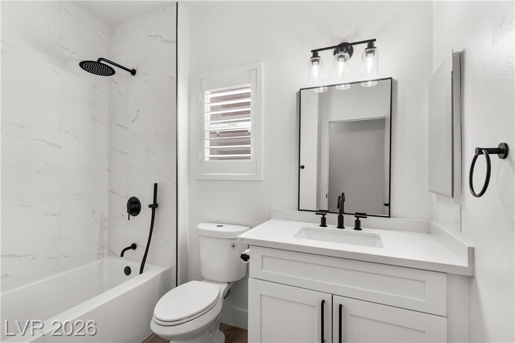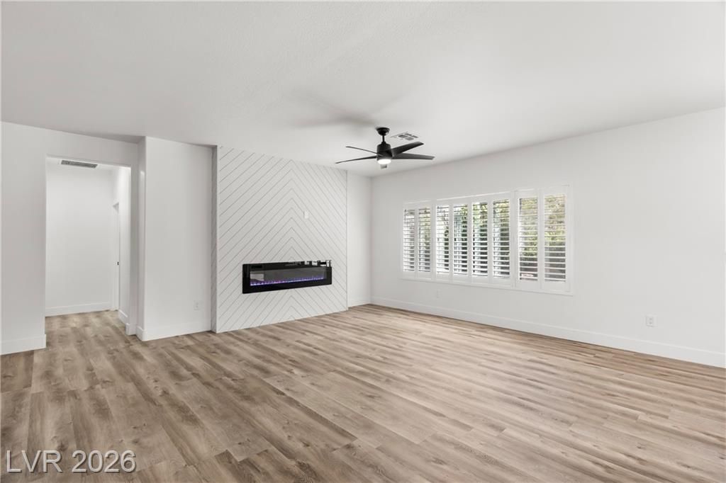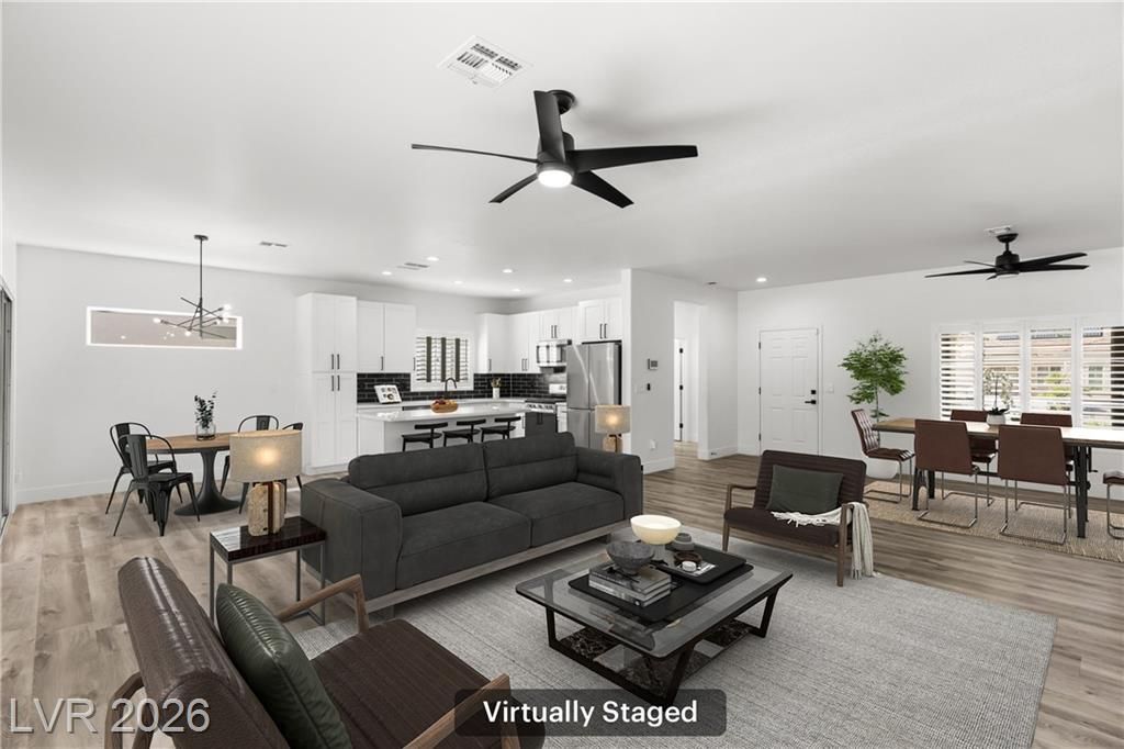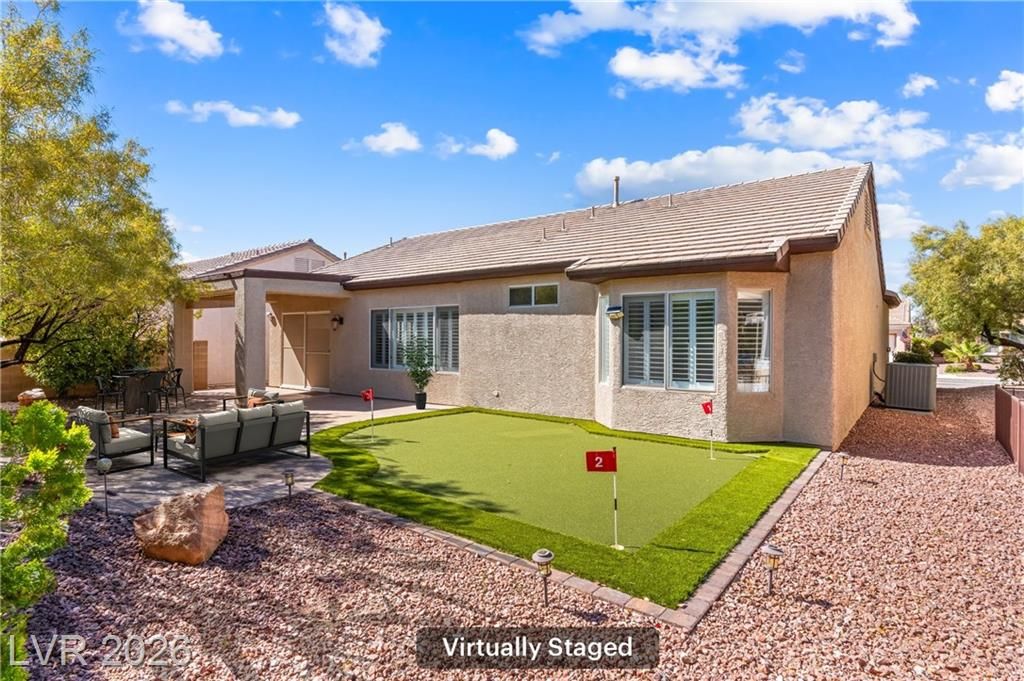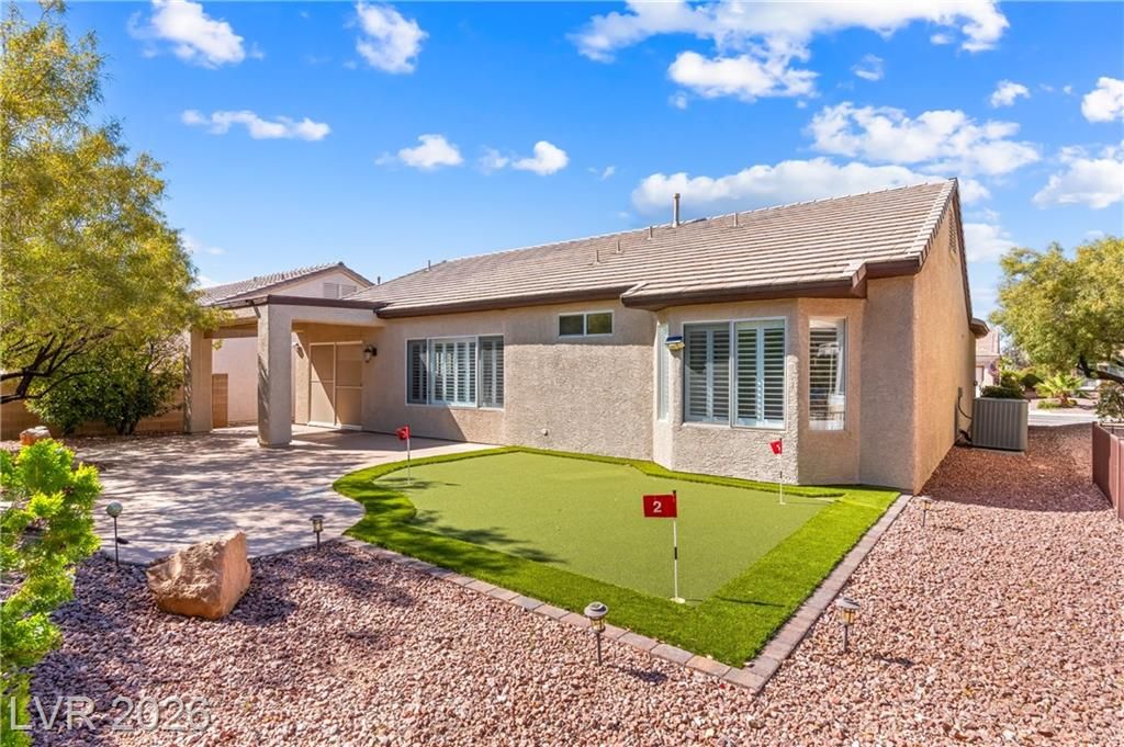 Turnkey, fully remodeled home in the highly desirable 55+ Sun City Anthem community! This stunning 2 bedroom and 2 bath Jefferson model has been completely upgraded with modern finishes throughout. Enjoy an open, light-filled layout featuring new elegant shutters. The designer kitchen shines with quartz countertops, soft-close cabinetry, and stainless steel appliances, flowing seamlessly into the inviting living space with a sleek LED fireplace—perfect for relaxing or entertaining. Both bathrooms have been beautifully renovated with contemporary vanities, updated showers, and stylish fixtures, creating a spa-like feel. Step outside to your low-maintenance backyard featuring newly installed putting green, ideal for easy outdoor living year-round. Additional highlights include built-in garage storage, a whole house LifeSource water filtration system, and thoughtful upgrades throughout.
