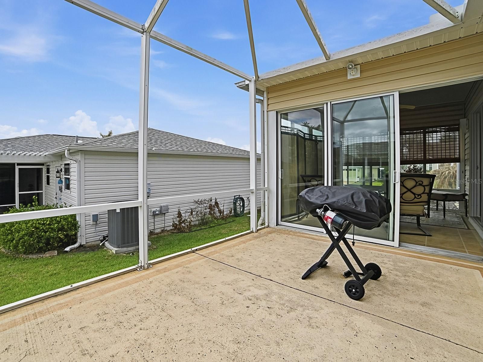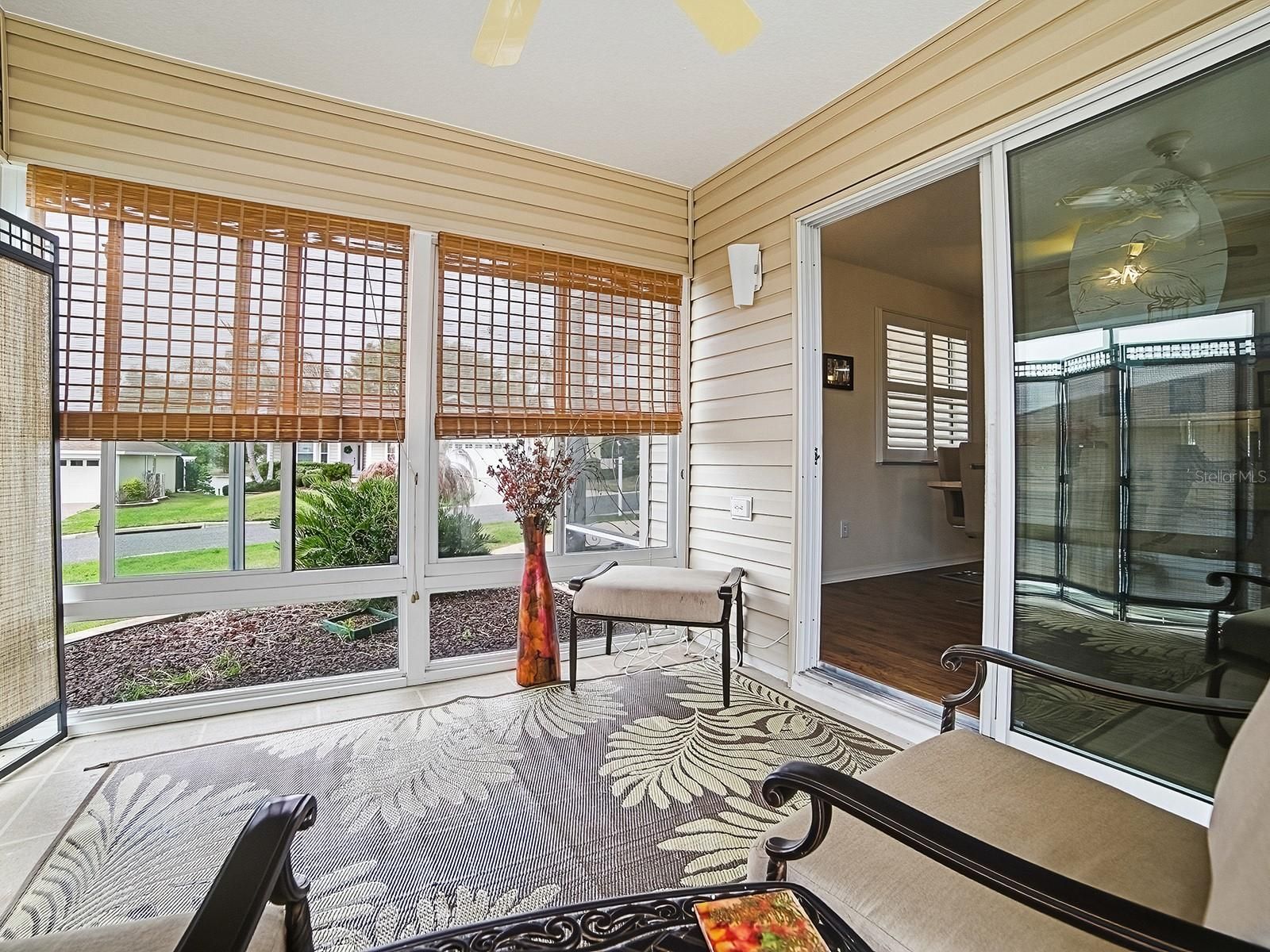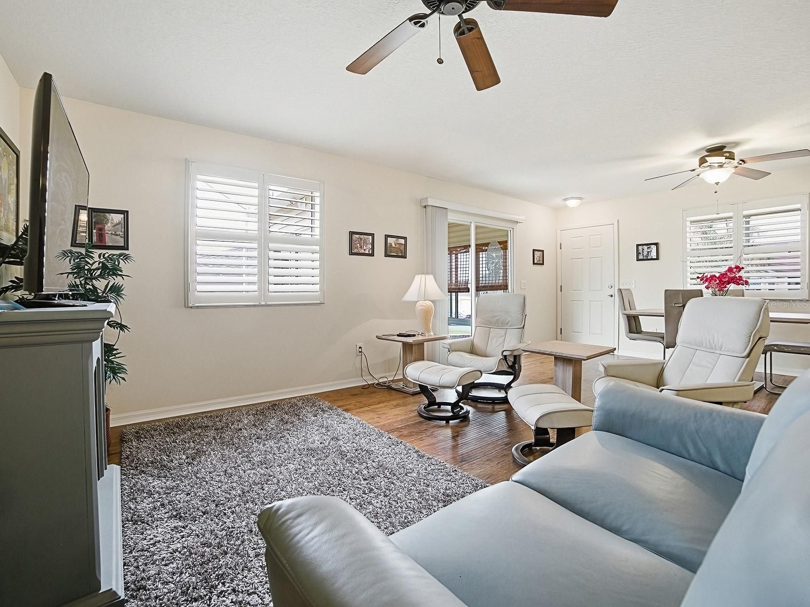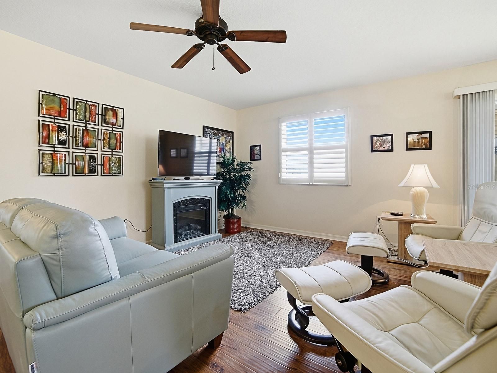Village of Amelia! BOND PAID! 2 Bedroom, 2 Bathroom, 2 Car Garage. Extra living space in the ENCLOSED LANAI and BIRDCAGE. Gorgeous Engineered Hardwood Floors through main living area. PLANTATION SHUTTERS. Lovely kitchen with built-in desk and lots of cabinets and pantry closet. Spacious primary bedroom has ensuite bath with step in shower and walk-in closet. Spacious guest bedroom and guest bathroom. Looking for the home BETWEEN THE 6's, close to Mallory Country Club, Lake Sumter Landing and recreation centers with pools, pickleball, games and more. Roof 2015, HVAC 2022, HWH 2009. BOND PAID!!