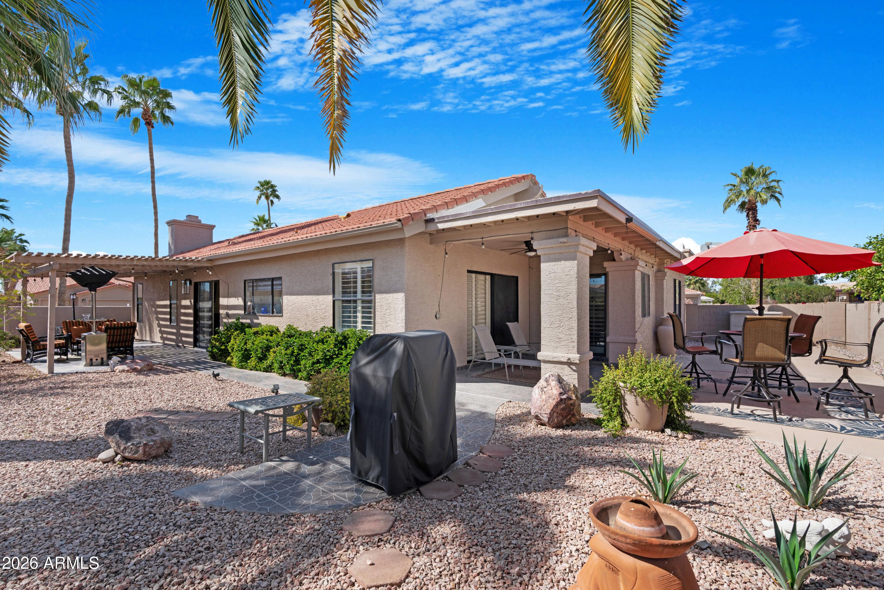 Outstanding CURB APPEAL welcomes you to this beautifully FURNISHED AND UPDATED 2-bedroom, 2-bath CIMARRON MODEL located in the highly desirable ACTIVE ADULT community of Cottonwood at Sun Lakes. A CUSTOM TILED WALKWAY leads to an inviting FRONT COURTYARD, creating a warm and elegant first impression. Inside, the SPACIOUS GREAT ROOM features VAULTED CEILINGS, a cozy FIREPLACE, BUILT-IN CABINETRY, PLANTATION SHUTTERS, and FRENCH DOORS opening to a BONUS COVERED SIDE PATIO for seamless indoor-outdoor living. The UPDATED KITCHEN showcases PAINTED CABINETS, GRANITE COUNTERTOPS, and NEWER STAINLESS STEEL APPLIANCES with a modern hood. The LARGE PRIMARY SUITE offers a private SITTING/OFFICE AREA, DUAL SINKS with GRANITE, a SOAKING TUB, and a NEWLY TILED WALK-IN SHOWER. The OVERSIZED SECONDARY BEDROOM provides flexible space for guests or a HOME OFFICE. Step outside to a LOVELY BACKYARD with a CUSTOM TILED COVERED PATIO, perfect for relaxing or entertaining. Enjoy RESORT-STYLE AMENITIES including GOLF, TENNIS, PICKLEBALL, POOLS, FITNESS CENTER, SOCIAL CLUBS, and TWO RESTAURANTS -- everything you need for the ultimate SUN LAKES LIFESTYLE.