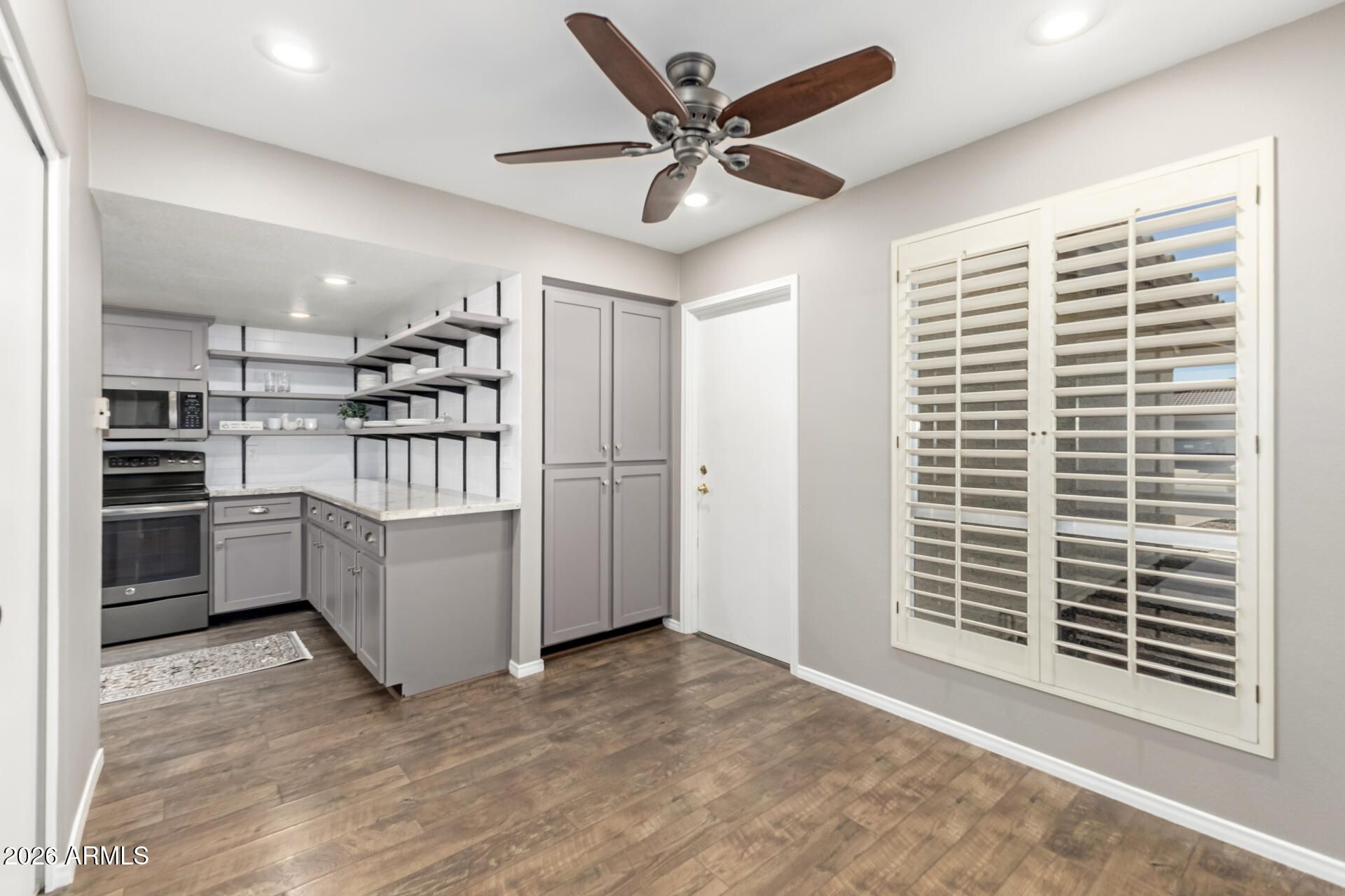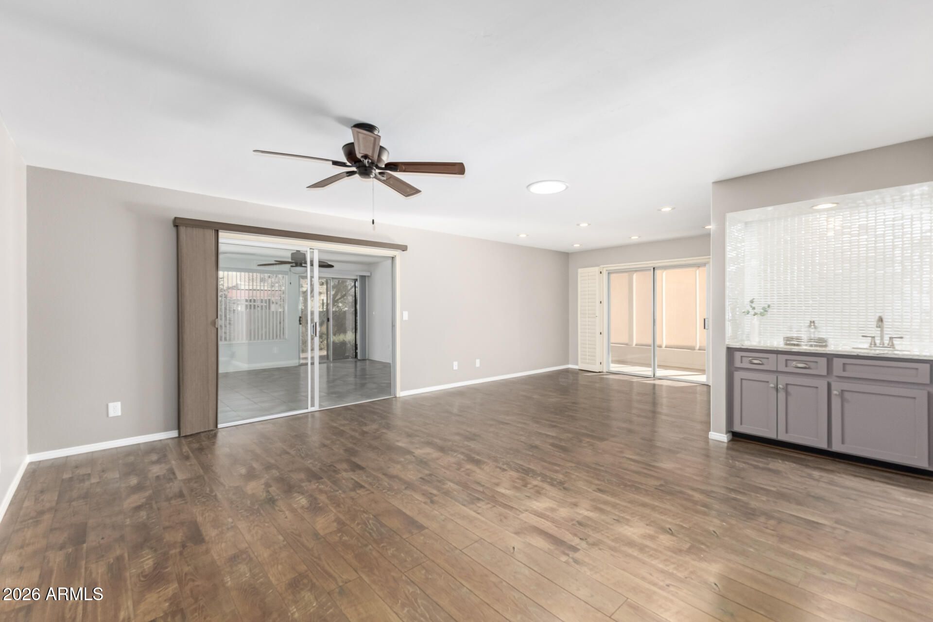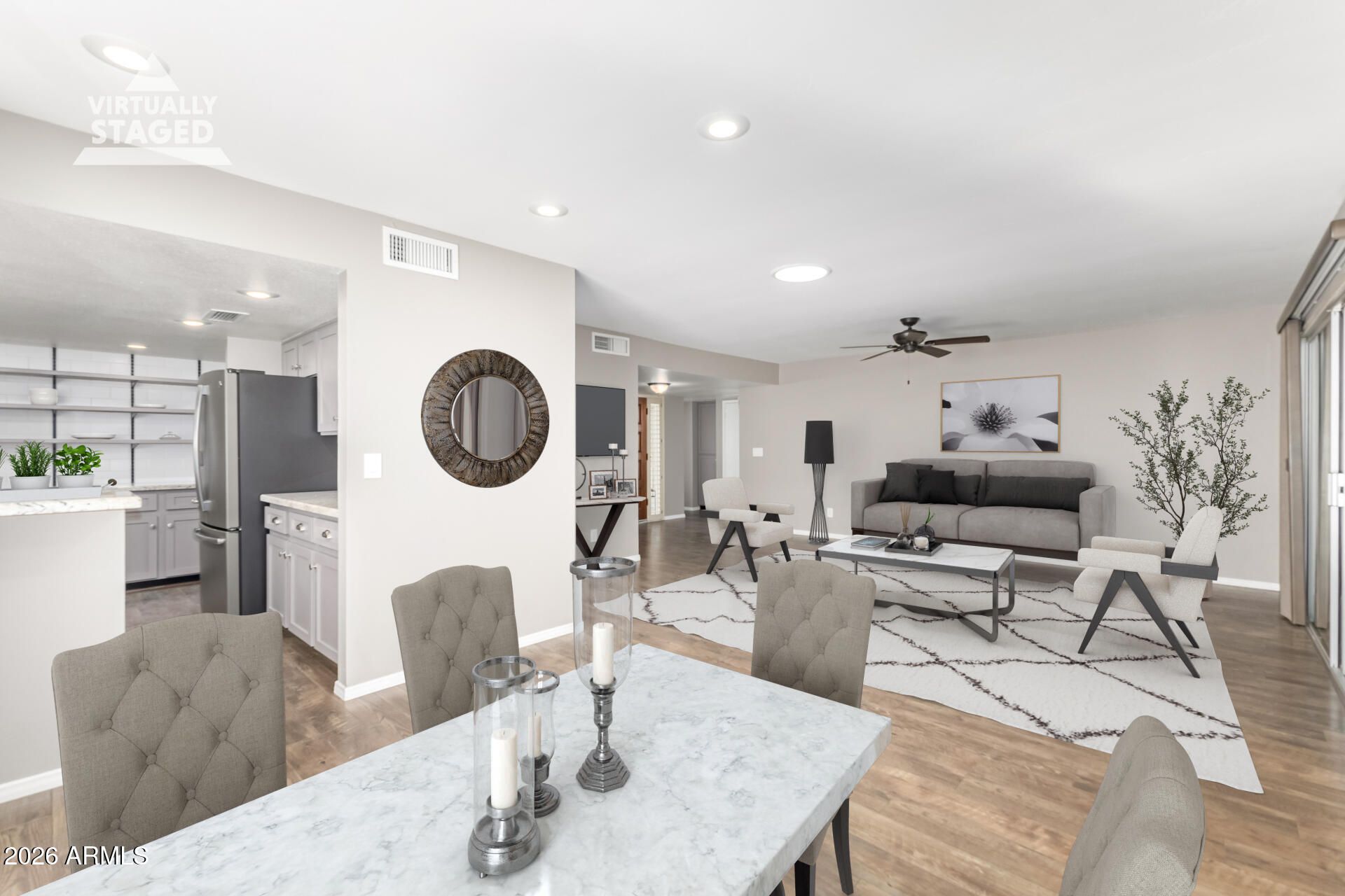 Your ideal retirement haven is here in the 55+ Sun Lakes! This charming 2-bedroom + bonus room property welcomes you w/ a lovely desert landscape & an inviting front patio. Inside, you'll find a tastefully updated home featuring a soft palette throughout, wood floors, gorgeous kitchen & guest bath all great for entertaining. You'll love the versatile den complete w/privacy door & closet. The open kitchen has SS appliances, granite counters, updated lighting, tile backsplash, shelving mixed in with shaker cabinets. The main bedroom boasts classic plantation shutters, soft carpeting, an ensuite w/ dual sinks, a make-up vanity, & a walk-in closet. Unwind on the screened-in patio, perfect for peaceful afternoons. The backyard includes an open patio for outdoor relaxation & sunshine!