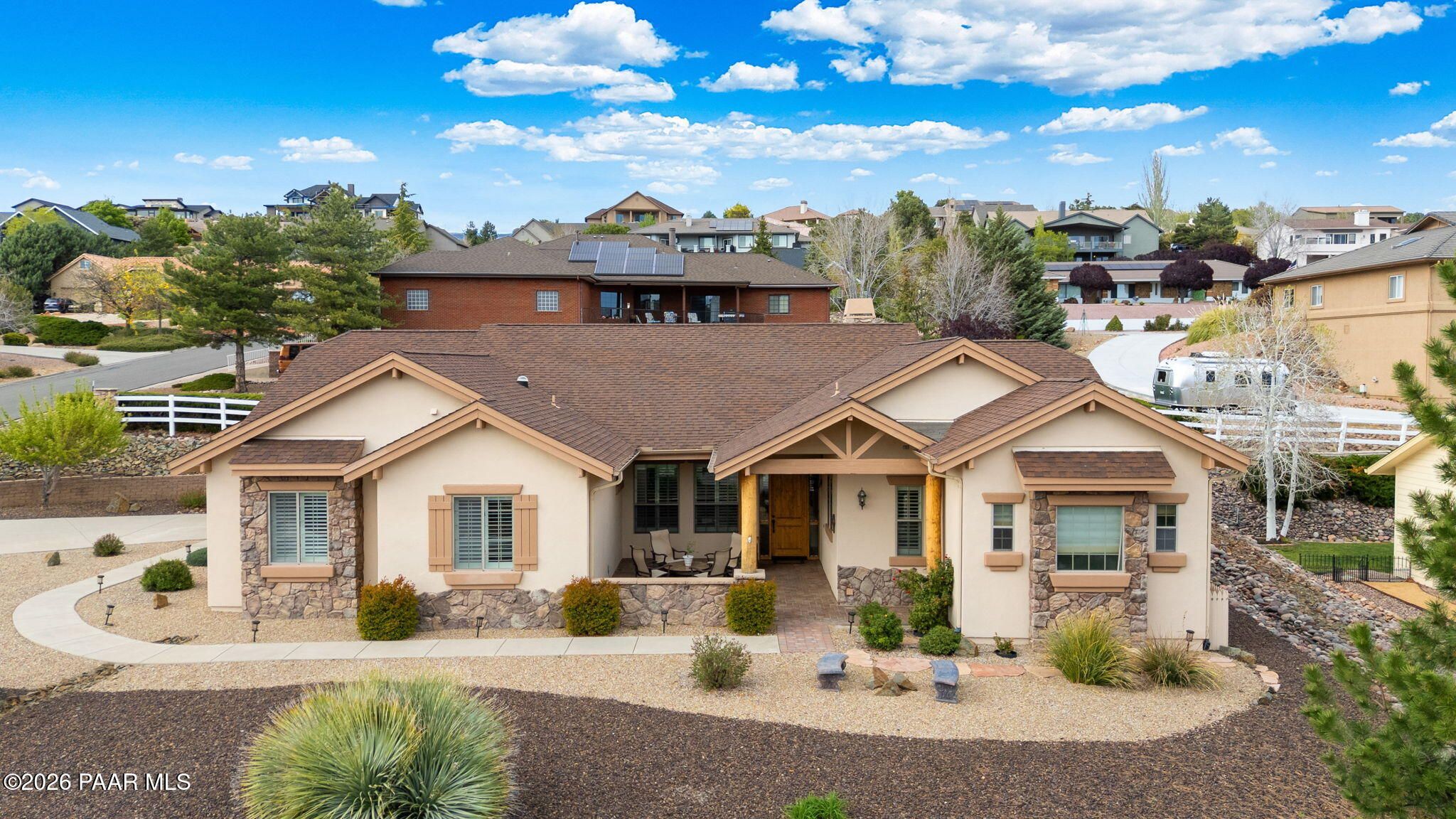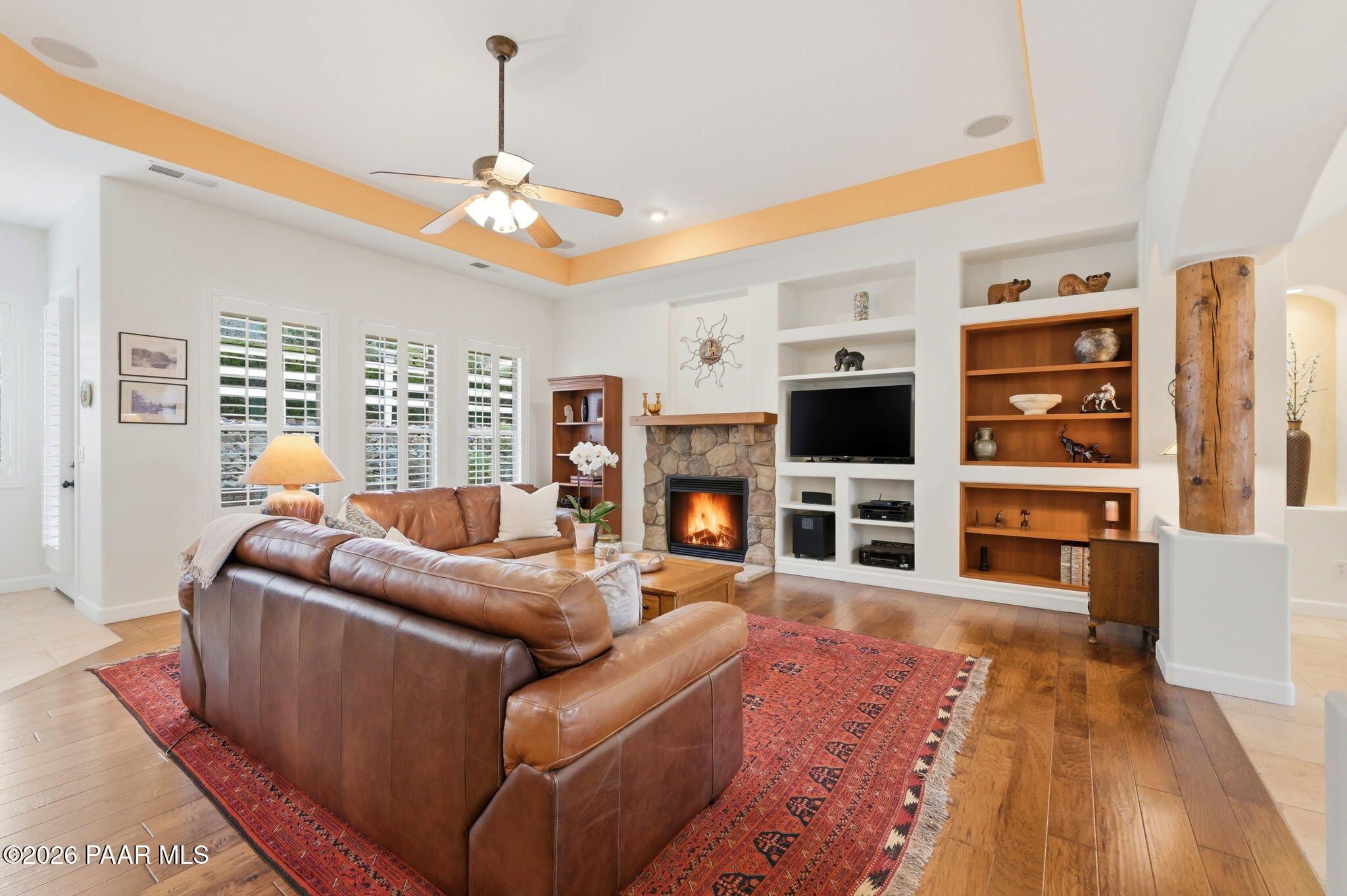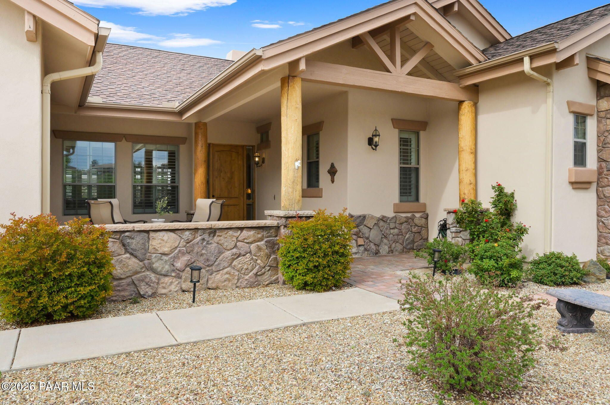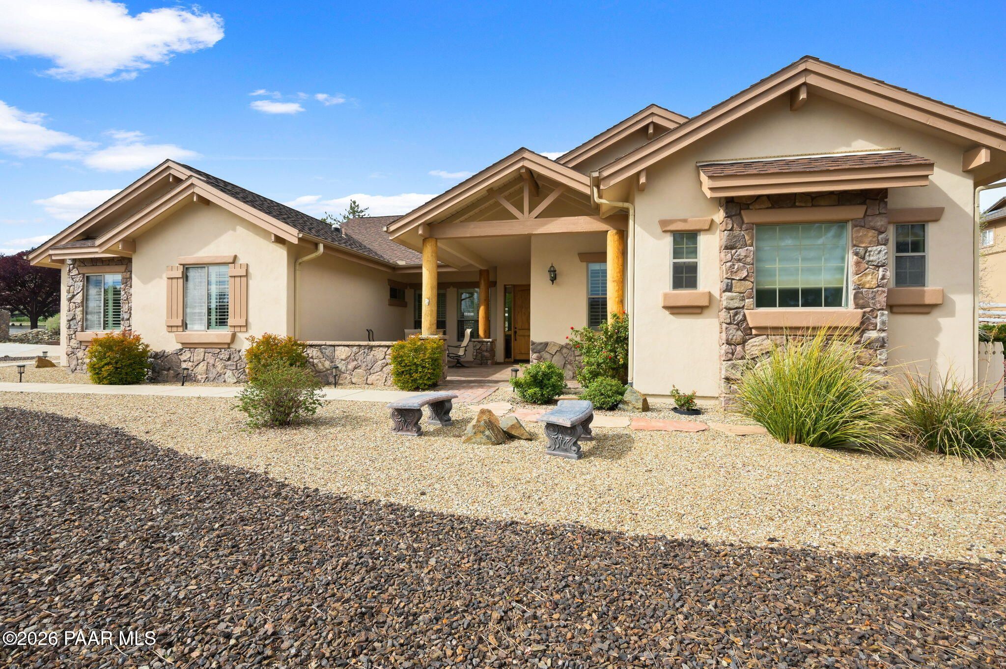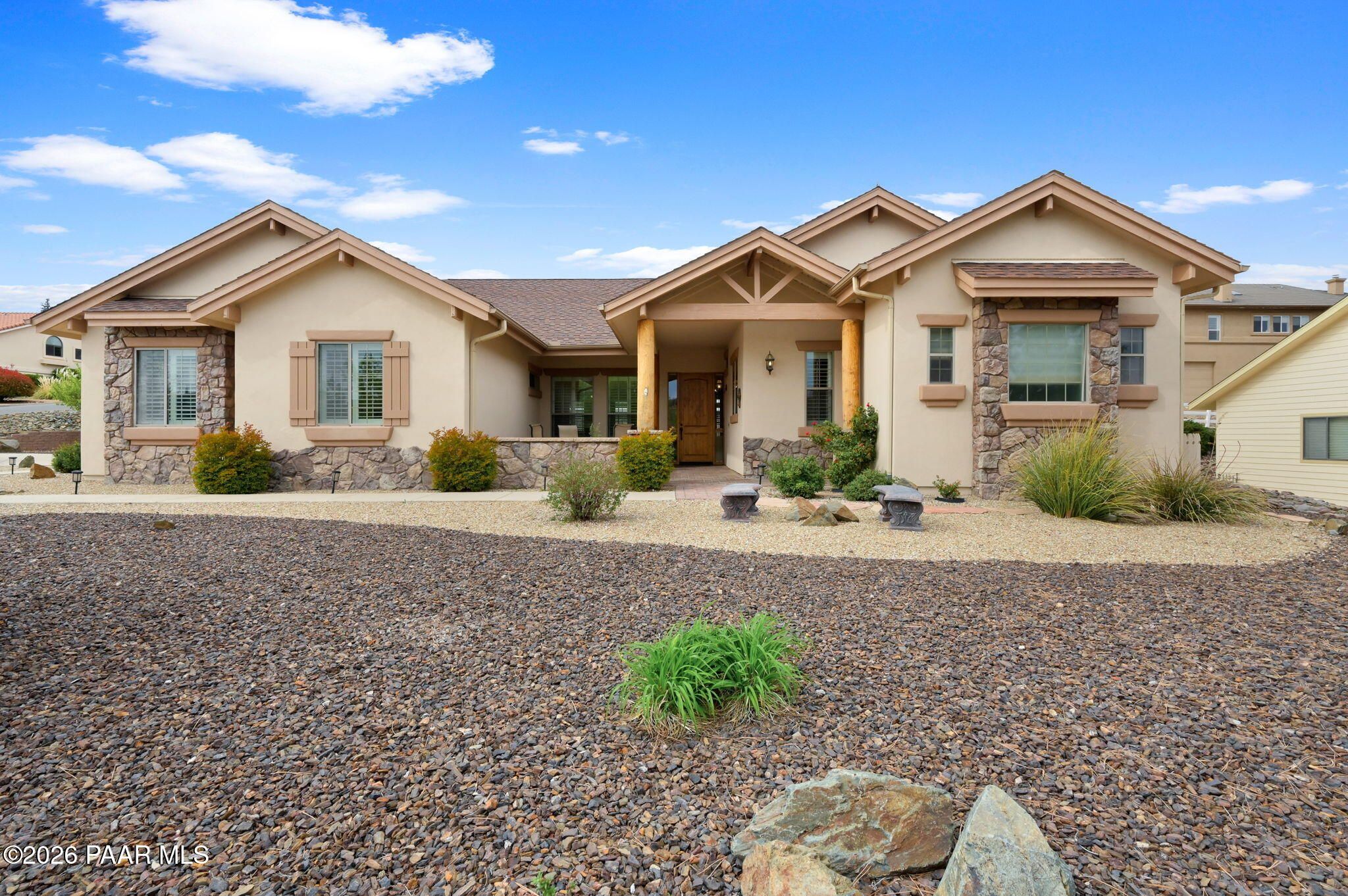 Welcome to an exceptional residence in the highly sought-after Stoney Creek of Prescott Lakes. This beautifully maintained home offers the perfect blend of comfort, quality and lifestyle, featuring 3 bedroom plus media room/office split floor plan and showcases thoughtful upgrades throughout. Enjoy a bright, open kitchen with granite counters, a large island, prep sink, rich hickory cabinetry, stainless steel appliances, and a professional 5-burner range. The spacious primary suite features private patio access, a spa-like bath with soaking tub, snail shower, dual vanities, and two walk in closets. Plantation shutters add timeless style and energy efficiency. Additional highlights include low-E windows, timeless hardwood floors, and open-concept living spaces create an inviting atmosphere perfect for gathering with family or hosting guests. Step outside to a meticulously landscaped yard with mature fruit trees and drip irrigation-perfect for relaxing or entertaining. Oversized 2-car garage with workshop space. Living in Stoney Creek within Prescott Lakes means enjoying access to a lifestyle that goes far beyond the home itself. Residents appreciate the proximity to a championship golf course, pickleball courts and a well appointed clubhouse that serves as a social hub for the community. Whether you are seeking an active lifestyle or a peaceful setting with scenic surroundings, this location offer the best of both worlds. WELCOME HOME!