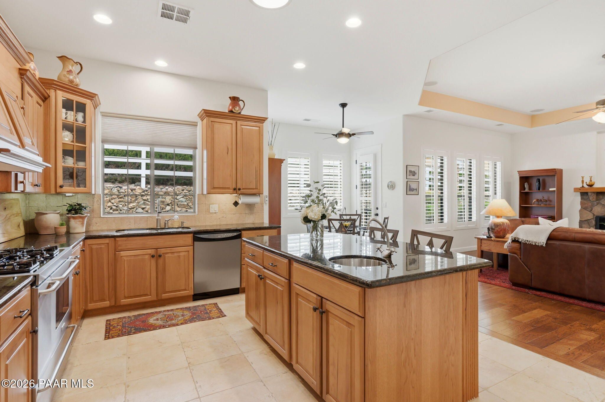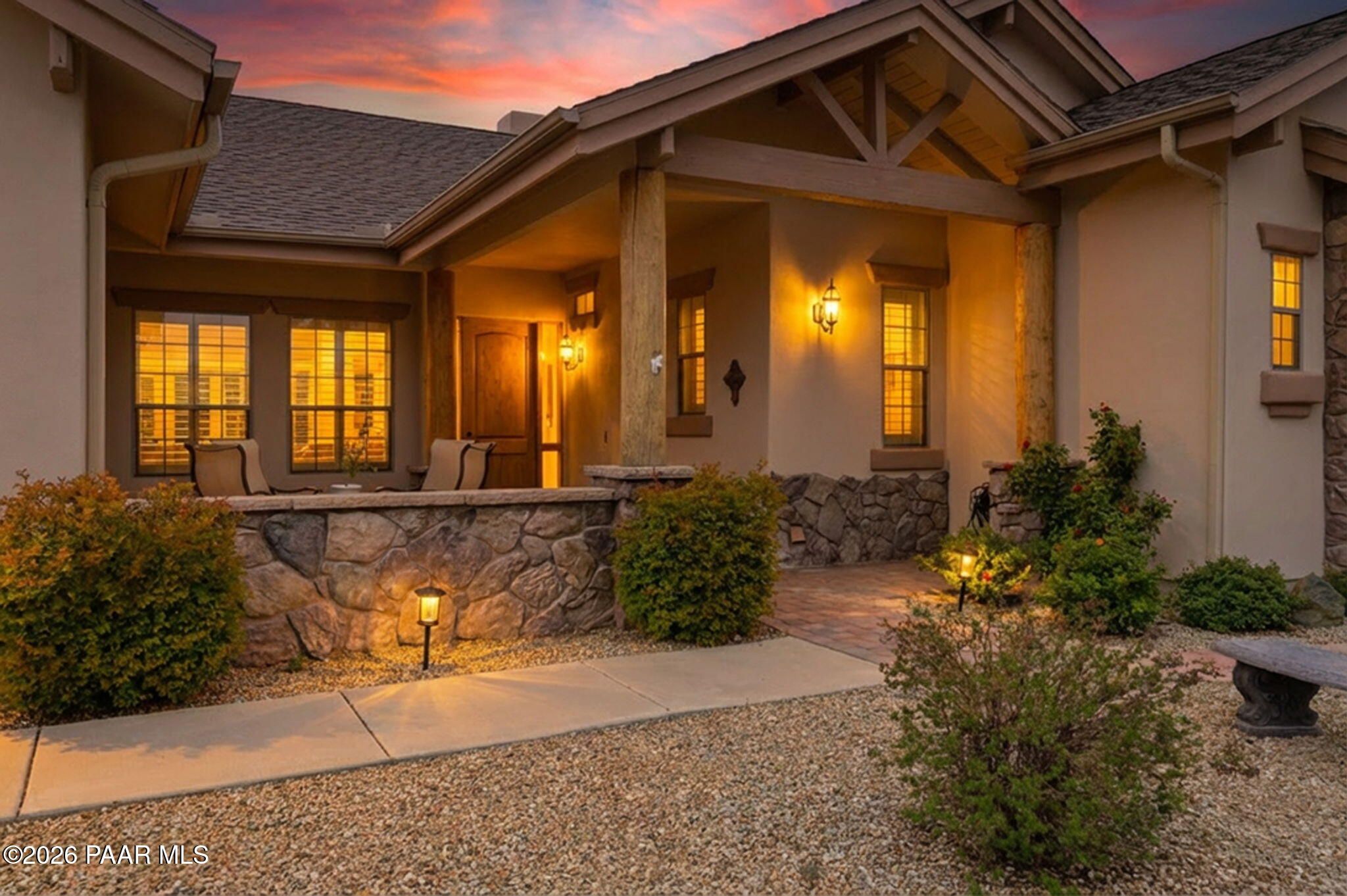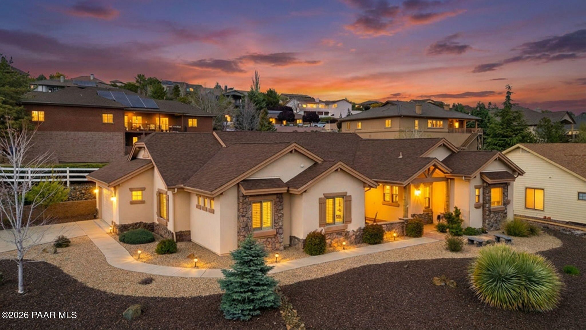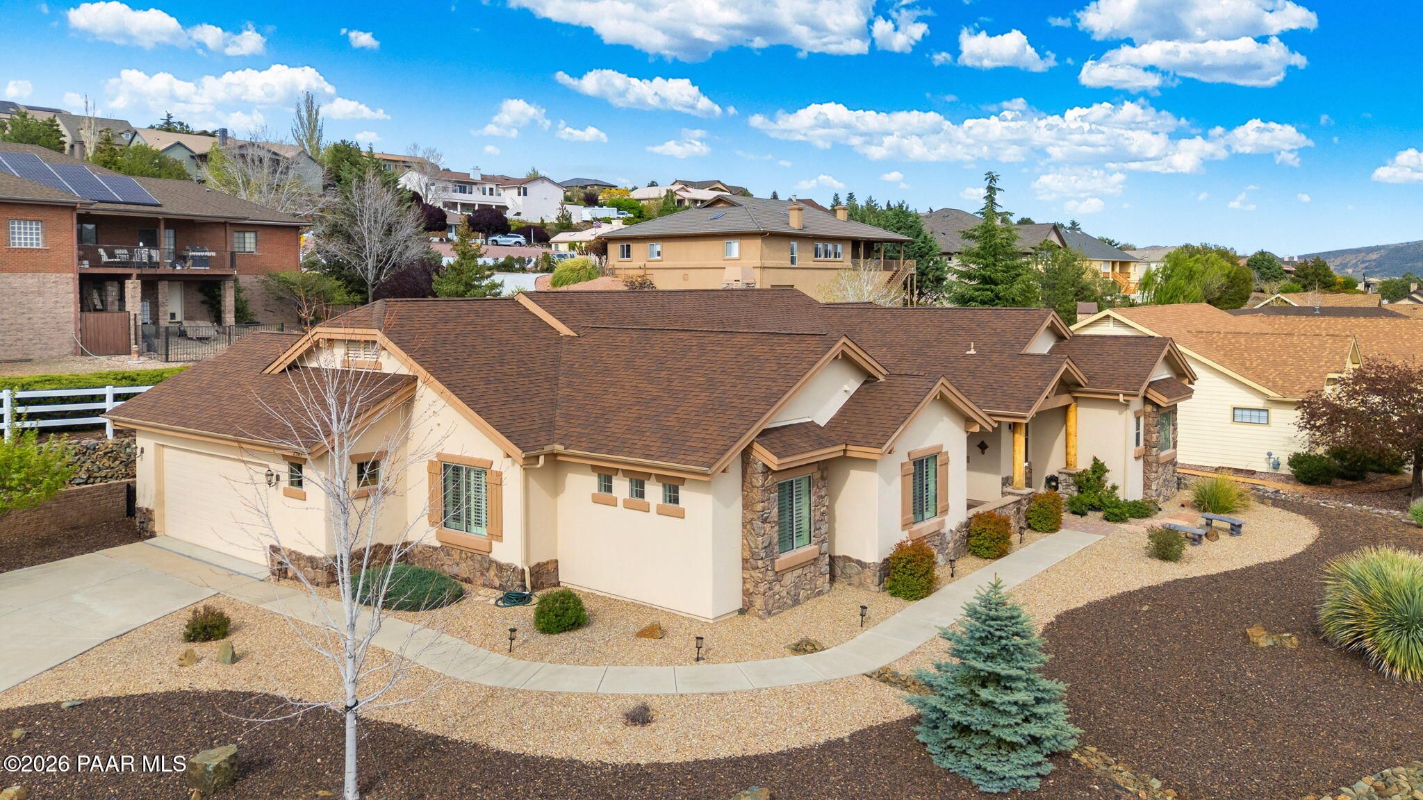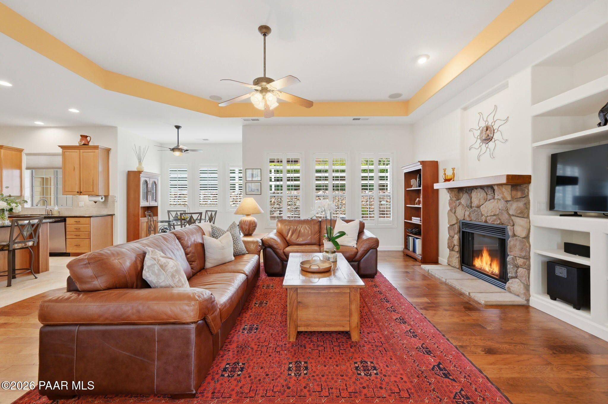 Welcome to an exceptional residence in the highly sought-after Stoney Creek of Prescott Lakes. This beautifully maintained home offers the perfect blend of comfort, quality and lifestyle, featuring 3 bedroom plus media room/office split floor plan and showcases thoughtful upgrades throughout. Enjoy a bright, open kitchen with granite counters, a large island, prep sink, rich hickory cabinetry, stainless steel appliances, and a professional 5-burner range. The spacious primary suite features private patio access, a spa-like bath with soaking tub, snail shower, dual vanities, and two walk in closets. Plantation shutters add timeless style and energy efficiency. Additional highlights include low-E windows, timeless hardwood floors, and open-concept living spaces create an inviting atmosphere perfect for gathering with family or hosting guests. Step outside to a meticulously landscaped yard with mature fruit trees and drip irrigation-perfect for relaxing or entertaining. Oversized 2-car garage with workshop space. Living in Stoney Creek within Prescott Lakes means enjoying access to a lifestyle that goes far beyond the home itself. Residents appreciate the proximity to a championship golf course, pickleball courts and a well appointed clubhouse that serves as a social hub for the community. Whether you are seeking an active lifestyle or a peaceful setting with scenic surroundings, this location offer the best of both worlds. WELCOME HOME!