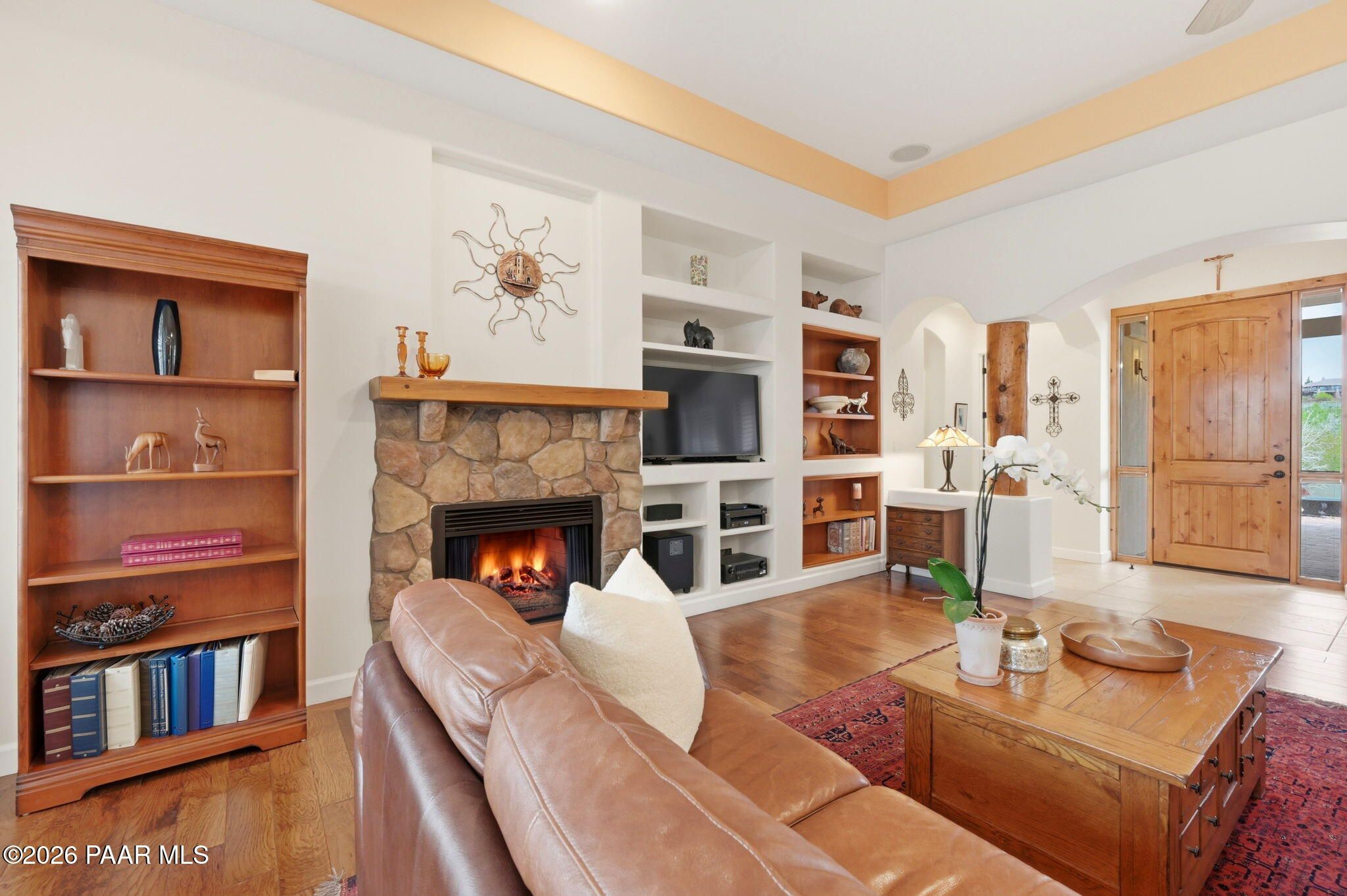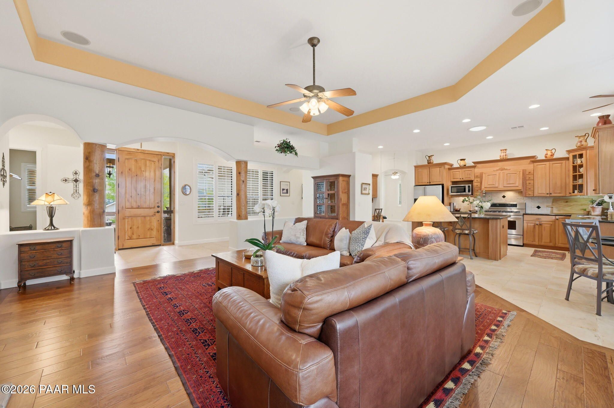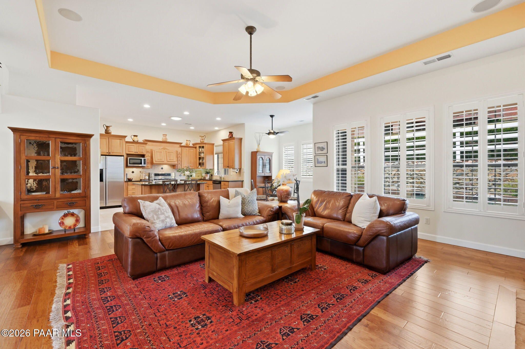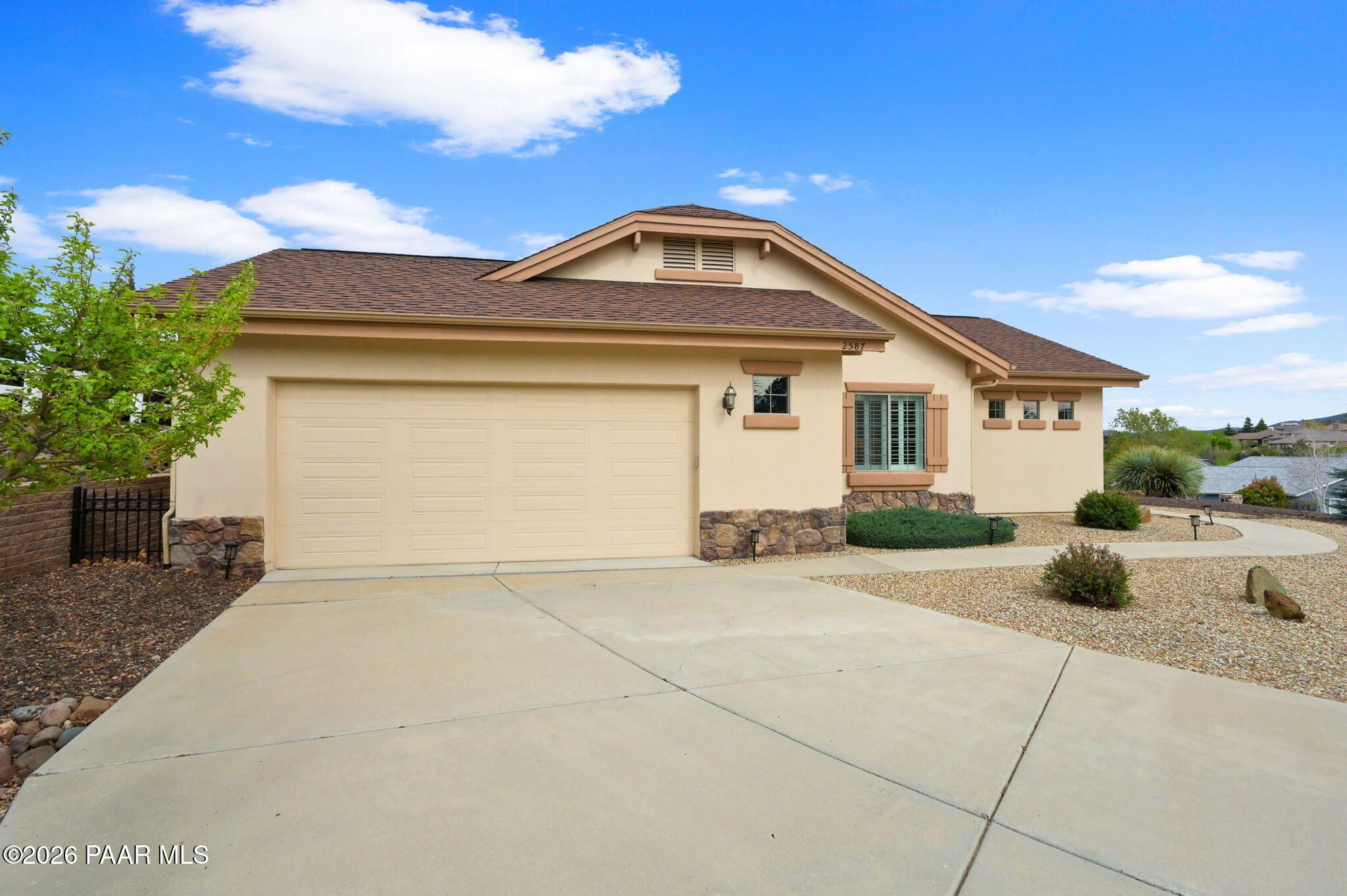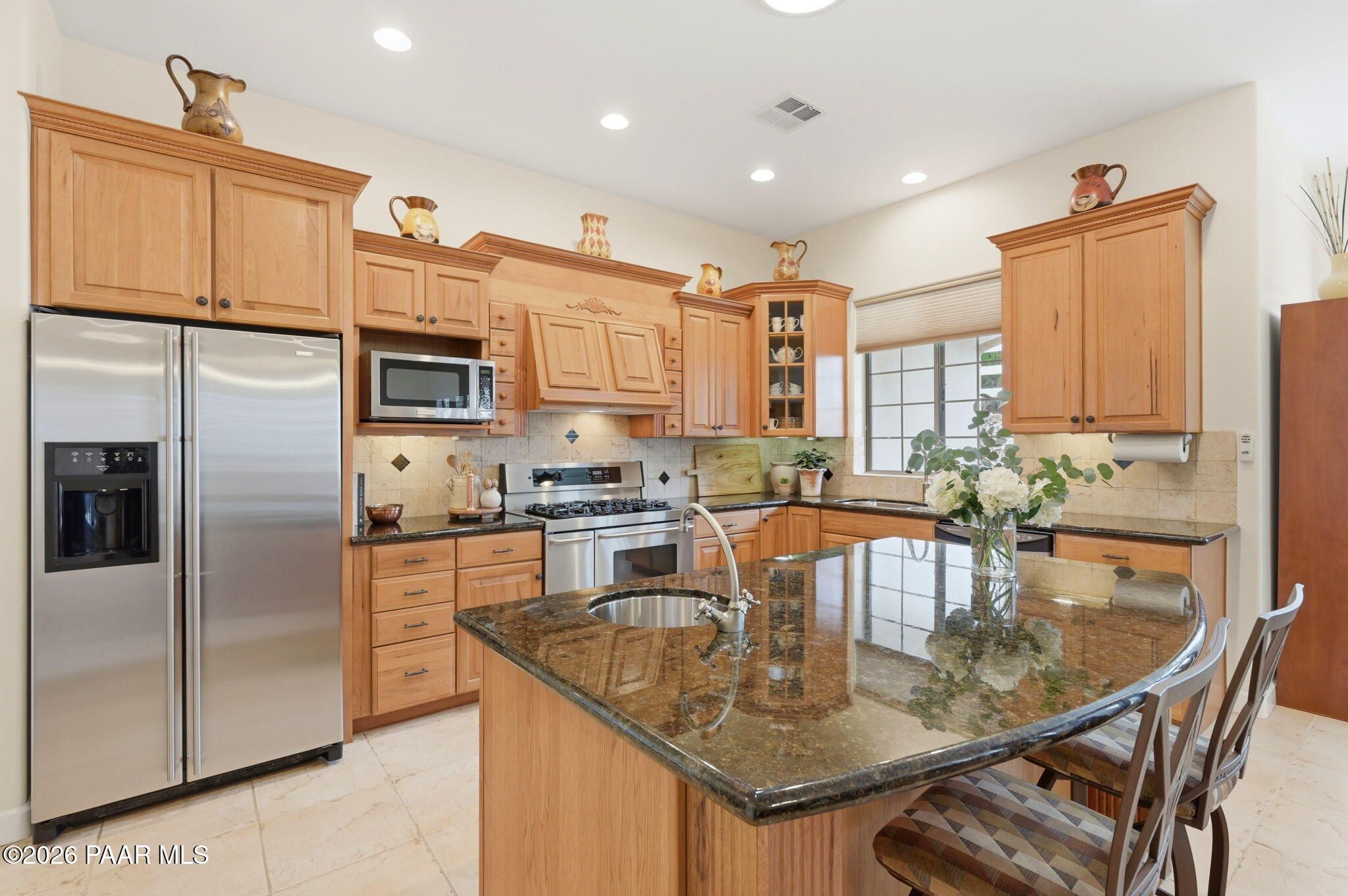 Welcome to an exceptional residence in the highly sought-after Stoney Creek of Prescott Lakes. This beautifully maintained home offers the perfect blend of comfort, quality and lifestyle, featuring 3 bedroom plus media room/office split floor plan and showcases thoughtful upgrades throughout. Enjoy a bright, open kitchen with granite counters, a large island, prep sink, rich hickory cabinetry, stainless steel appliances, and a professional 5-burner range. The spacious primary suite features private patio access, a spa-like bath with soaking tub, snail shower, dual vanities, and two walk in closets. Plantation shutters add timeless style and energy efficiency. Additional highlights include low-E windows, timeless hardwood floors, and open-concept living spaces create an inviting atmosphere perfect for gathering with family or hosting guests. Step outside to a meticulously landscaped yard with mature fruit trees and drip irrigation-perfect for relaxing or entertaining. Oversized 2-car garage with workshop space. Living in Stoney Creek within Prescott Lakes means enjoying access to a lifestyle that goes far beyond the home itself. Residents appreciate the proximity to a championship golf course, pickleball courts and a well appointed clubhouse that serves as a social hub for the community. Whether you are seeking an active lifestyle or a peaceful setting with scenic surroundings, this location offer the best of both worlds. WELCOME HOME!