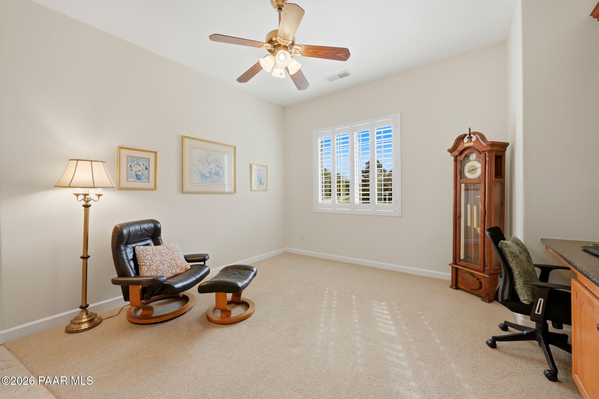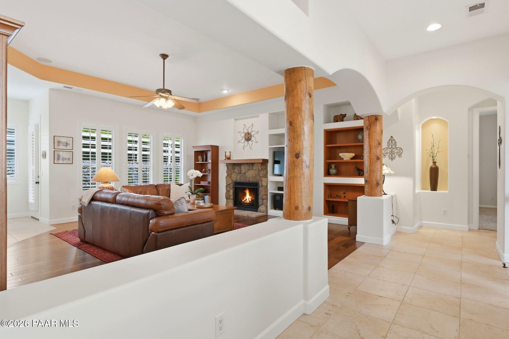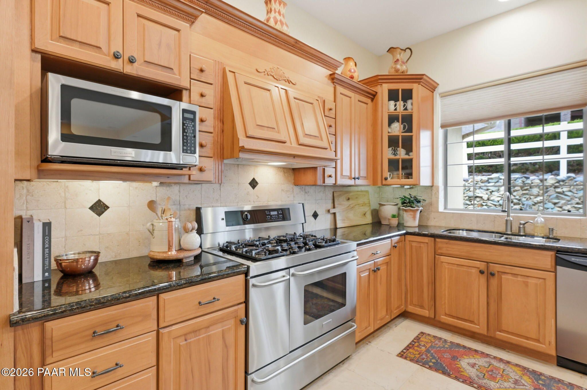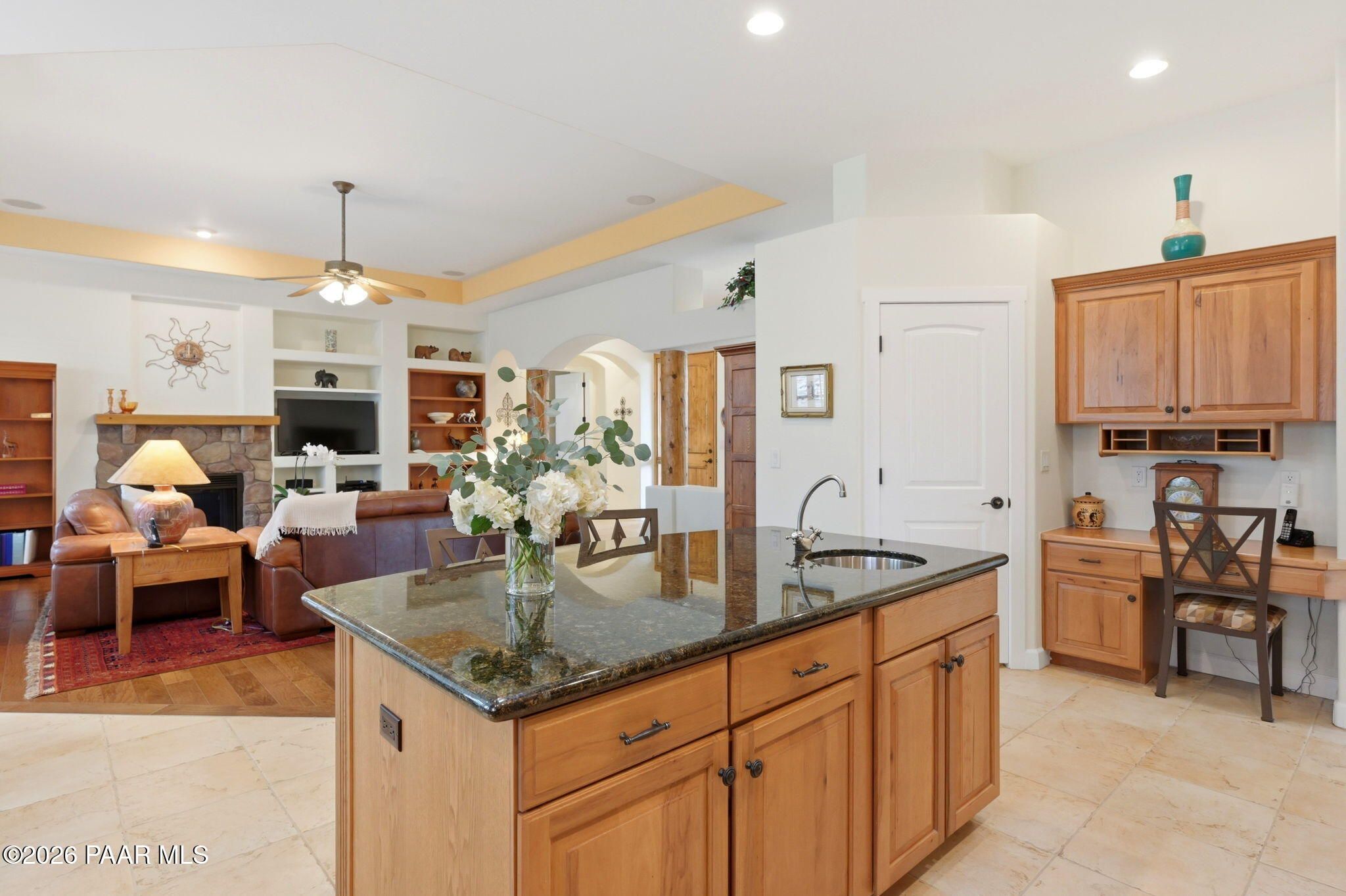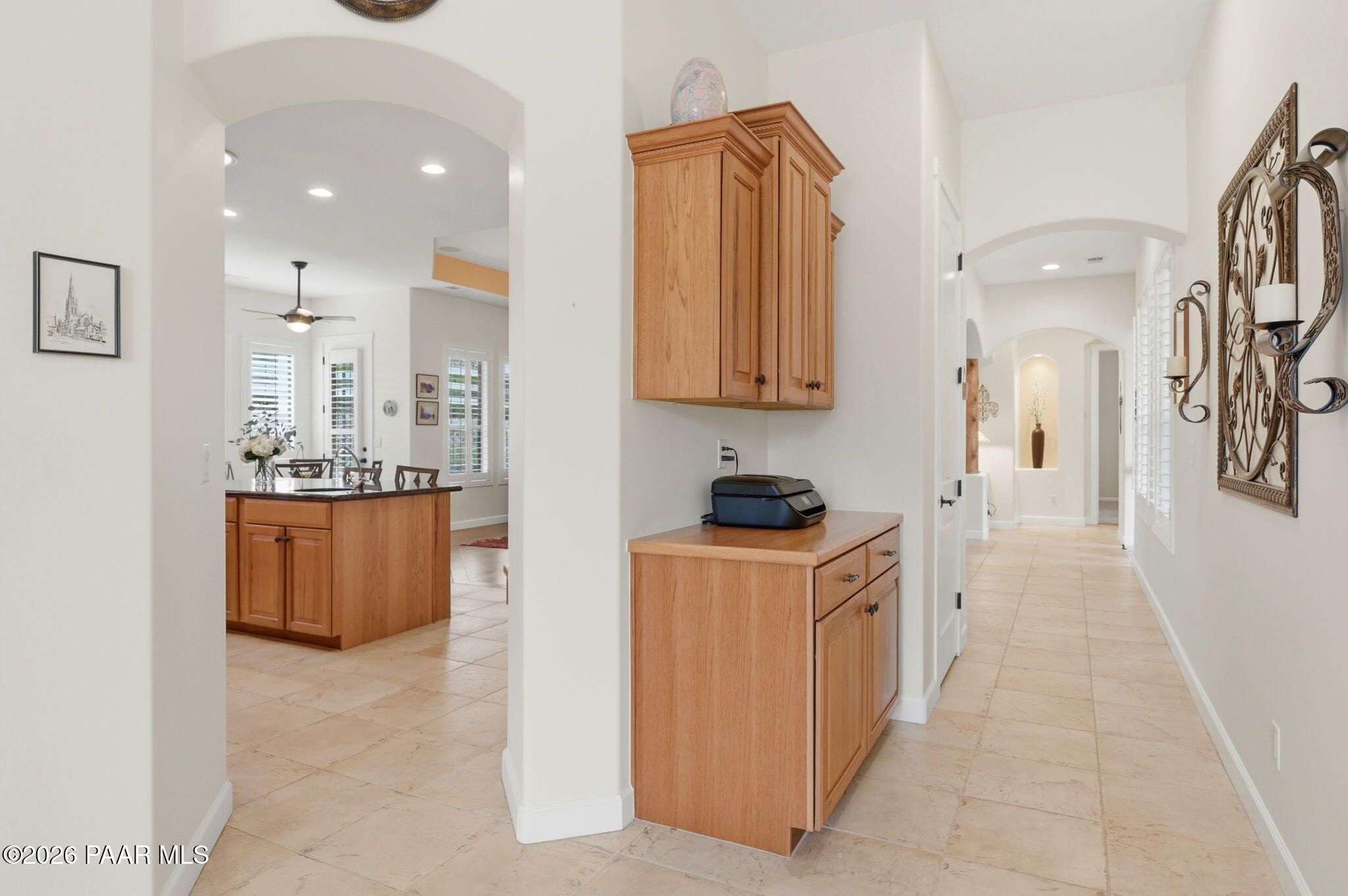 Welcome to an exceptional residence in the highly sought-after Stoney Creek of Prescott Lakes. This beautifully maintained home offers the perfect blend of comfort, quality and lifestyle, featuring 3 bedroom plus media room/office split floor plan and showcases thoughtful upgrades throughout. Enjoy a bright, open kitchen with granite counters, a large island, prep sink, rich hickory cabinetry, stainless steel appliances, and a professional 5-burner range. The spacious primary suite features private patio access, a spa-like bath with soaking tub, snail shower, dual vanities, and two walk in closets. Plantation shutters add timeless style and energy efficiency. Additional highlights include low-E windows, timeless hardwood floors, and open-concept living spaces create an inviting atmosphere perfect for gathering with family or hosting guests. Step outside to a meticulously landscaped yard with mature fruit trees and drip irrigation-perfect for relaxing or entertaining. Oversized 2-car garage with workshop space. Living in Stoney Creek within Prescott Lakes means enjoying access to a lifestyle that goes far beyond the home itself. Residents appreciate the proximity to a championship golf course, pickleball courts and a well appointed clubhouse that serves as a social hub for the community. Whether you are seeking an active lifestyle or a peaceful setting with scenic surroundings, this location offer the best of both worlds. WELCOME HOME!