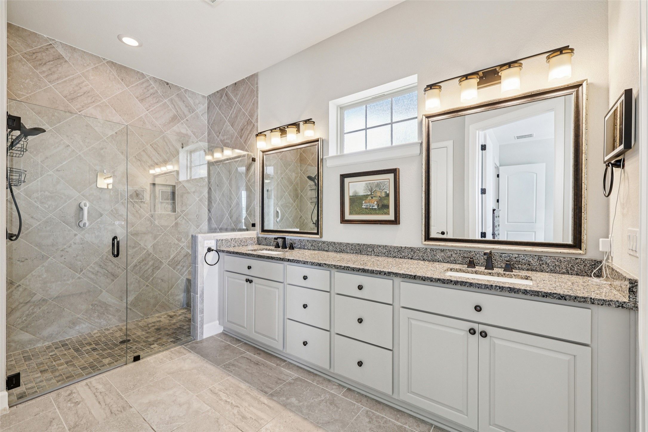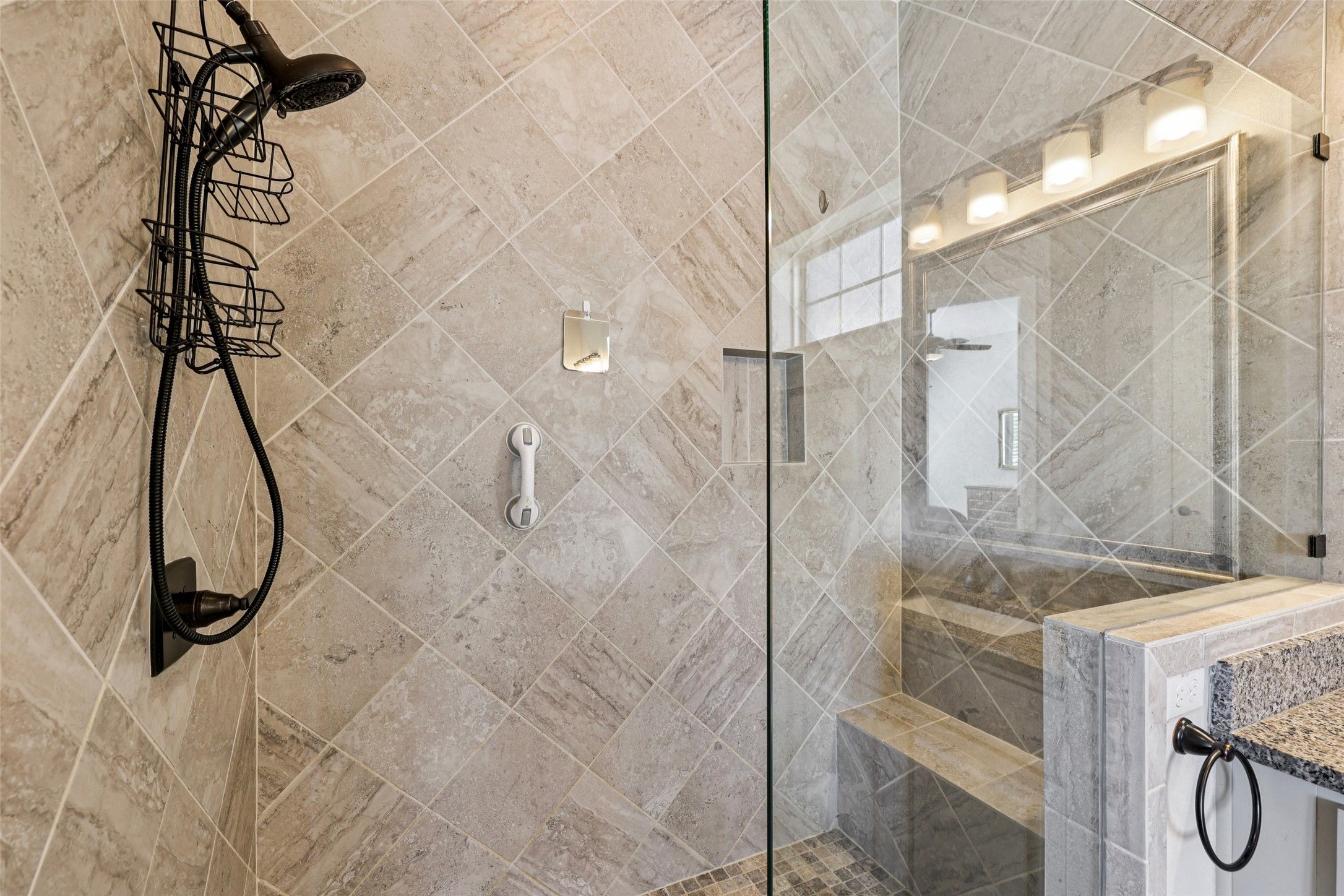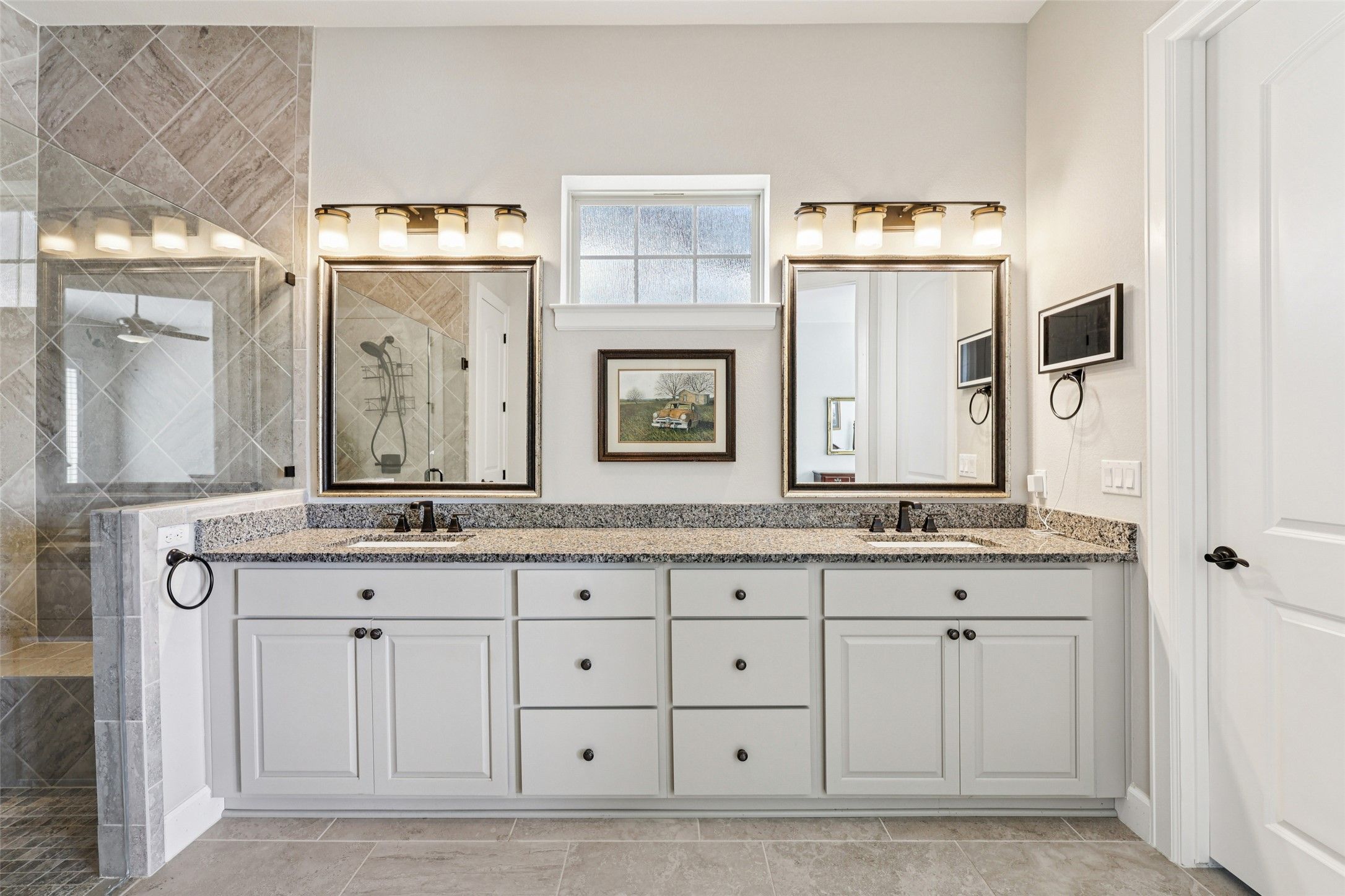 - Breakfast Bar, Ceiling Fan(s), Double Vanity, Granite Counters, High Ceilings, Kitchen Island, Main Level Primary, NoInteriorSteps, Open Floorplan, Pantry, Recessed Lighting, Walk-In Closet(s), Wired for Sound