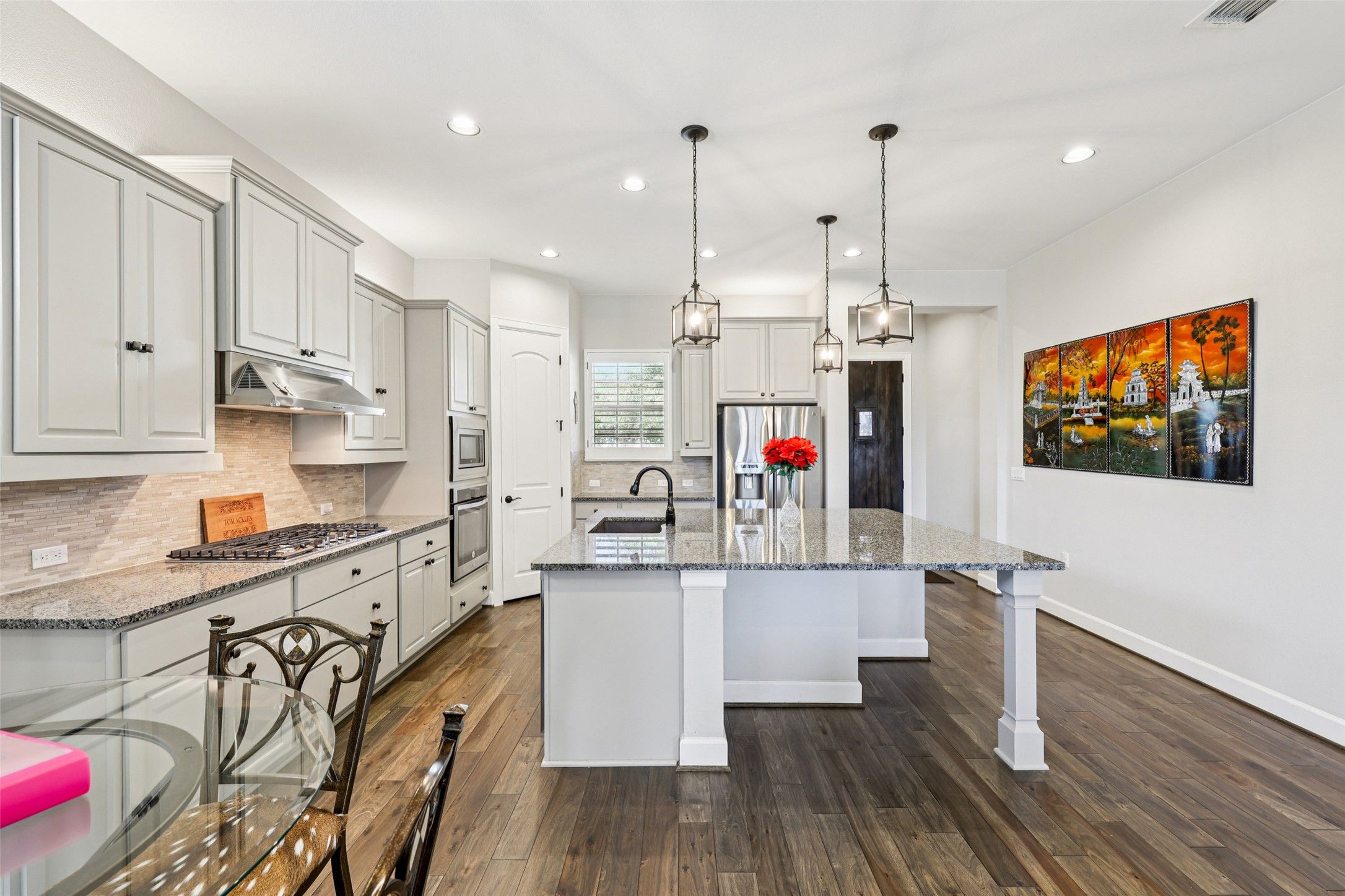 Welcome to your dream retirement in the vibrant, guarded, and gated 55+ community of Kissing Tree! This gorgeous corner-lot home makes a stately first impression with its four-sided brick facade, solid wood front door, and a welcoming front porch. Meticulously maintained and recently upgraded, the residence boasts a brand-new roof, a new garage door, a Culligan water softener, and a fully finished-out garage. Inside, you’ll find an open and airy layout featuring rich wood floors, elegant plantation shutters, and recessed lighting throughout. The chef-inspired kitchen is an entertainer’s delight, centered around an enormous island with bar seating and pendant lighting, complemented by stainless steel appliances, a built-in gas cooktop, built-in ovens, and a walk-in pantry. The primary suite serves as a true sanctuary, offering a wall of windows, a spacious walk-in closet, and a spa-like bathroom with dual vanities, granite countertops, and a stunning floor-to-ceiling tiled walk-in shower. Step outside to your private, fenced backyard or relax on the screened patio, which comes fully equipped with TV connections for effortless outdoor living. With a full sprinkler system for easy yard maintenance and world-class community perks—including a golf course, on-site dining, tennis and pickleball courts, bocce ball, shuffleboard, wine clubs, a state-of-the-art fitness center, indoor and outdoor pools, hot tub, live music nights, and a guarded, gated entrance—this home offers a lifestyle of unmatched comfort and activity. Take a tour today!